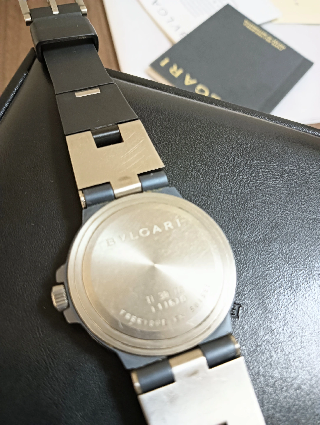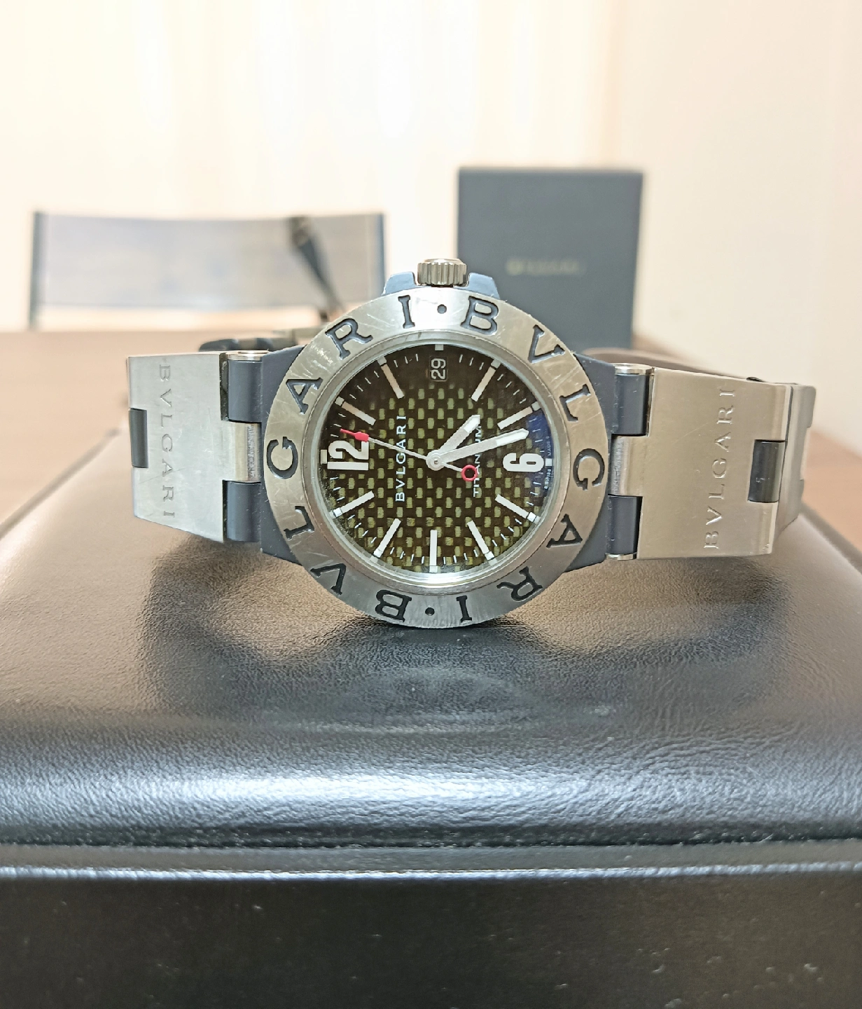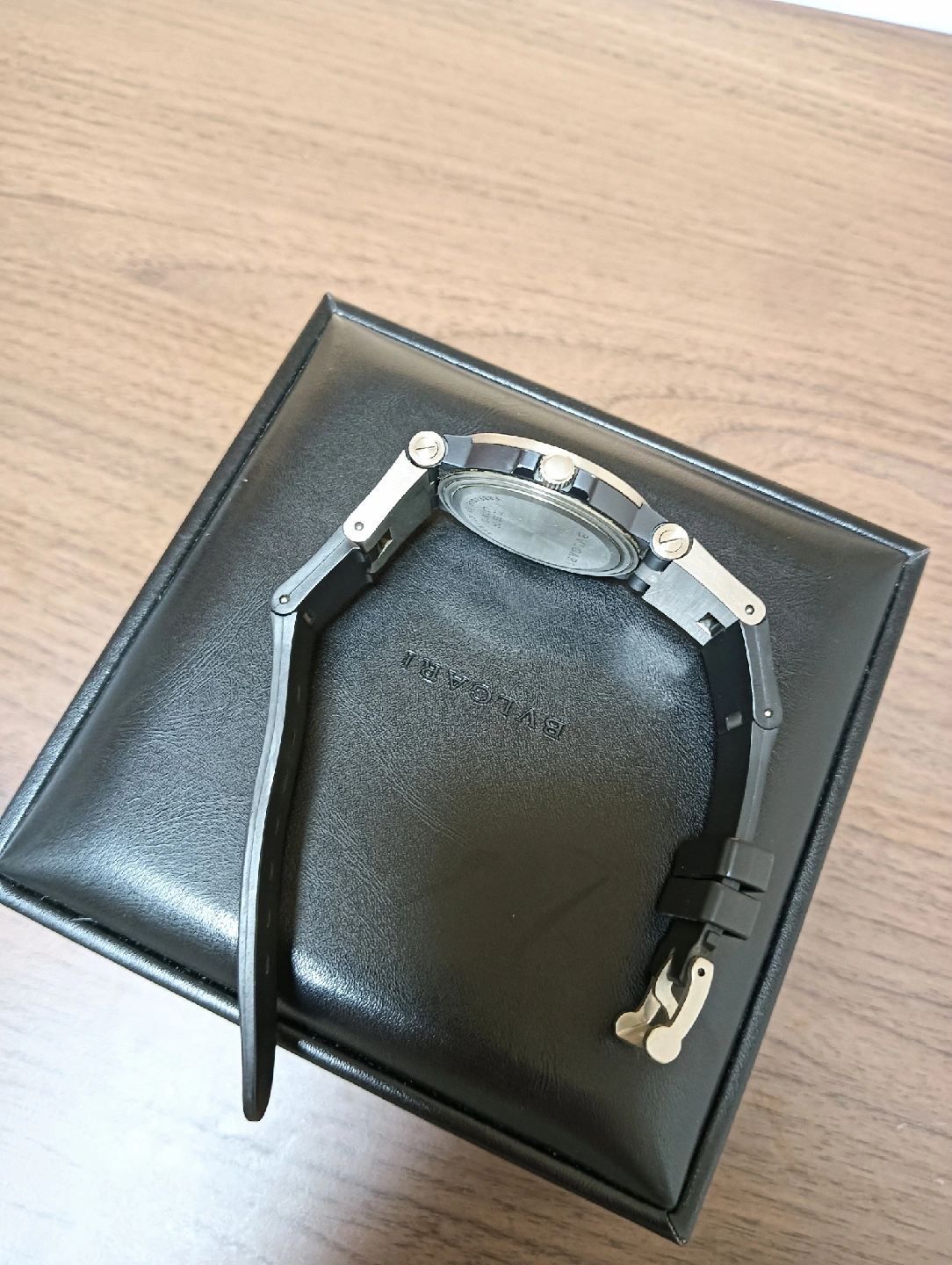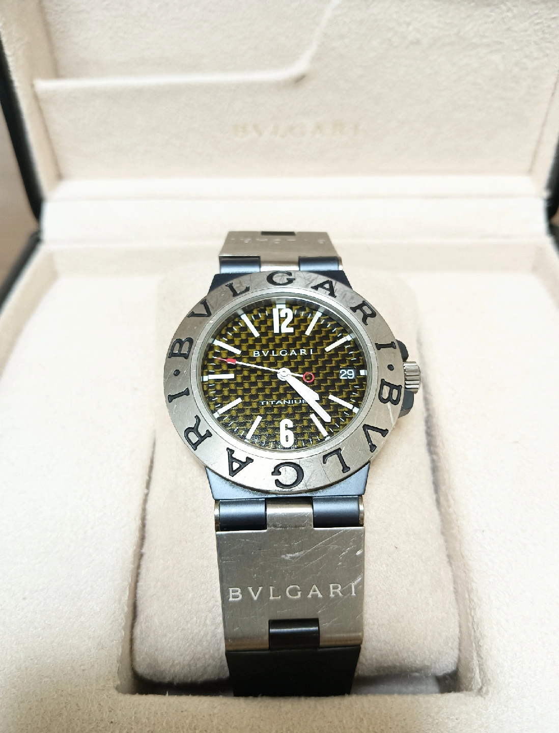 ★★ BVLGALI ブルガリ ディアゴノ チタニウム 腕時計 正確作動 日差±10秒程 型番 TI38BTA 販売価格 約407,000円 購入時の付属品全部付き。 ★★ ディアゴノの自動巻きオートマチックデイト38チタニウムシリーズです。 写真の通り全体的にも良い状態ですが、使用に伴うスレは感じるのでご容赦。 ★注意★ シッカリ閉まってますが、右側下ののラグピン部分の台座が一つ損失してます。 モチロン普通にベルトが取れたりせずに使用は出来てます。 ★★ 腕周り フリー color シルバー&ブラック 購入時の付属品は全部有ります。 正規箱、ケース、国際保証書、冊子等付き。 ★★ BVLGARIのDIAGONO TITANIUMは、チタン製の軽量で耐久性に優れた腕時計です。 - ブランド: BVLGARI - モデル: DIAGONO TITANIUM - 色: ブラック - 素材: チタン - 特長: 自動巻き 日付表示機能 - 付属品: 箱、説明書 - 価格: 407,000円