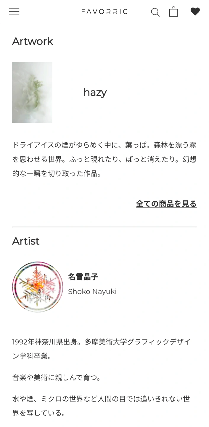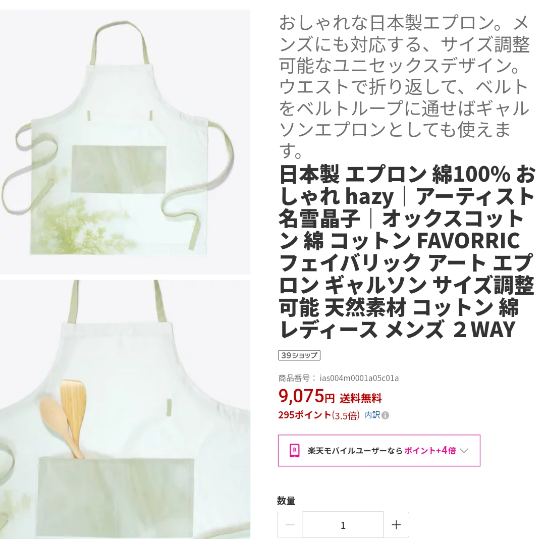 日本製 エプロン おしゃれ アーティスト 名雪晶子 オックスコットン 綿100% コットン FAVORRIC フェイバリック アート サイズ調整可能 レディース メンズ 2WAY 定価9,075円 商品ページ:https://favorric.com/products/ias004m0001a05c01a アーティストの名雪晶子さんが描かれた「hazy」というアートワークが素敵なエプロンです。 1万円予算のプレゼント特集というFAVORRICのサイトで購入したのですが、忘れて渡しそびれてしまったものを未使用で保管していました。ほぼ新品の美品です。 ●商品説明 毎日の料理に欠かせないエプロンが新登場。個性豊かなアーティストの作品がキッチン周りを華やかに彩ります。 首元の紐と腰紐が繋がっているサイズ調整可能なデザイン。 フロントにある2つのポケットは、スマホもしっかり入る大きさで使い勝手抜群です。 首元にはフックにも掛けられるブランドタグが付いていて、さっと吊り下げることも出来ます。 ウエストで折り返して、ベルトをベルトループに通すことでギャルソンエプロンとしても使える2WAYデザイン。 ●「hazy」とは… ドライアイスの煙がゆらめく中に、葉っぱ。森林を漂う霧を思わせる世界。ふっと現れたり、ぱっと消えたり。幻想的な一瞬を切り取った作品。 ●名雪晶子 Shoko Nayuki 1992年神奈川県出身。多摩美術大学グラフィックデザイン学科卒業。 水や煙、ミクロの世界など人間の目では追いきれない世界を写している。 2021年に自身初の写真集を出版、同年4月には富士フイルムフォトサロン東京にて初個展を開催。 ●FAVORRIC(フェイバリック) 「アートと暮らす。」をコンセプトに、国内外で活躍する写真家やペインティングアーティストの作品でデザインされた、オリジナルのインテリア雑貨を販売しています。日本各地の高品質な生地と伝統技術を活かして、1点1点丁寧に商品化しています。 サイズ: 身頃(約)H84×W77cm 紐(約)332cm 素材:コットン100% 洗濯:可、手洗い 原産国:日本 ハンドメイド、Etsy、Creema、ZARA HOME、HAY好きにも♡