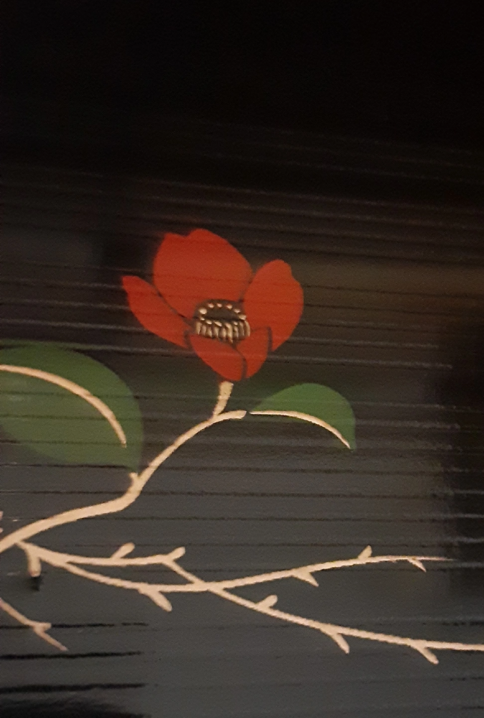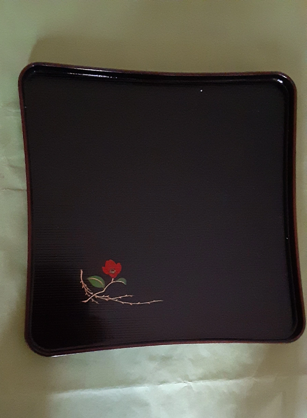 赤い椿に、金色の花芯や枝が、端正に、可愛いく描かれています。 白っぽく見える部分は、光の反射の性です。本当は、黒です。 軽くて、裏は木目が塗りの奥に見えますので、ブラスチックではないと思います。 実物をよくご覧になって納得されたらお願いします。無理強いはしません。バス23系「萱場公園入口」近です。