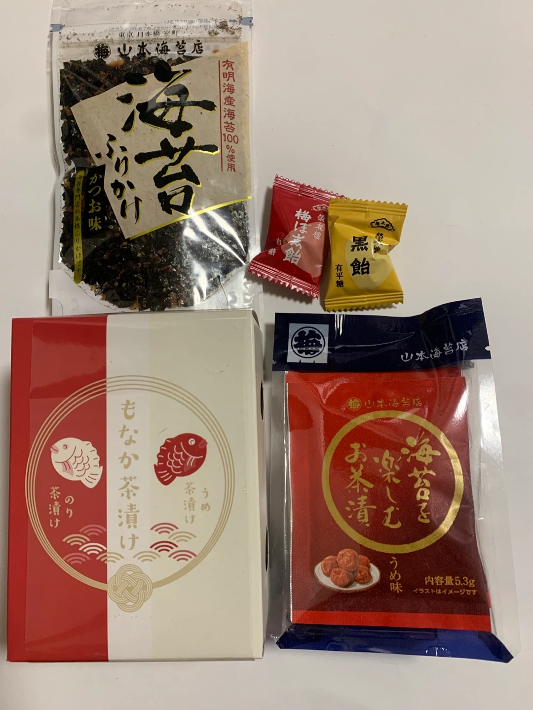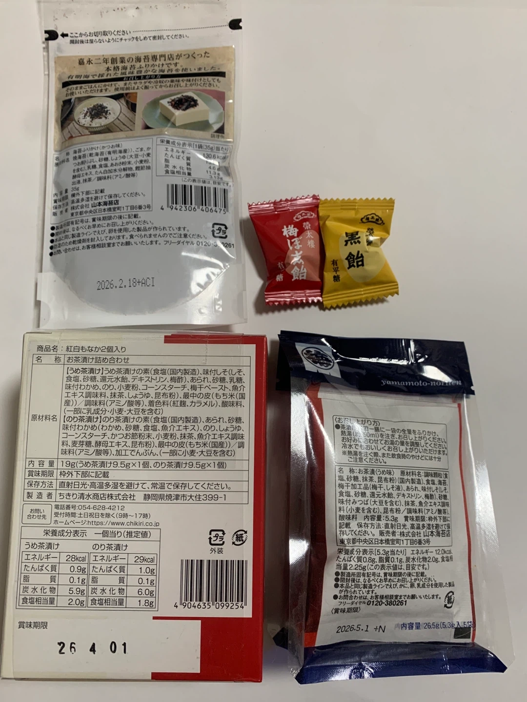 山本海苔店のお茶漬けと海苔ふりかけ、 ちきり清水商店の紅白もなか茶漬けです 榮太郎の飴2つはおまけです 【状態】 新品未開封 賞味期限:2026年 自宅保管品であることをご了承いただける方に。