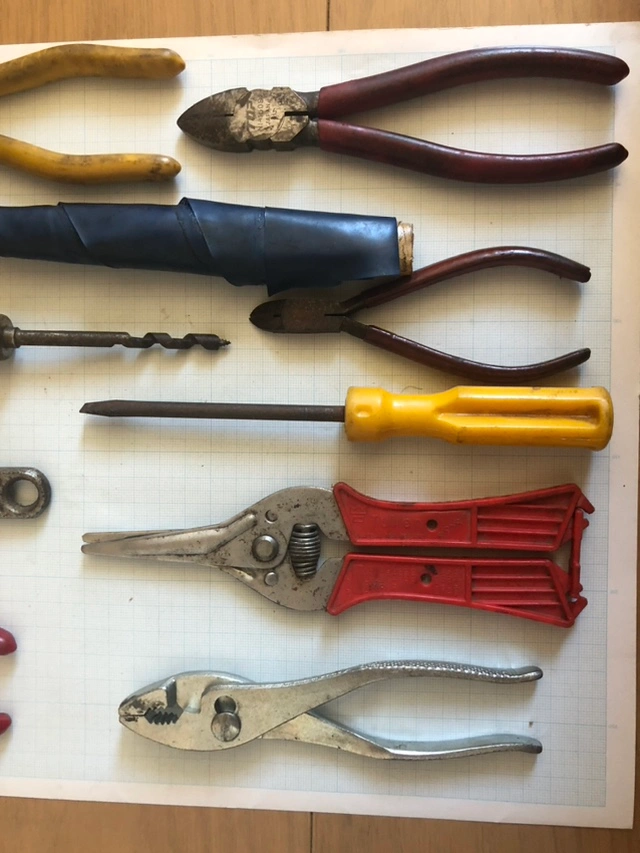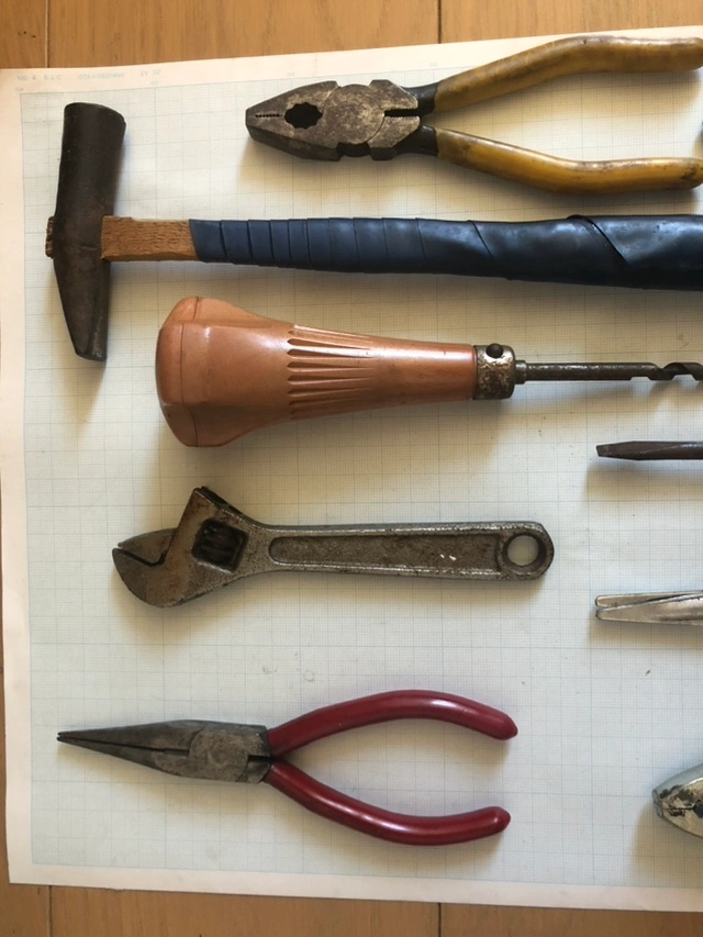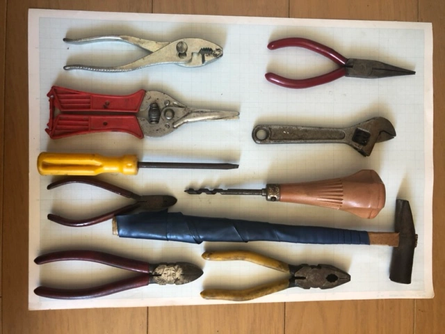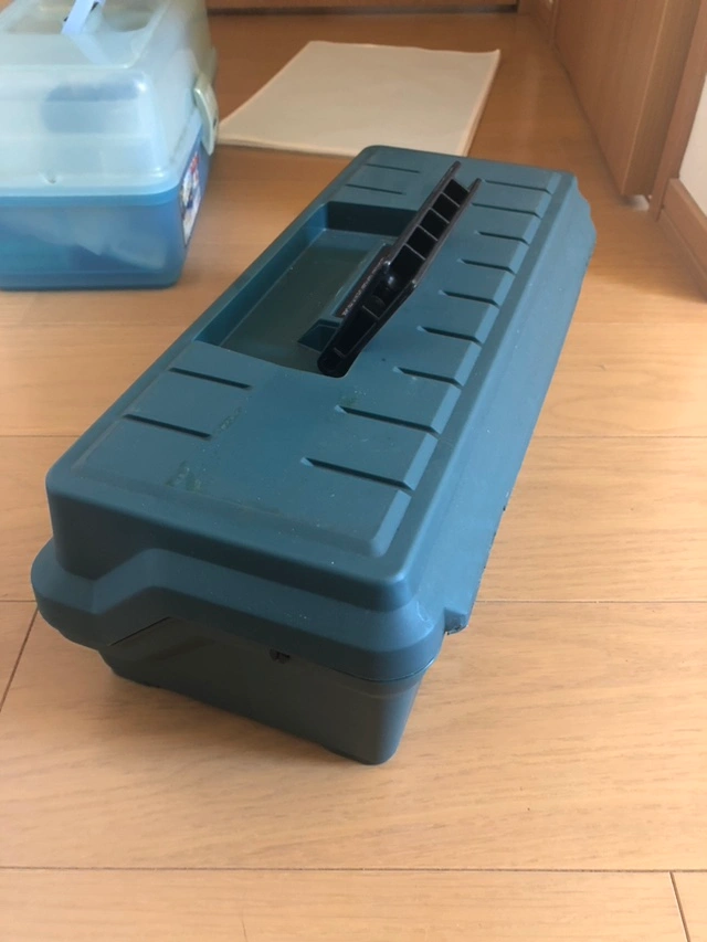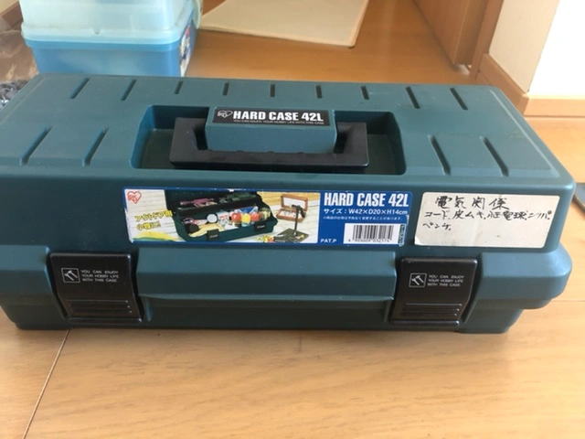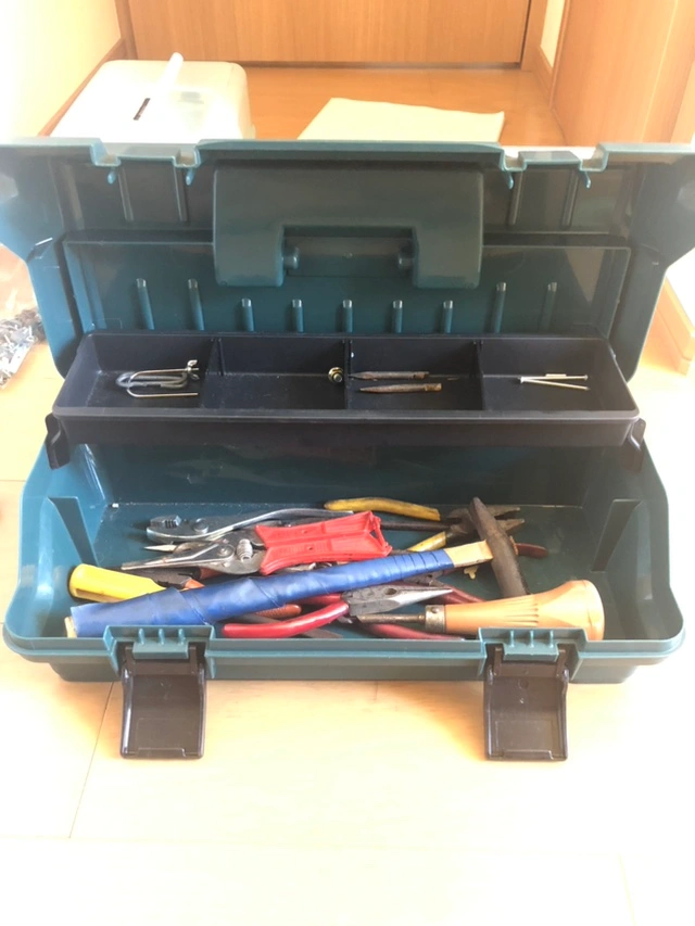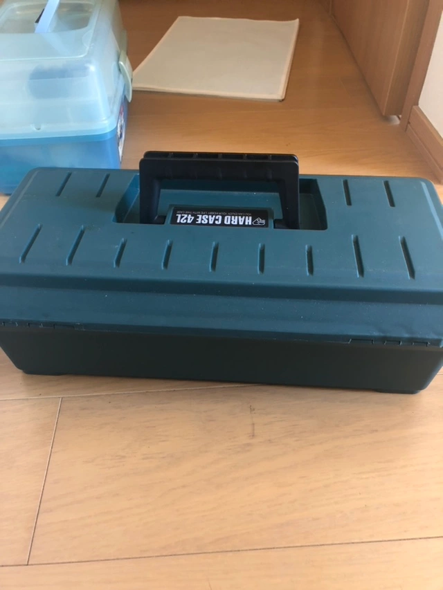 あたたかさ工具箱と中の工具 アイリスオーヤマ 工具箱はほぼ新品です ダークグリーン W42×D20×H14センチ フライヤー 万能カッター ドライバー ニッパ 2種 ラジオペンチ スパナ キリ 玄能 ペンチも付きます 工具箱はほぼ新品です 写真に写る全て 使用済みをご理解頂