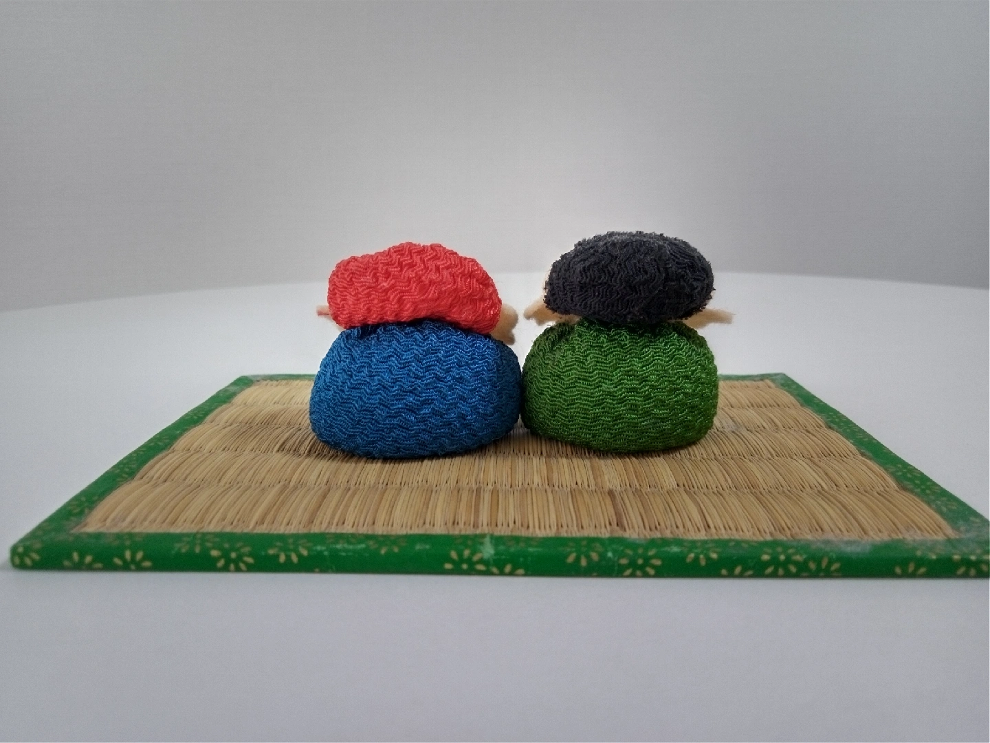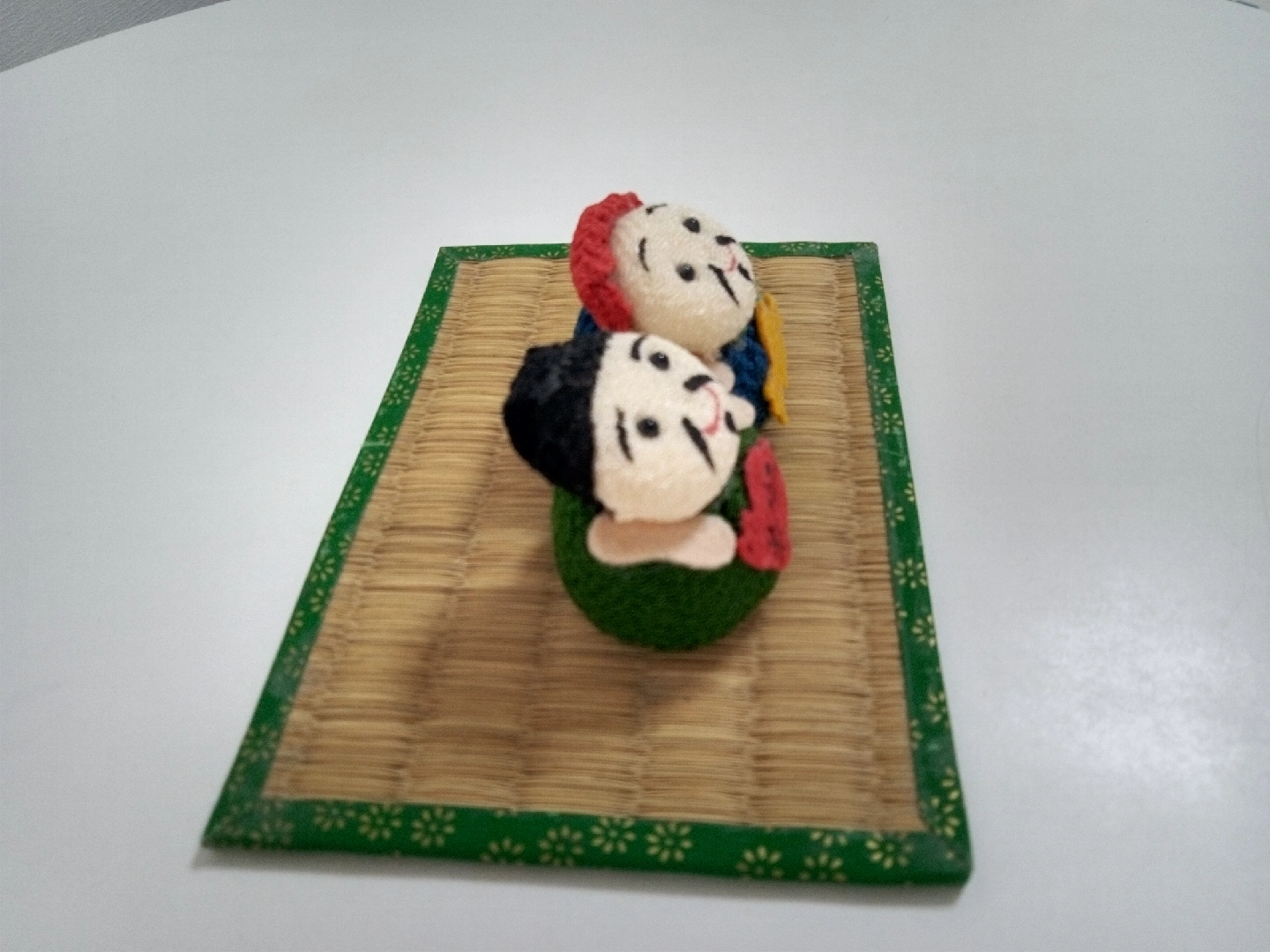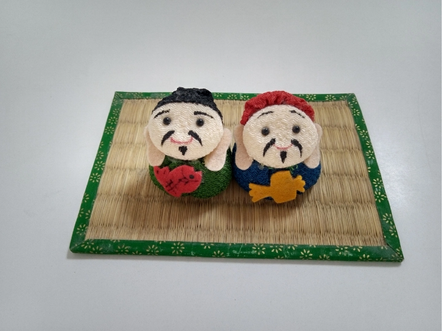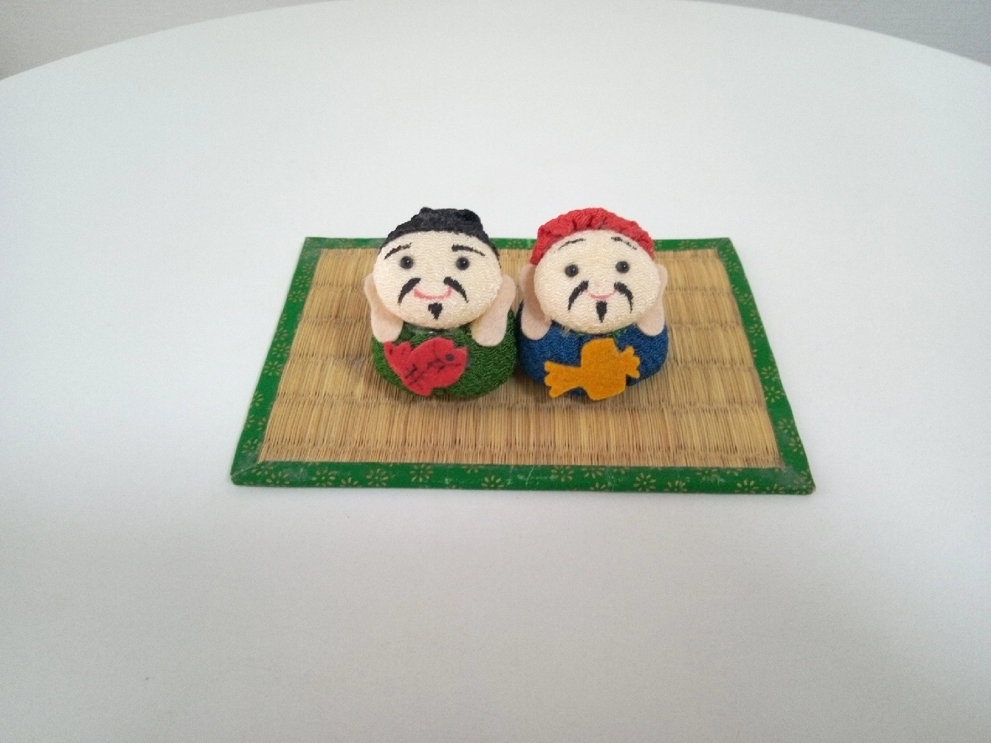 恵比寿さまと大黒さまの置物。 畳み付き。 ・2個セット ・手作りのような風合いです。 ちりめん生地、 お手玉の様な感じです。 人形:3 × 3 × 4 ( 高さ ) 畳み: 13 × 9 センチ 中古品であることご了承ください。