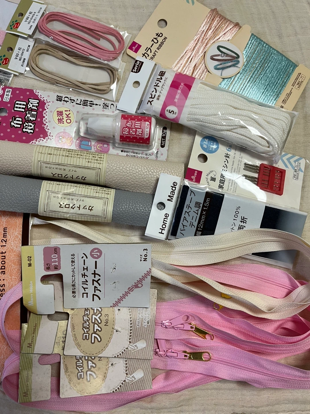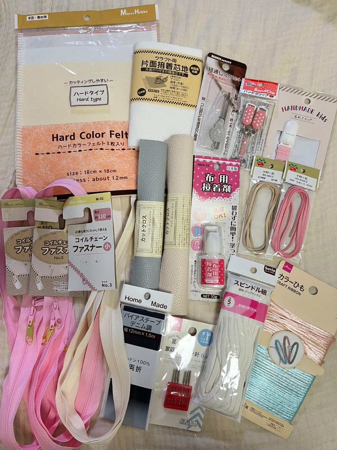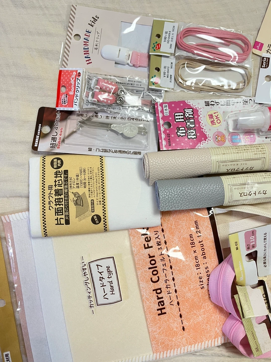 手芸用品のまとめ売りです カラー紐(ピンク少し使用) スピンドル紐 デニム調バイアステープ コイルチェーンファスナー×3 カットクロス×2 クラフト用片面接着芯 家庭用ミシン針 布用接着剤 合成紐×2 紐通し バンドクリップ 名札クリップ(1つ使用) フェルト ほとんど未使用品です