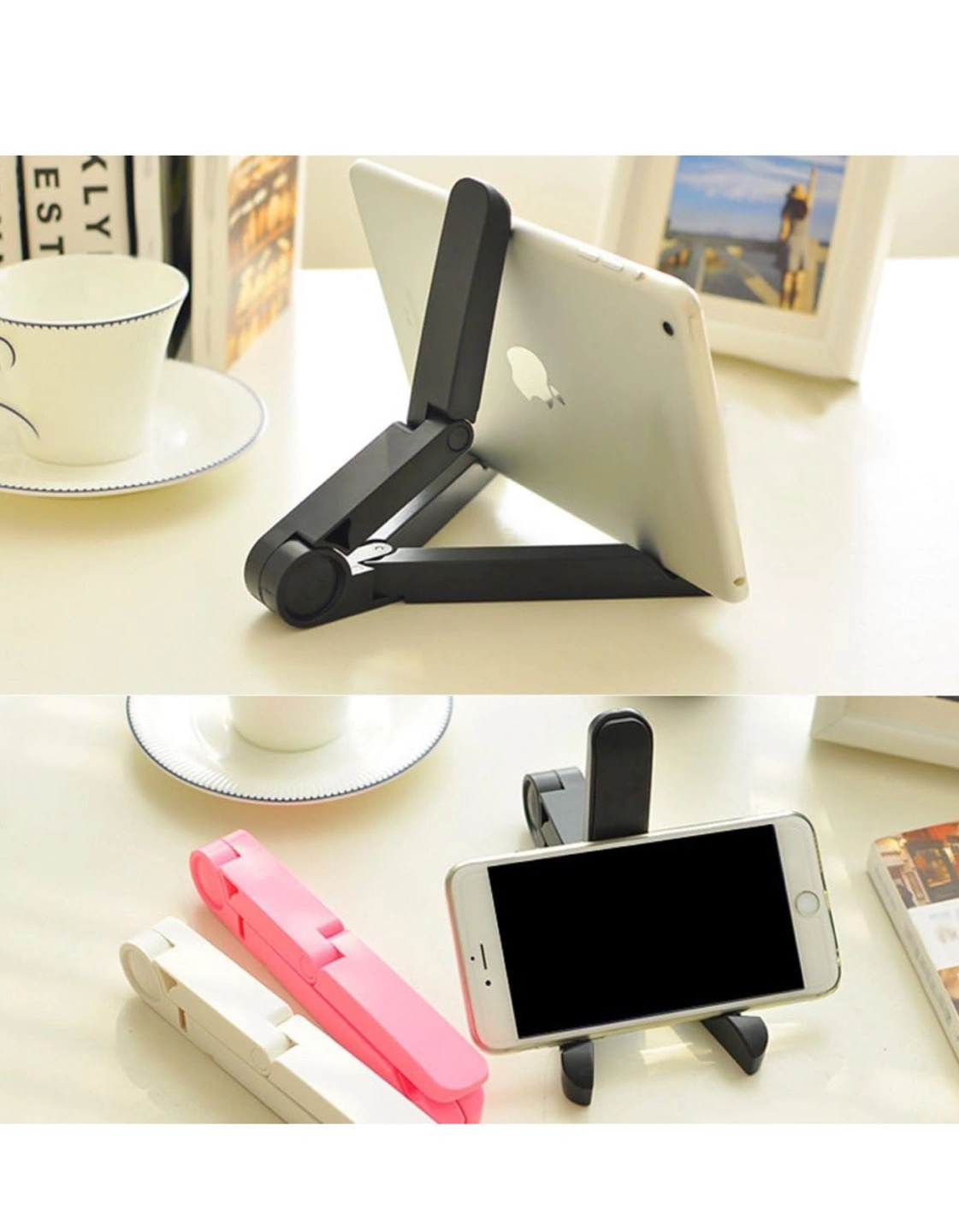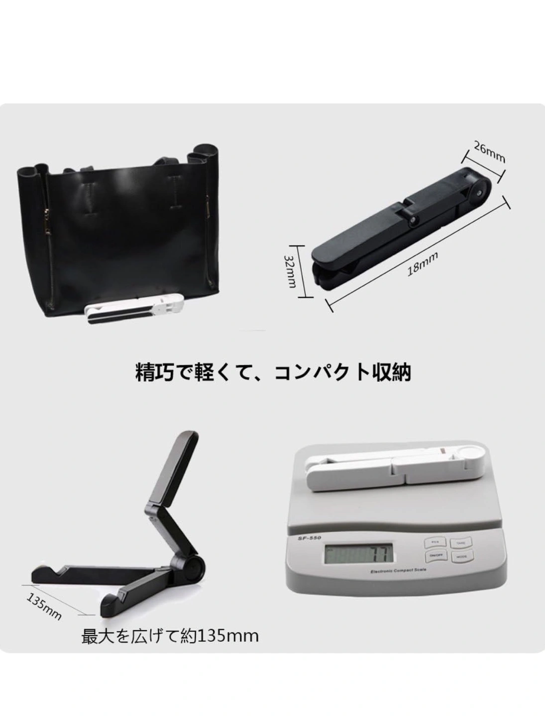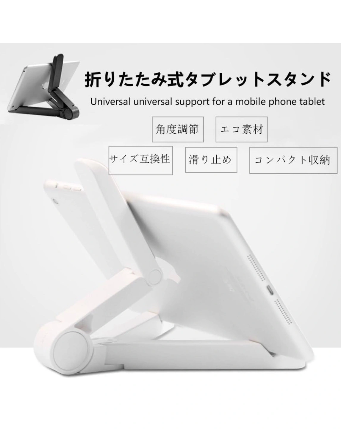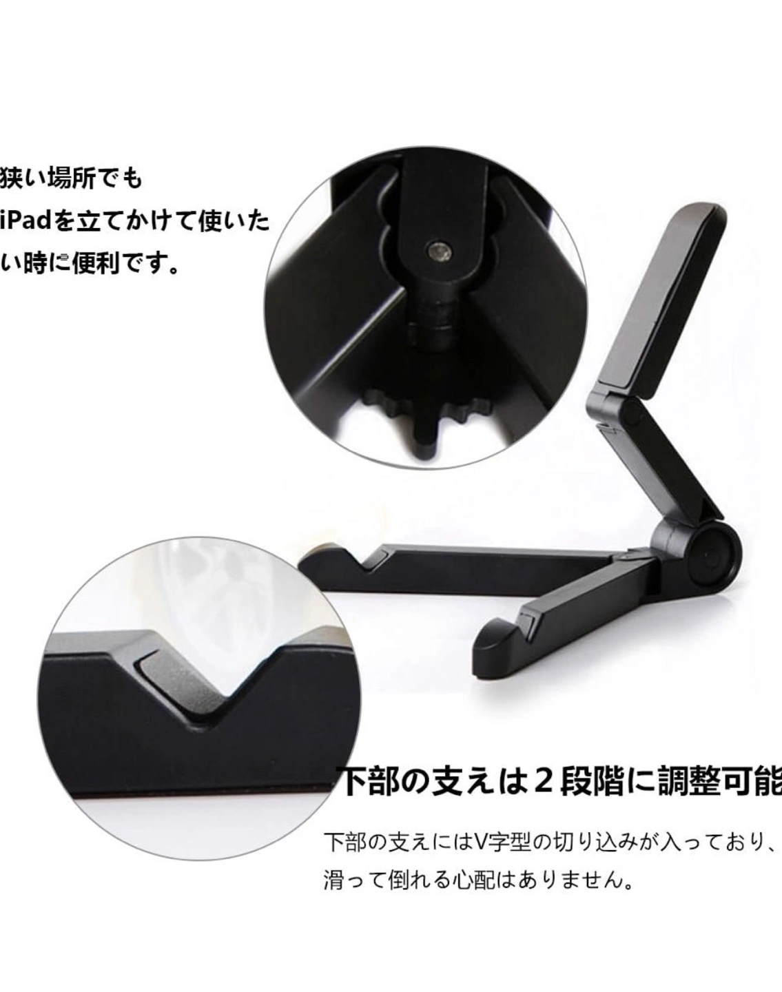 7~11インチiPadやタブレットPC、スマートフォンなどに対応する折り畳み式スタンドです。 重さ約77g、 折り畳むことで18cm x 2.6cmx 3.2cmと非常にコンパクトに収納できます。 スタンドに立てかける事により、両手がフリーになるので、iPadで映像・WEB・読書も楽しめます。 本を読んだりネットサーフィンを楽しんだり、映画を鑑賞するためにデバイスを任意の角度に固定できます。 下部の支えは2段階に調整可能です。 狭く開けばスマホ用として、広く開けばタブレット用としてお使いいただけます。 折れ曲がる各部位は、カチッと固定される使用かんで、数段階に調整可能です。 材料:ABSプラスチック、角度の調整が自由にできるので、iPadやタブレットPCの縦置き・横置きはもちろんのこと。スマホの縦置き・横置きにも対応しています。下部の支えにはV字型の切り込みが入っており、滑って倒れる心配はありません。 ちなみに雑誌なども立てかけれます。