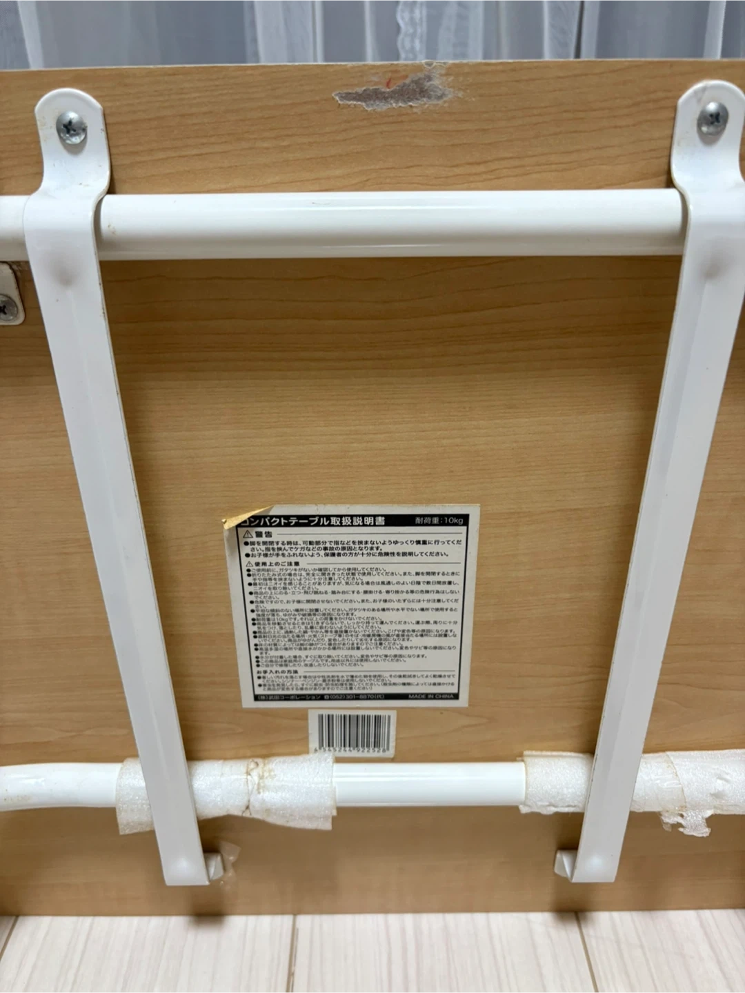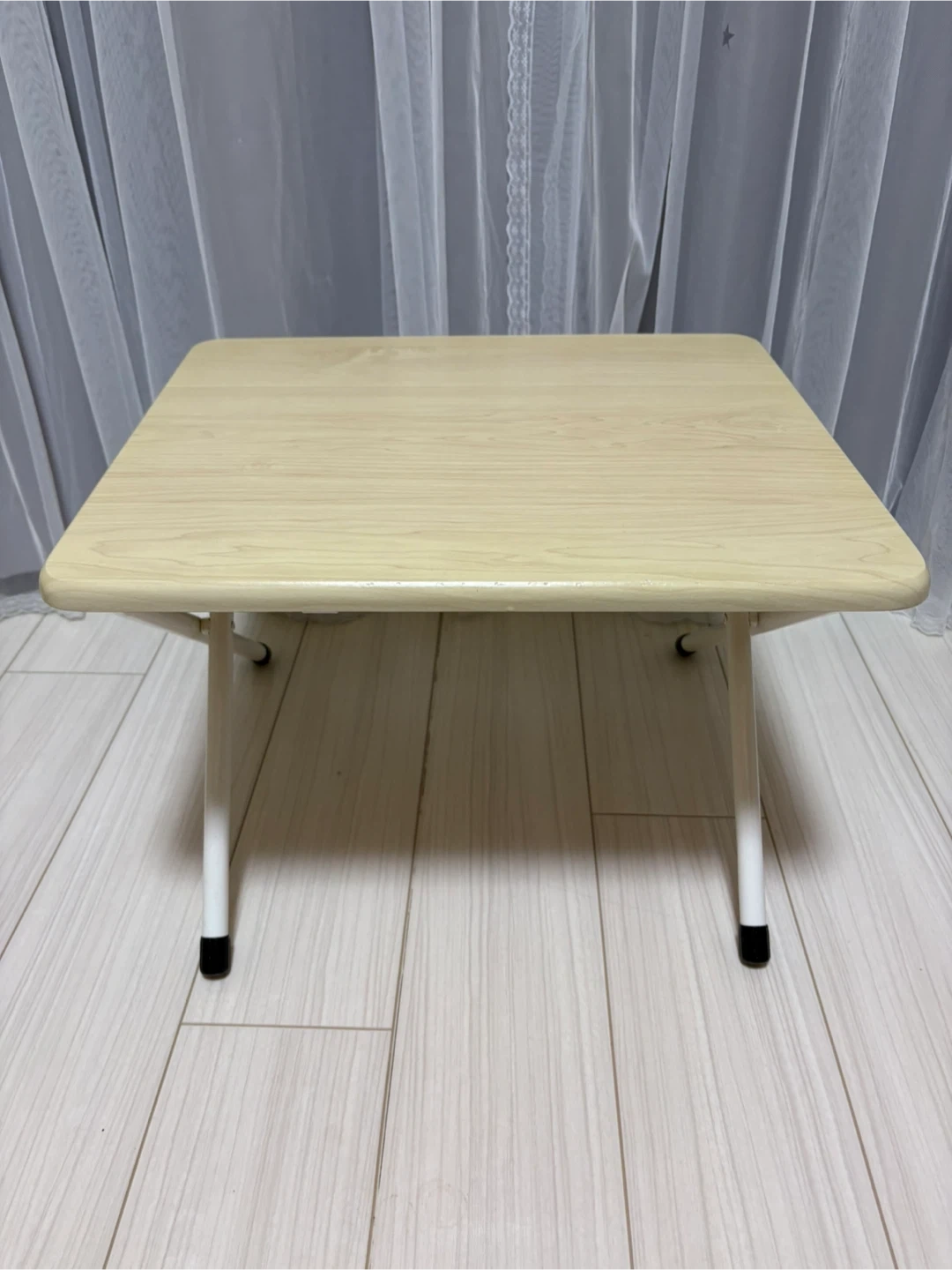 折りたたみミニテーブルです サイズは自分で測りました ・カラー:ベージュ、ホワイト(脚) ・天板に傷、汚れあり ・脚に赤いステッカーあり ・取扱説明書あり ・耐荷重10kg 中古品であることご了承ください 受け渡しは土日のみです