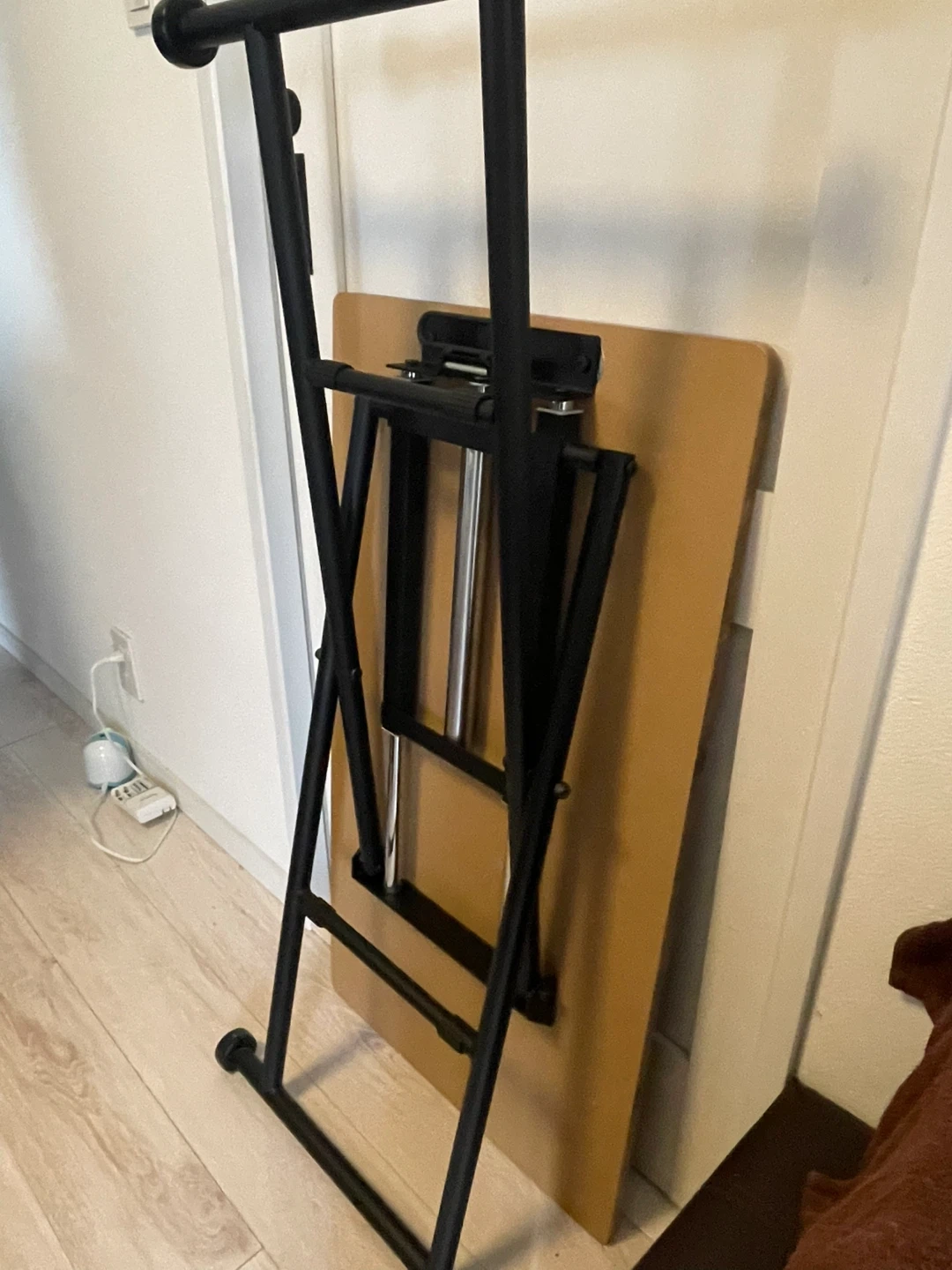 折りたたみテーブルです。 ・色:木目調、黒 ・折りたたみ可能 ・使用感は少なめ サイズ:幅48㌢×長さ90㌢(折り畳み時114㌢)×高さ10〜70 数年間使用し、その後は自室で保管しておりました。 特に破損箇所等はなく使用に問題はありません。 中古品であるということをご了承の上、ご購入く ださい。 ご不明点等ございましたらご連絡ください。 *子供がいる為、受け渡し可能な時間帯は午後になります。(大体13時〜19時の間) *世田谷区の若林駅前での取引を希望しております。 中古品であるということをご了承の上、ご購入ください。 ご不明点等ございましたらご連絡ください。