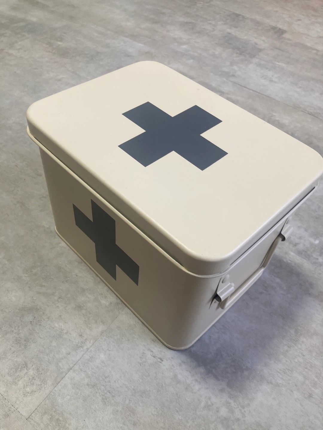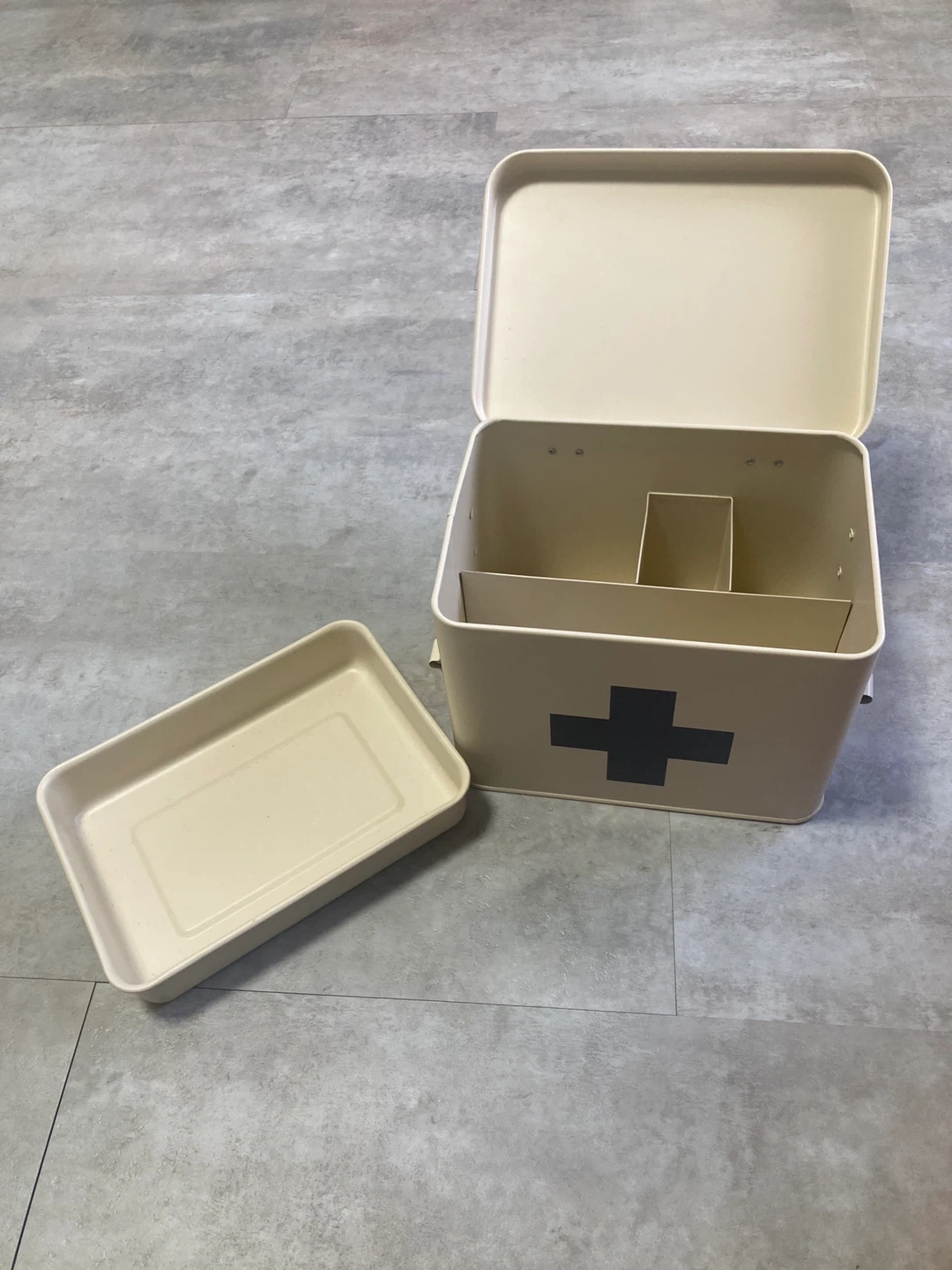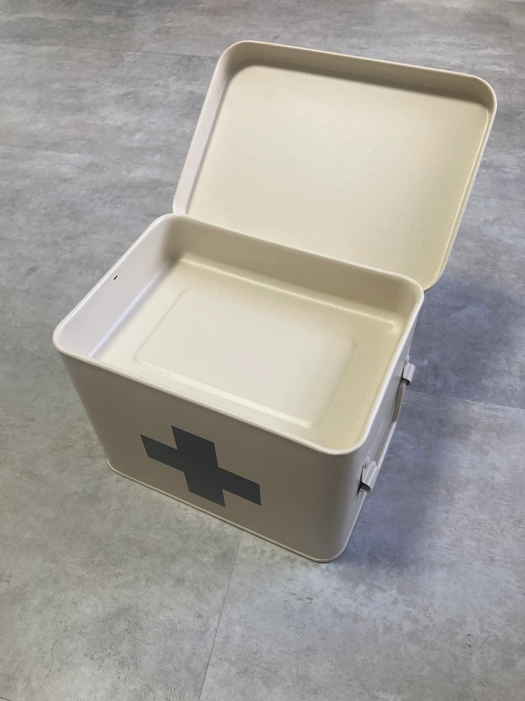 おしゃれなブリキ製の薬箱です。 ベージュにダークグレークロスマークがアクセントになっていて、 ナチュラルインテリアや北欧テイストのお部屋にもぴったり✨ 仕切り付きで、絆創膏・常備薬・体温計などをスッキリ収納できます。 しっかりした作りで防災グッズ入れにもおすすめです。 サイズ(約):幅22cm × 奥行16cm × 高さ15.8cm 素材:ブリキ(スチール製) 状態:目立った傷や汚れなし ※自宅保管品のため、ご理解のある方のみお願いします。 ※直接引き取りのみ対応