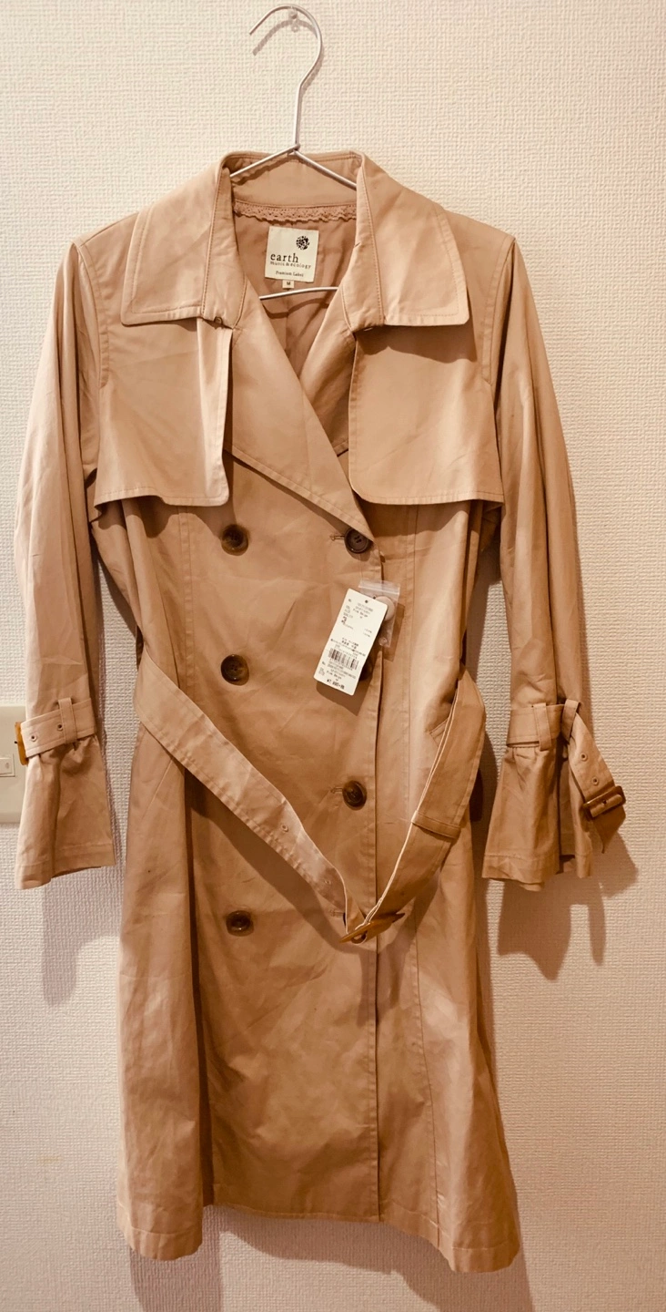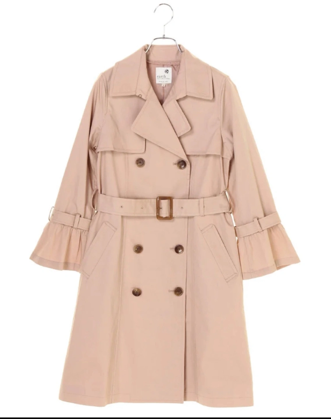 新品未使用 定価8789円 アースミュージックアンドエコロジー earth music&ecology フレアースリーブトレンチコート トレンド感溢れるフレアースリーブデザインを取り入れたトレンチコートです。 軽いタッチの綿ツイル素材を使用し、滑らかな肌触りも魅力。 裾にかけて少し広がったAラインシルエットは洗練フェミニンな印象をプラス。 シンプルながらもディテールにこだわったアイテムは、スカートスタイルやワンピースとのコーデもおすすめです。 【サイズ】 M:バスト102cm 着丈98cm 袖丈56cm 肩幅38cm 裾幅70cm 色: Pink Beige(198) 素材: 表地:綿100%裏地:ポリエステル100%