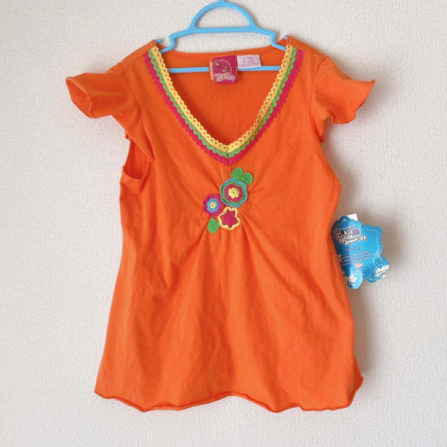 あたたかさアメリカで買ったオレンジが鮮やかなカットソーです キッズサイズですが、大人が着るように買ってきたので、大きなお子様はもちろん、小柄な大人の方も着用できると思います。 夏にピッタリの袖のフリルもフロントの お花もカラフルなステッチもかわいいです✧ なかなか着る機会がないので出品します。 新品未使用タグ付きですが 個人保管なので、神経質な方はご確認の上、お願い致します☺︎ タバコは吸いません