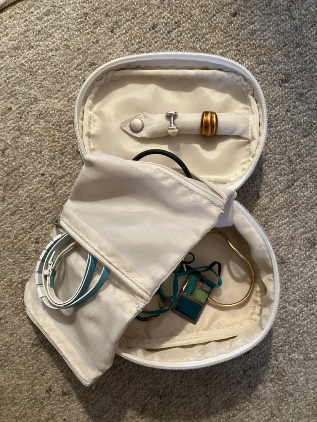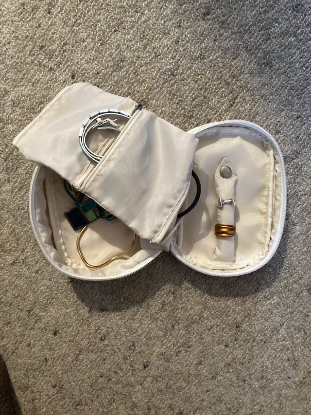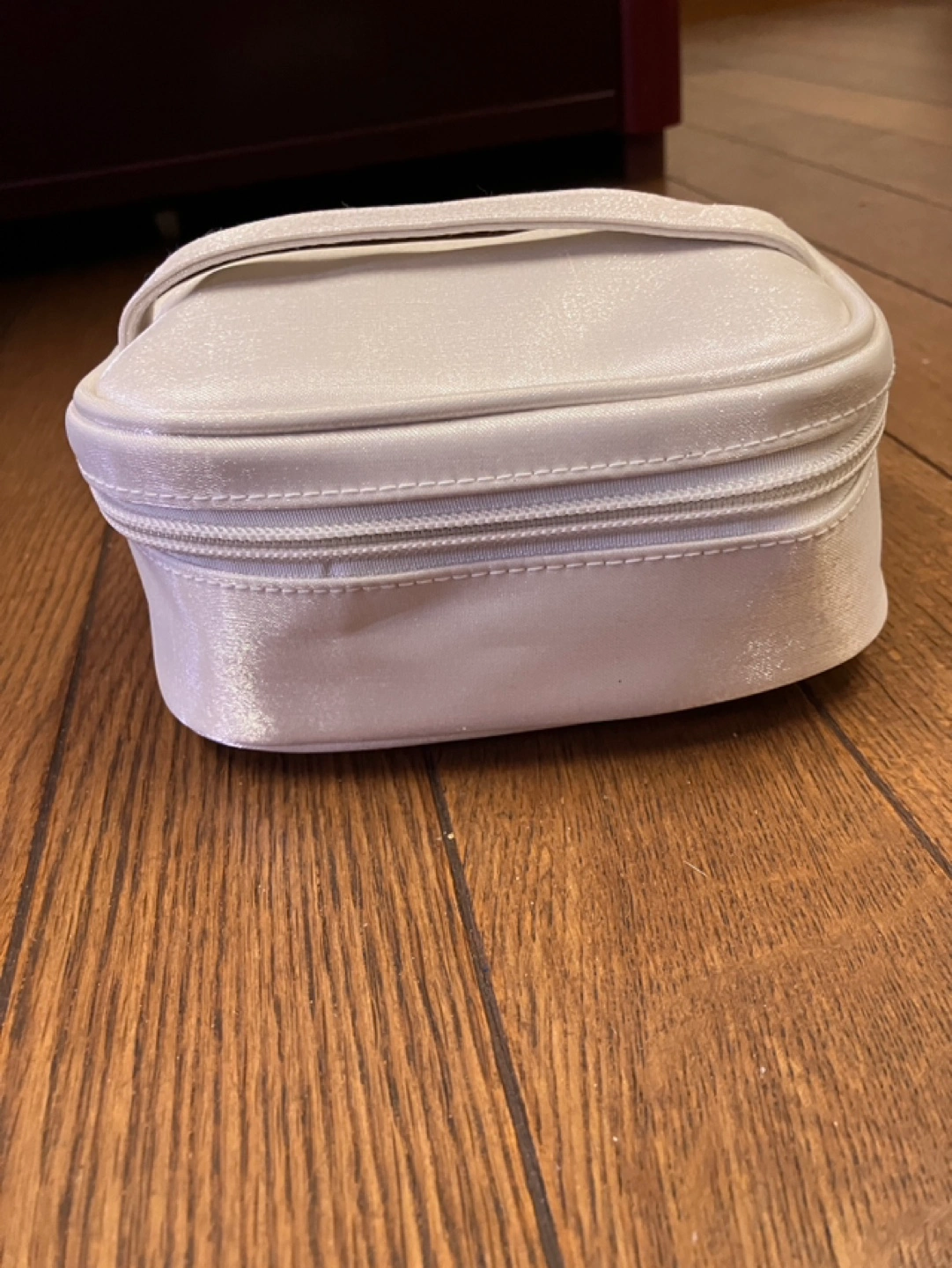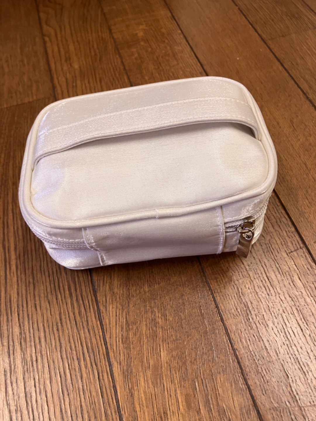 新品未使用 オフホワイトの光沢のあるジュエリーボックス サイズは、15センチ✖️10センチ 高さ7センチ(素人採寸)の大きめなので、長期トラベルのお供にもなります 持ち運び便利な手提げタイプ 同じものを、現在使っており、写真はそちらで撮っています コーティングされている素材なので、汚れにくく、持ち運びに重宝しています お渡しするのは、新品のものです リングはリング留めに、 ブレスレッドやネックレスなどは1つづつ入れられるので、 傷も付きにくく、気に入っています 底も広いので、太さのあるや長いネックレスもなども大丈夫👌 自宅保管のため、多少新品の畳みクセがあります