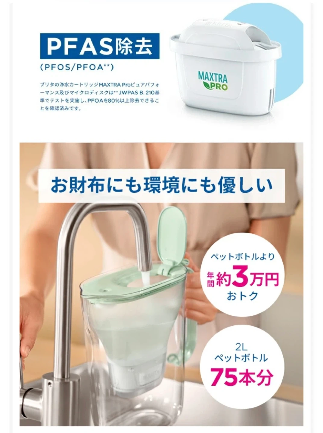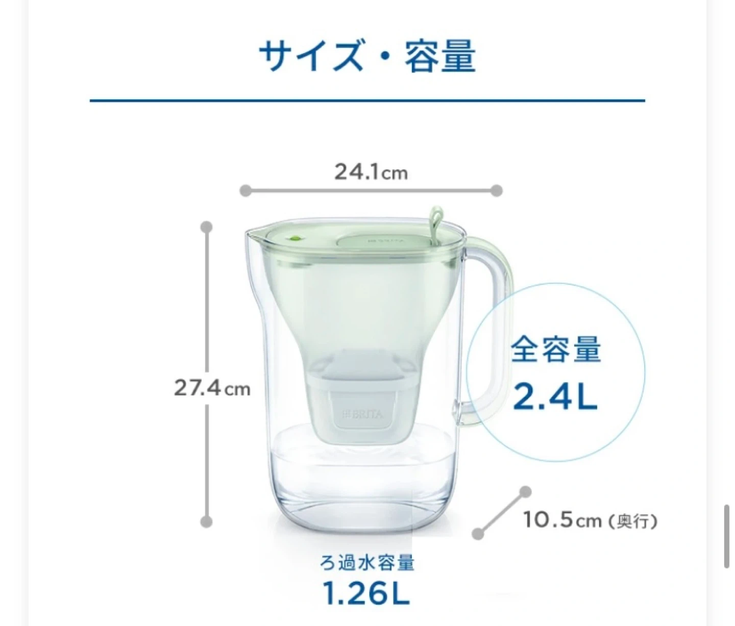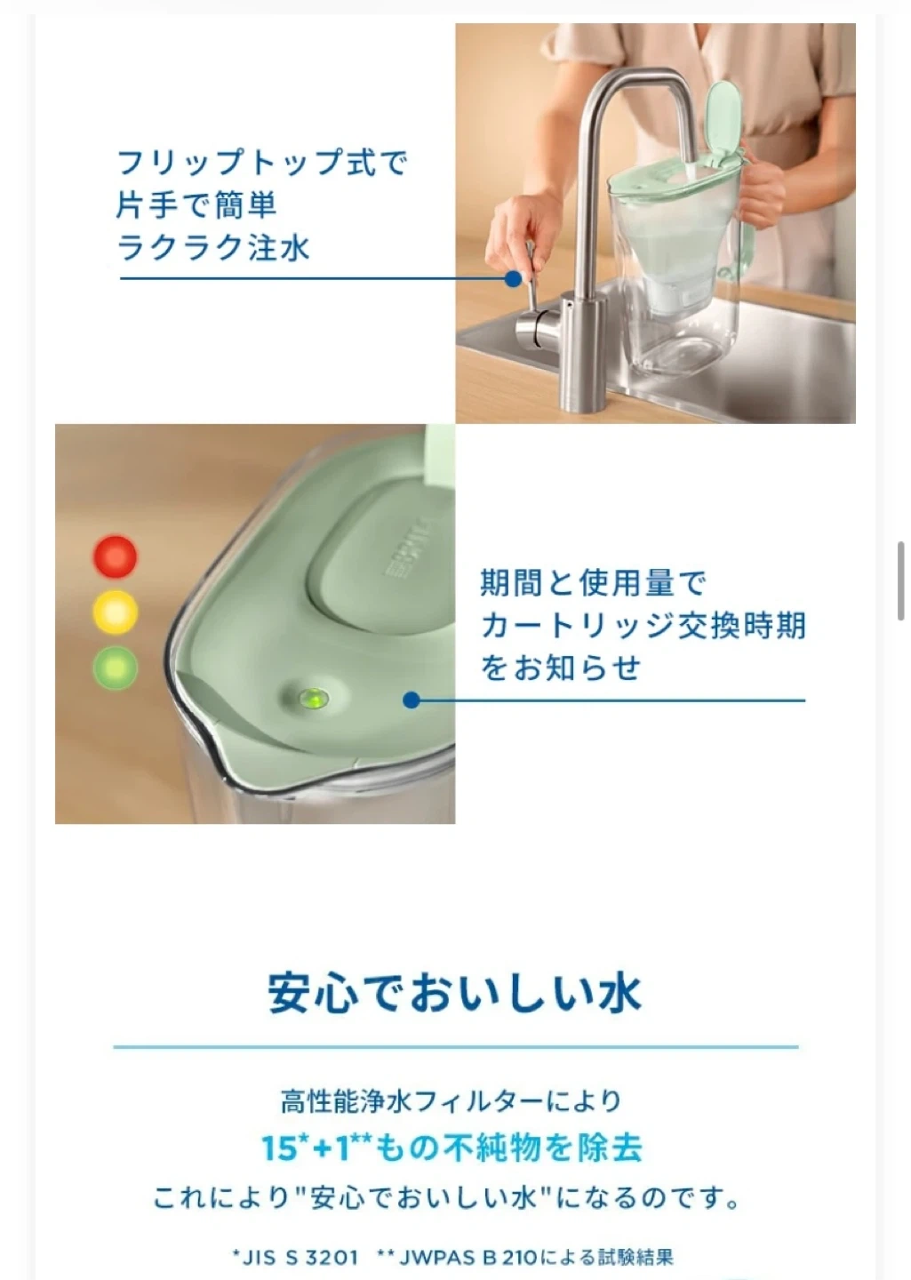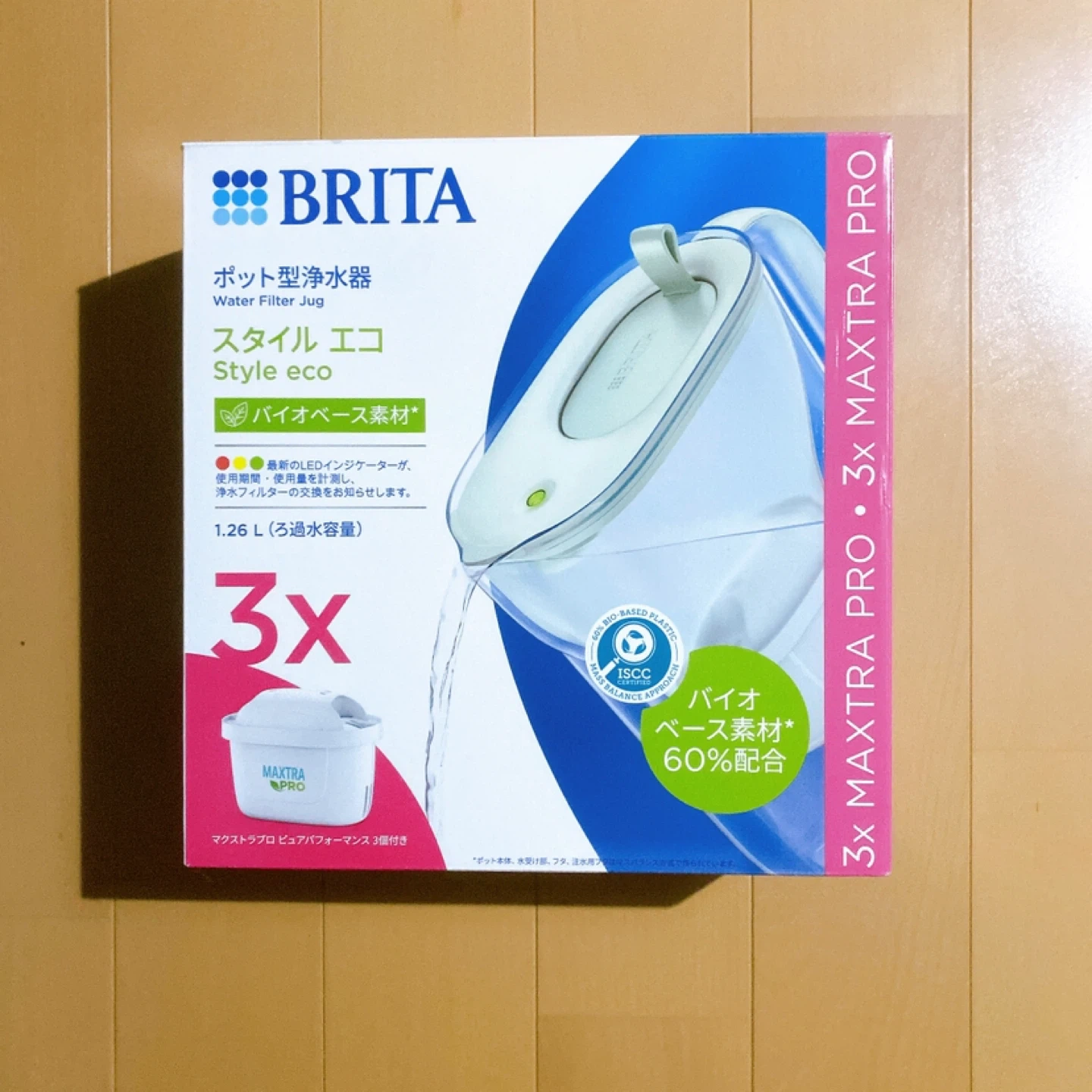 ブリタのスタイルエコになります。 カートリッジ交換時にLEDでお知らせしてくれる便利なスタイルのものです。 水道水を注ぐだけで簡単。 カートリッジ3つ付き 製品の詳細: サステナブルな素材:バイオベース素材* 60%配合 * バイオベース:材料、製品の一部が再生可能なバイオマス資源(植物)由来であること。本体、水受け部、フリップ式のふたにマスバランス方式を採用ISCC PLUSマスバランス認証取得:全製造工程において、バイオベース原料の追跡が可能。グッドデザイン賞受賞3色でカートリッジ使用状況をお知らせ: LED スマートライトの表示でカートリッジの交換時期が分かるので、いつでもおいしい水が飲めます。簡単注水:フリップトップ式で片手で簡単に注水できます。人間工学に基づいたデザイン:使いやすさを第一にデザインした注ぎ口に、握りやすくデザインされた取っ手。本体サイズ:幅241mm×奥行105mm×高さ274mm全容量2.4 L、ろ過水容量1.26 L ろ過水容量について 2020年10月1日の家庭用品品質表示法に係る雑貨工業品品質表示規程の一部改正にもとづき、定められた方法で測定した容量です。原水貯留部(ろ過される前の水道水が貯まる部分)の最下部まで貯留する水量を表示しています。 選べる2種類のマクストラプロ浄水カートリッジはこちらからhttps://www.brita.co.jp/%E8%A3%BD%E5%93%81%E4%B8%80%E8%A6%A7/%E3%83%95%E3%82%A3%E3%83%AB%E3%82%BF%E3%83%BC%E3%82%AB%E3%83%BC%E3%83%88%E3%83%AA%E3%83%83%E3%82%B8 PFAS (PFOS/PFOA*) 除去できます ブリタの浄水フィルターカートリッジ 「マクストラプロ ピュアパフォーマンス」及び「マイクロディスク」は、*JWPAS B.210 基準でテストを実施し、PFAS (有機フッ素化合物) の一種であるPFOS及びPFOAを80%以上除去できることが確認されました。