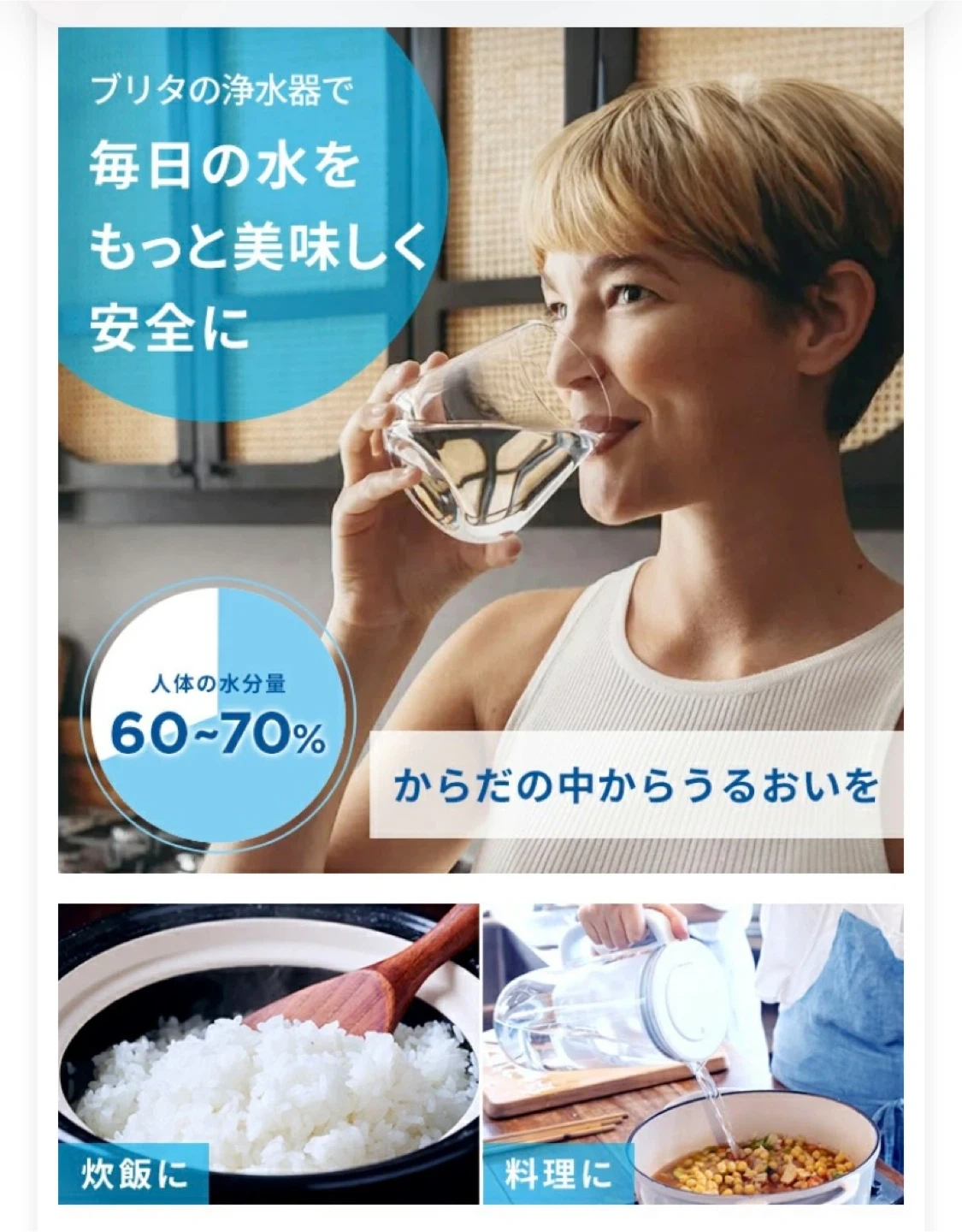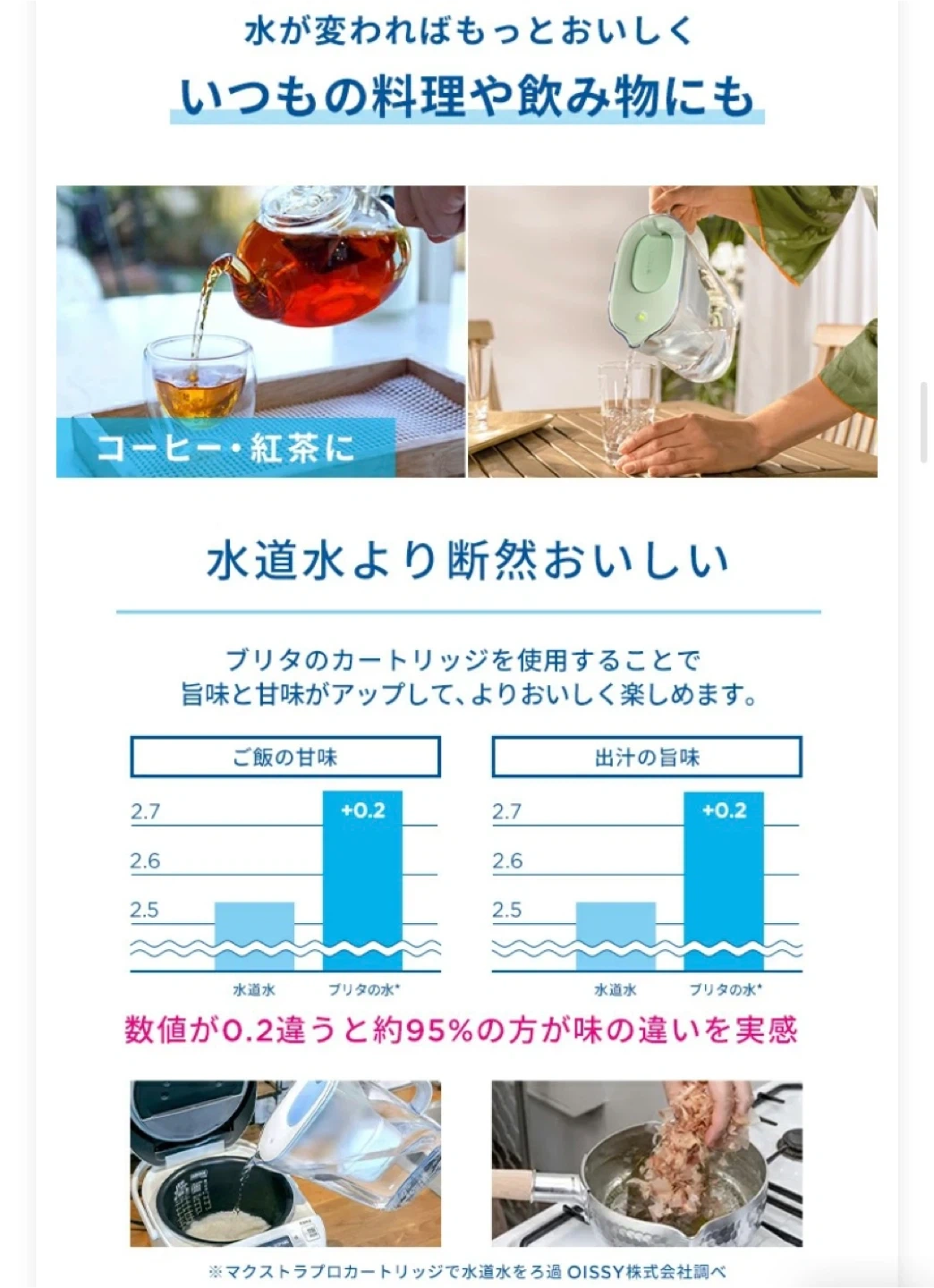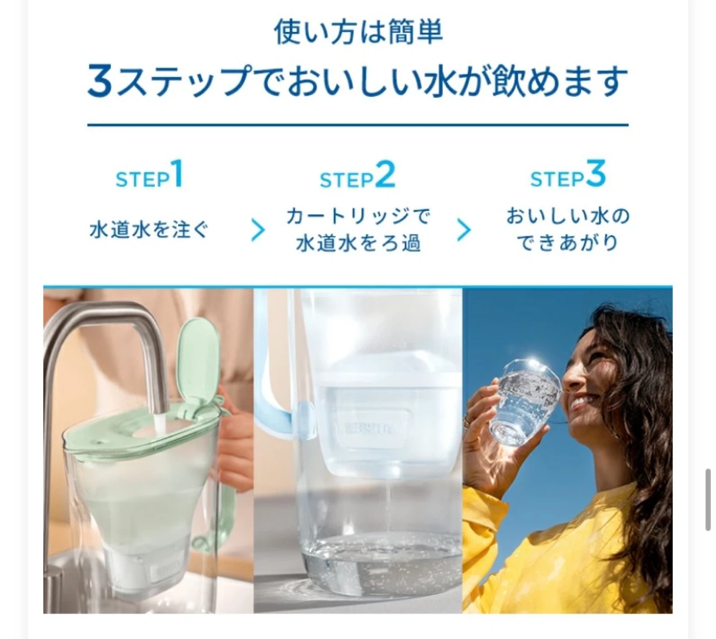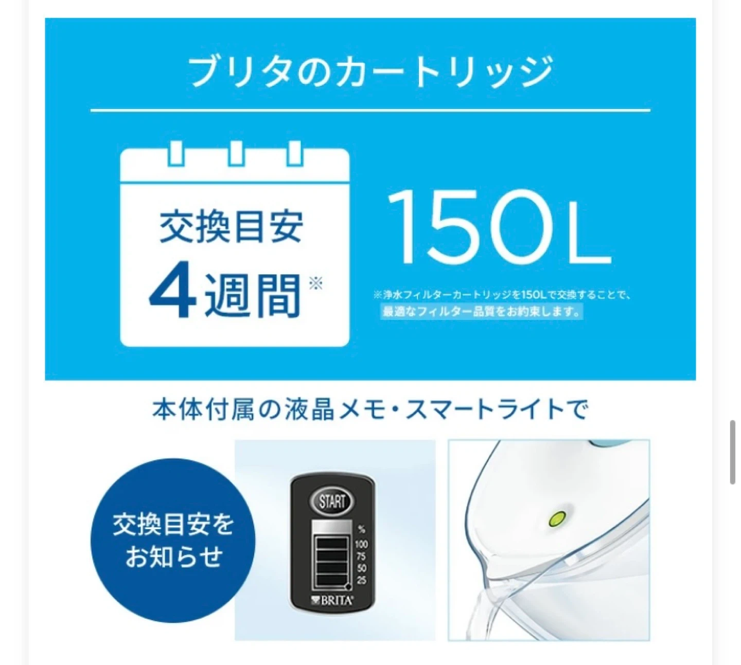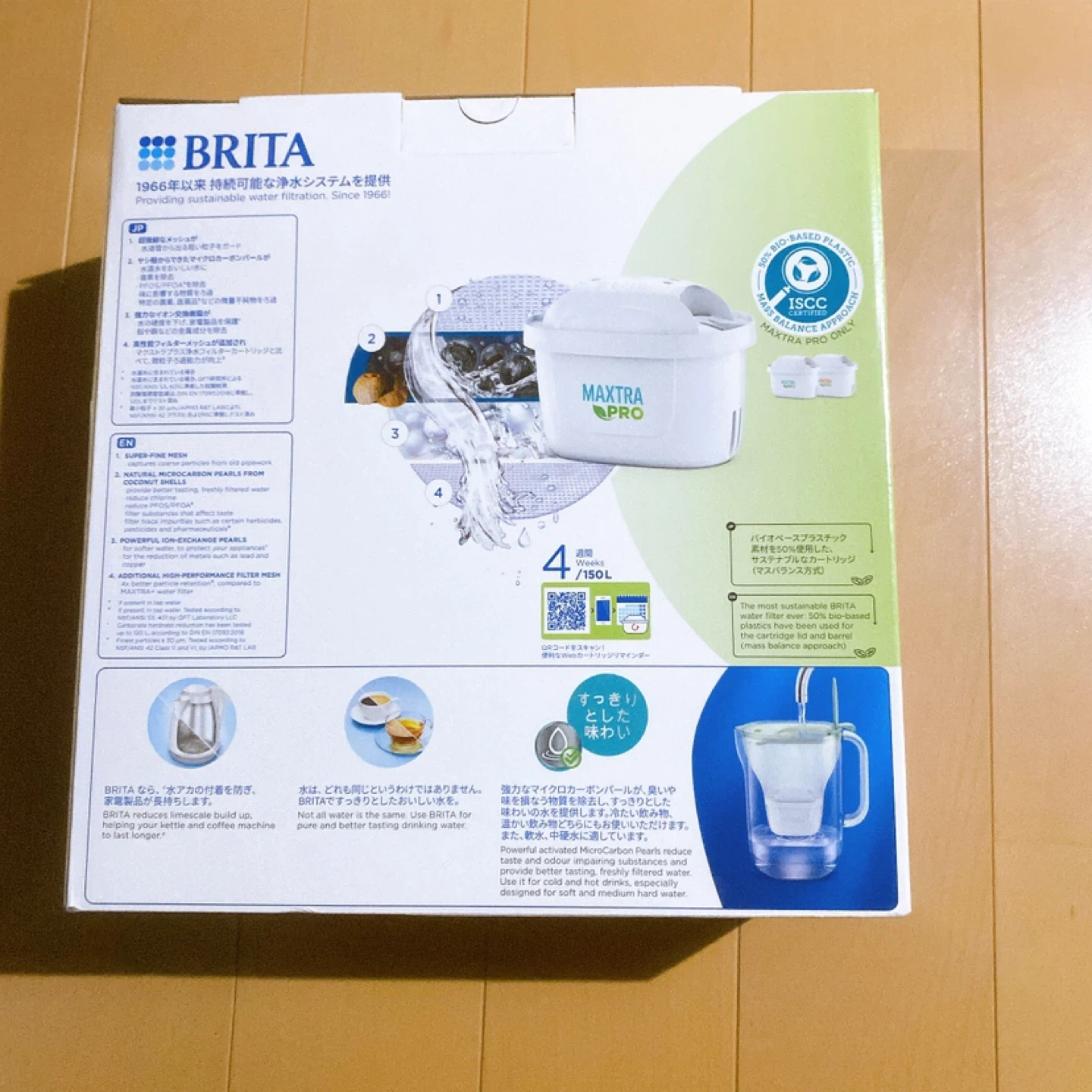 ブリタのスタイルエコになります。 カートリッジ交換時にLEDでお知らせしてくれる便利なスタイルのものです。 水道水を注ぐだけで簡単。 カートリッジ3つ付き 製品の詳細: サステナブルな素材:バイオベース素材* 60%配合 * バイオベース:材料、製品の一部が再生可能なバイオマス資源(植物)由来であること。本体、水受け部、フリップ式のふたにマスバランス方式を採用ISCC PLUSマスバランス認証取得:全製造工程において、バイオベース原料の追跡が可能。グッドデザイン賞受賞3色でカートリッジ使用状況をお知らせ: LED スマートライトの表示でカートリッジの交換時期が分かるので、いつでもおいしい水が飲めます。簡単注水:フリップトップ式で片手で簡単に注水できます。人間工学に基づいたデザイン:使いやすさを第一にデザインした注ぎ口に、握りやすくデザインされた取っ手。本体サイズ:幅241mm×奥行105mm×高さ274mm全容量2.4 L、ろ過水容量1.26 L ろ過水容量について 2020年10月1日の家庭用品品質表示法に係る雑貨工業品品質表示規程の一部改正にもとづき、定められた方法で測定した容量です。原水貯留部(ろ過される前の水道水が貯まる部分)の最下部まで貯留する水量を表示しています。 選べる2種類のマクストラプロ浄水カートリッジはこちらからhttps://www.brita.co.jp/%E8%A3%BD%E5%93%81%E4%B8%80%E8%A6%A7/%E3%83%95%E3%82%A3%E3%83%AB%E3%82%BF%E3%83%BC%E3%82%AB%E3%83%BC%E3%83%88%E3%83%AA%E3%83%83%E3%82%B8 PFAS (PFOS/PFOA*) 除去できます ブリタの浄水フィルターカートリッジ 「マクストラプロ ピュアパフォーマンス」及び「マイクロディスク」は、*JWPAS B.210 基準でテストを実施し、PFAS (有機フッ素化合物) の一種であるPFOS及びPFOAを80%以上除去できることが確認されました。