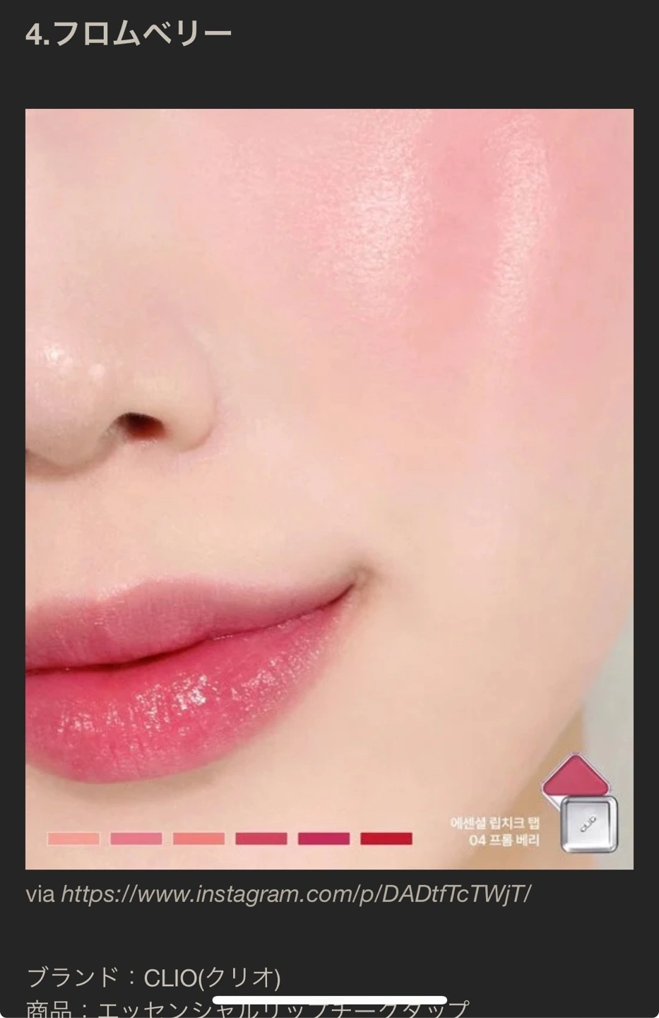 韓国コスメCLIO 2025AW 2024.10.12 日本発売 最新作のリップ&チークです。 一つの商品でリップ使いも チーク使いもできるので 化粧直しにコンパクトに持ち運べます♪ 未開封につき 色など 詳しくはこちらをご覧ください https://search.app/QKjNmkSqVaWHcvoX9 #04 フロムベリー 神経質な方はご遠慮ください✨ 定価 1980円税込 CLIOは他にも出品しておりますので 見ていただけると嬉しいです。