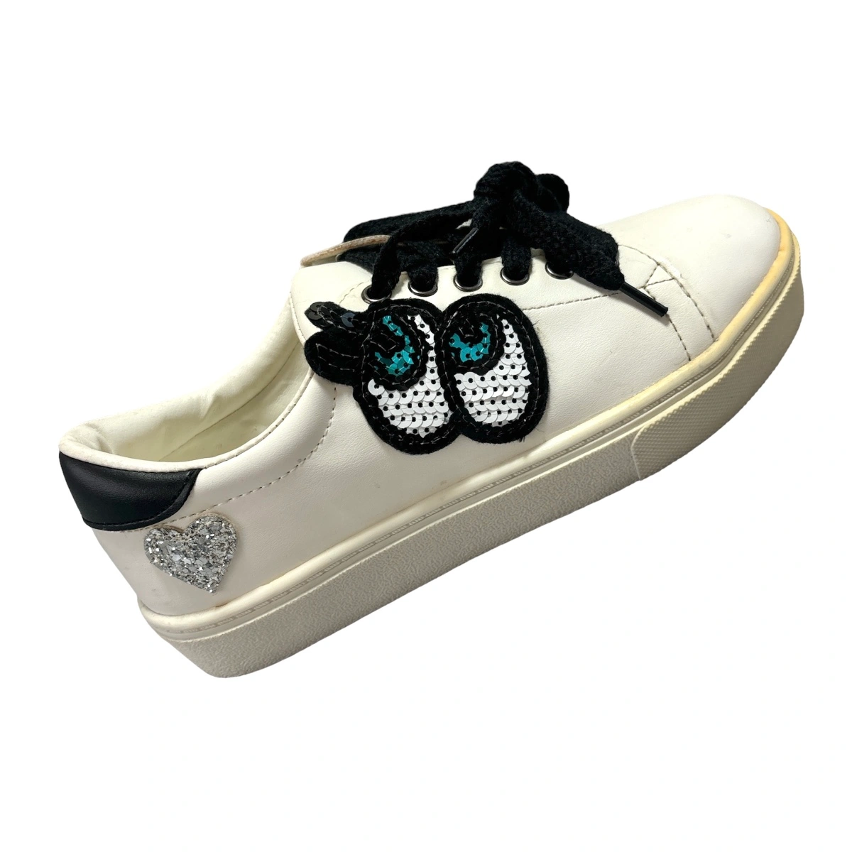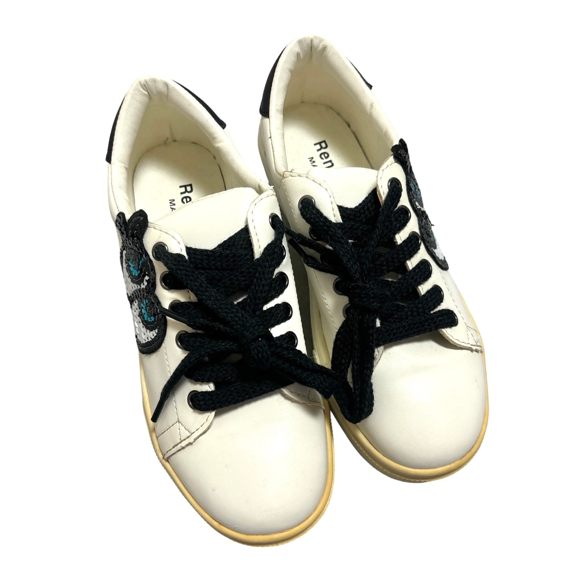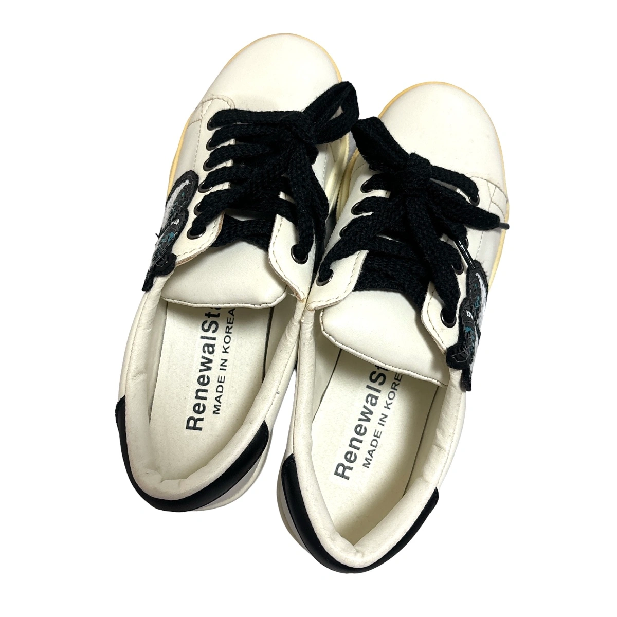 RenewalStar ポイント ワッペンスニーカー シューズ 靴 ☆新品未使用 ☆レディース ☆カラー…ホワイト ☆サイズ…M スパンコールのアイデザイン、かかとのハートがとってもキュートな個性派スニーカー。 シンプルなデザインなので、どんなスタイルにも合わせやすい。 大人のハズしアイテムとしても◎。 韓国で去年購入 ラスト一点展示品購入いたしました! 一度購入前に試し履きしましたが、外では履いてません。 購入時に箱は付いてませんでした。 経年劣化による黄ばみが、つま先部分にありますが新品未使用です! ご理解のうえご購入ください。 他サイトでも出品中です。 他で売れた場合、急に削除しますので、ご了承ください