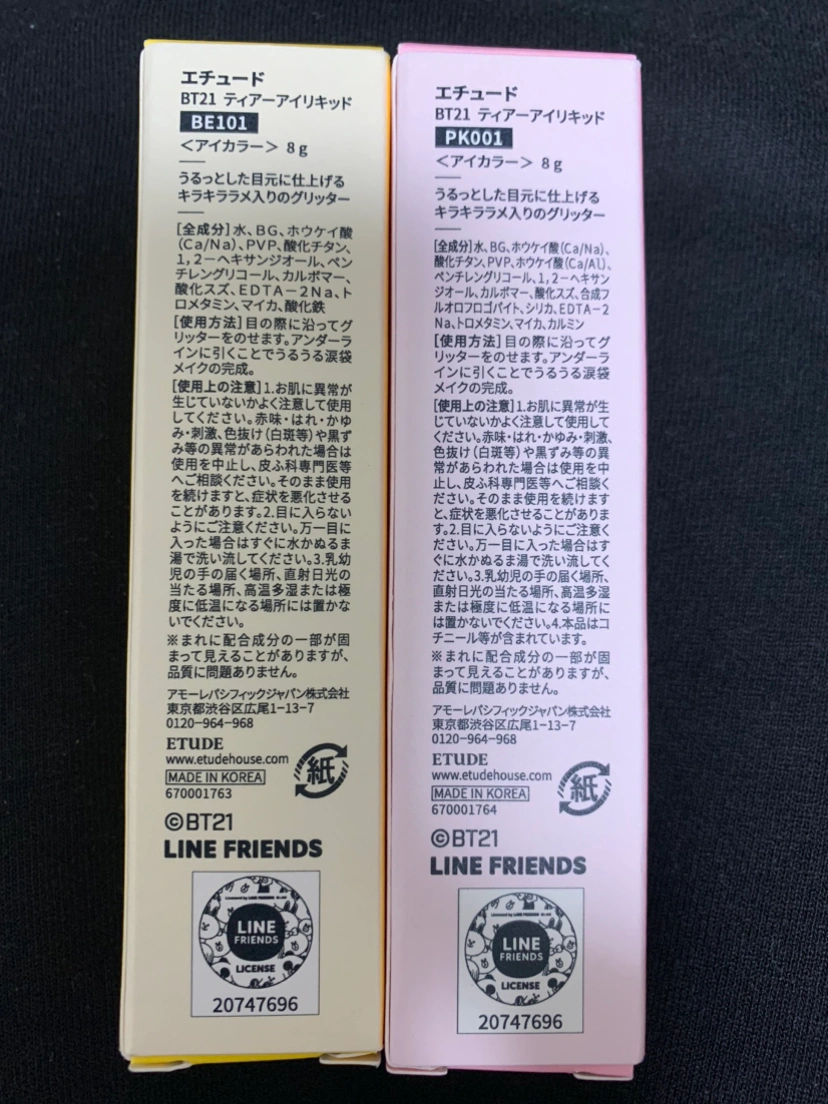 新品未開封 エチュード 定価以下 うるんとした涙袋を演出してくれる キラキラパール入りのアイライナー 定価858円 2本で1716円相当 ホワイト系 ベージュ系 2種セット 2本でBT21全キャラクターがそろいキュート♪ クリスタルやオパールのような輝きのパール感で、 見る角度によって様々な色に輝きます。 汗や涙、皮脂に強くにじみにくいので 一度引いたラインが長持ちします。 パールが肌に密着し、美しい輝きを演出します。