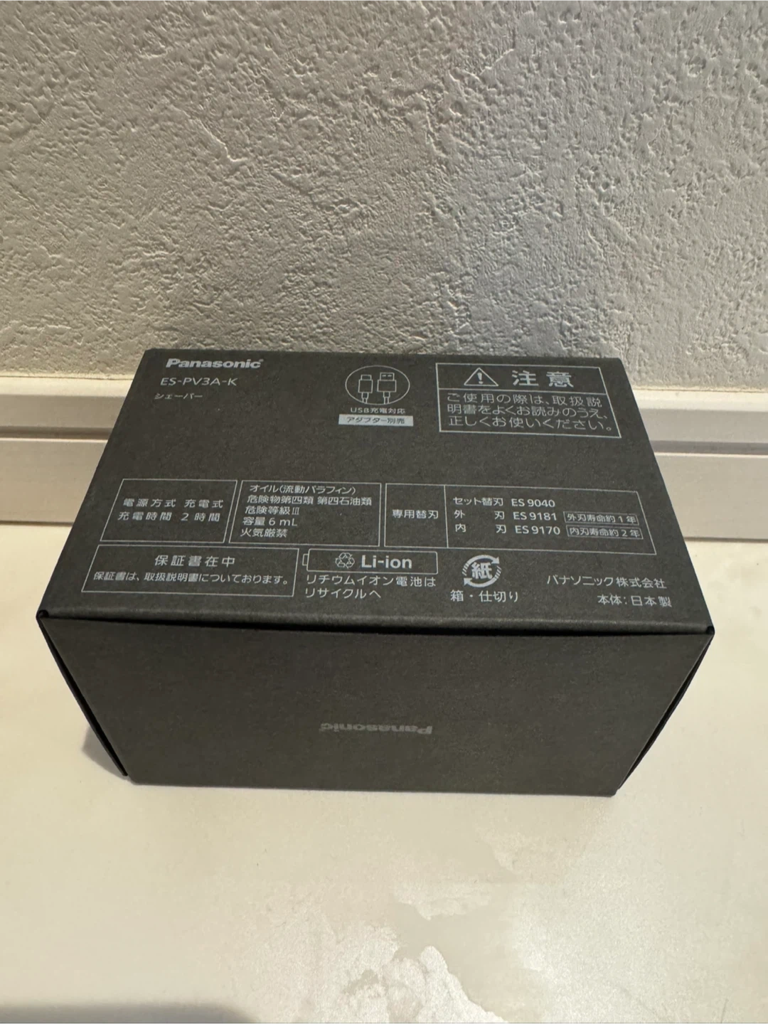 パナソニック リニアシェーバー ラムダッシュ パームイン マットブラック ES-PV3A-K メーカー小売り希望価格:34,800円 刃の種類:往復式・5枚刃 洗浄方法:水洗い 電源方式:充電式 電圧:AC100-240V(50/60Hz)・自動電圧切替付 消費電力(約):約4W(AC100V 充電時) 充電時間(約):2時間充電(USB) 使用可能日数(約):14日間(フル充電で最長・1日1回3分間使用の場合) 表示:充電催促表示 サイズ:幅7.2×奥行4.5×高さ5.7cm 質量(約):135g