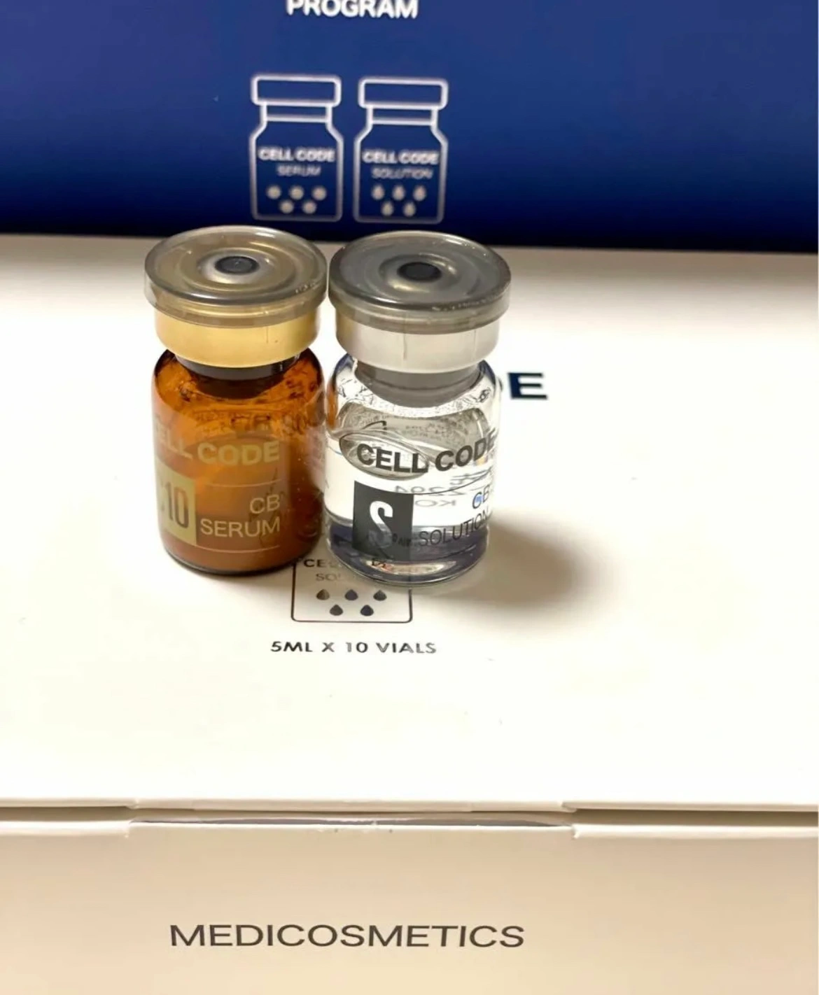 期間限定値下げ 新品未開封 2本セット セット内容 ブルーの箱:ヒト臍帯血幹細胞由来培養上清液100,000ppm(10%)含有(2 mL …1VIALS) グレーの箱:パンテノール 30,000ppm(3%)含有(5mL× 1VIALS) こちらは各1点ずつになります。 セット商品(箱買い)の方がお安くなりますが、ちょっと高くて試せない…と言う方のために、2本セットで販売しております。 スキンケア クリニック用に開発されたCELLCODE(セルコード)は、赤ちゃんの「へその緒」に含まれる臍帯血から作られた化粧品です。 発売以来、国内有名美容クリニック・皮膚科専門医より好評を受けさまざまな施術に導入されています。 ヒト臍帯血培養上清液を凍結乾燥したパウダーアンプル(2mL) には、ヒト臍帯血幹細胞培養液が10%配合され、都度、ソリュー ション(5mL)(液体アンプル)と混ぜ合わせて使用するため極めてフレッシュです。 そのまま塗布しても十分な効果がありますが、エレクトロポレー ションやイオン導入での使用でそのポテンシャルをさらに引き出すことができます。 また、お肌だけではなく頭皮にも使用できます  CELLCODEのヒト臍帯血由来幹細胞培養上清液は、製薬会社が20年以上かけて積み重ねた技術力により作られています。 幹細胞から成長因子、サイトカインを分泌させるために適した培地を製薬会社が自社で開発。 他の幹細胞培養液と比較しても上質な培養上清が得られます。 培養上清液は凍結乾燥してあるので、ご使用のタイミングに合わ せて付属の溶解液または生理食塩水、精製水などに溶解してお使い頂けます。 溶解する瞬間まで、成長因子やサイトカインは安定保存されていますので、いつでもフレッシュな状態でご提供できます。 *溶解後は冷蔵保存の上、1週間以内にご使用ください。