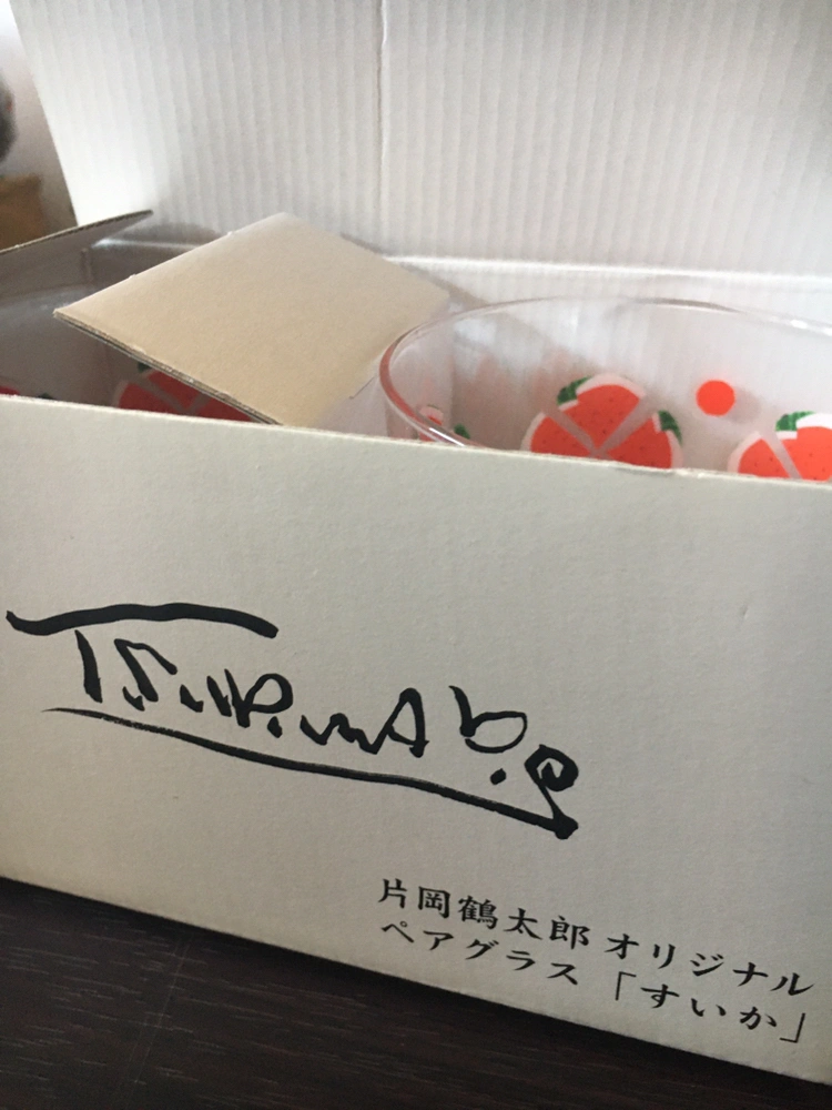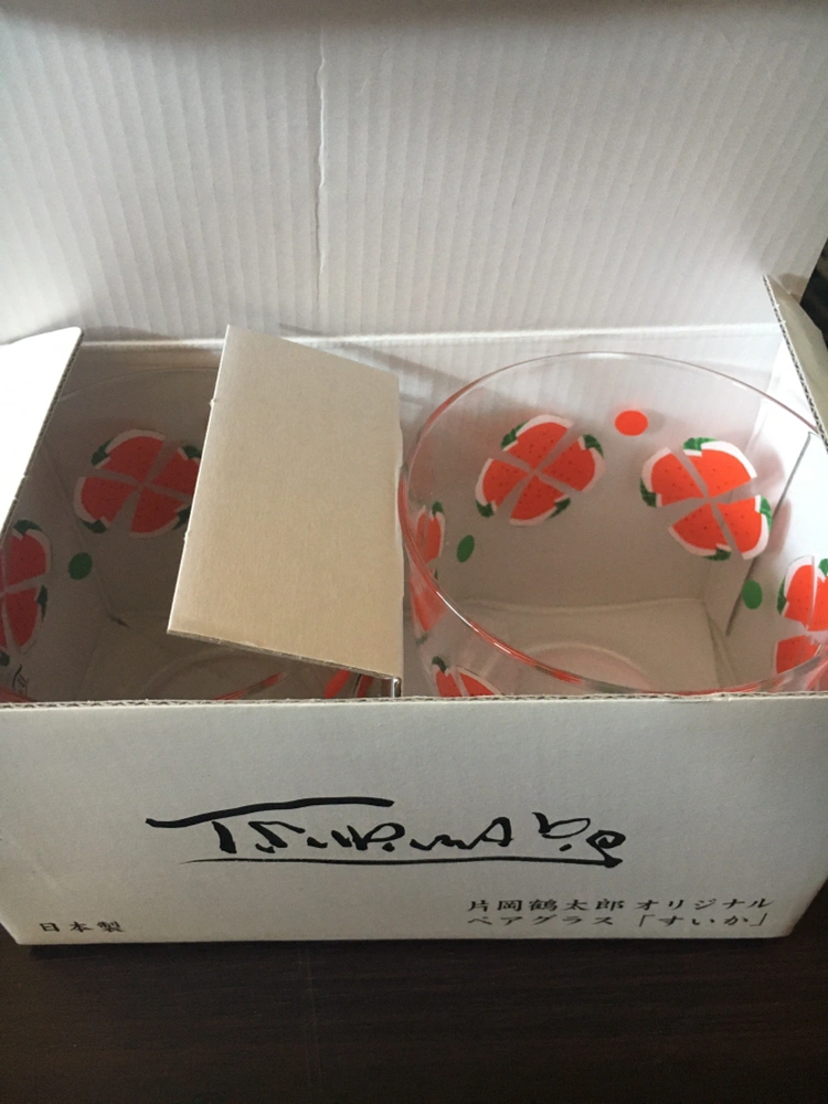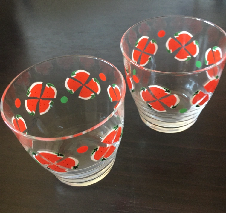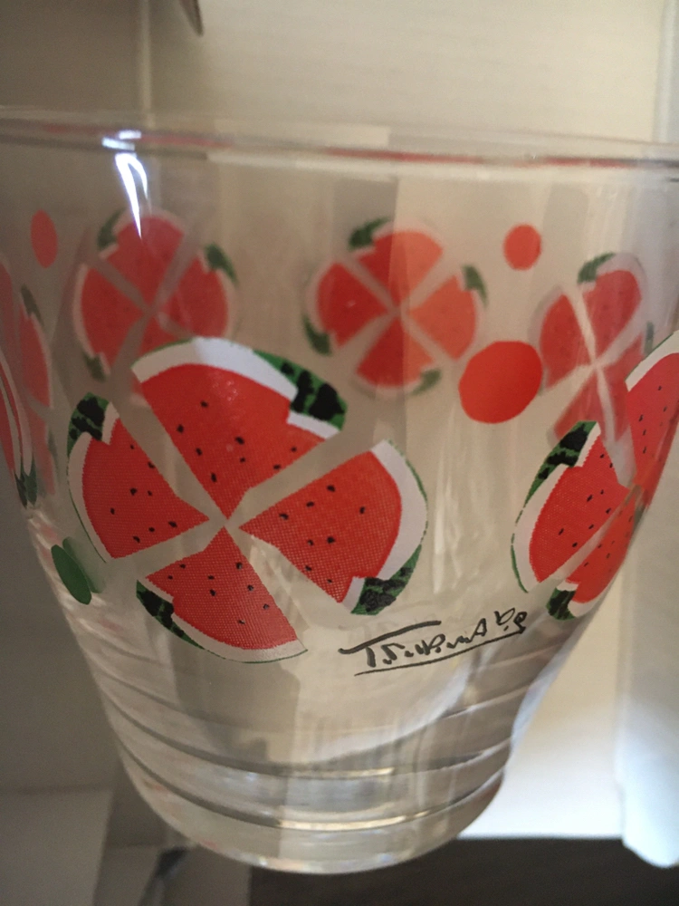 スイカデザインが目を引く素敵なペアグラス 片岡鶴太郎作、サイズは約8cm×8cmです これからの暑い季節にいかがでしょうか なるべくお近くまで伺います!