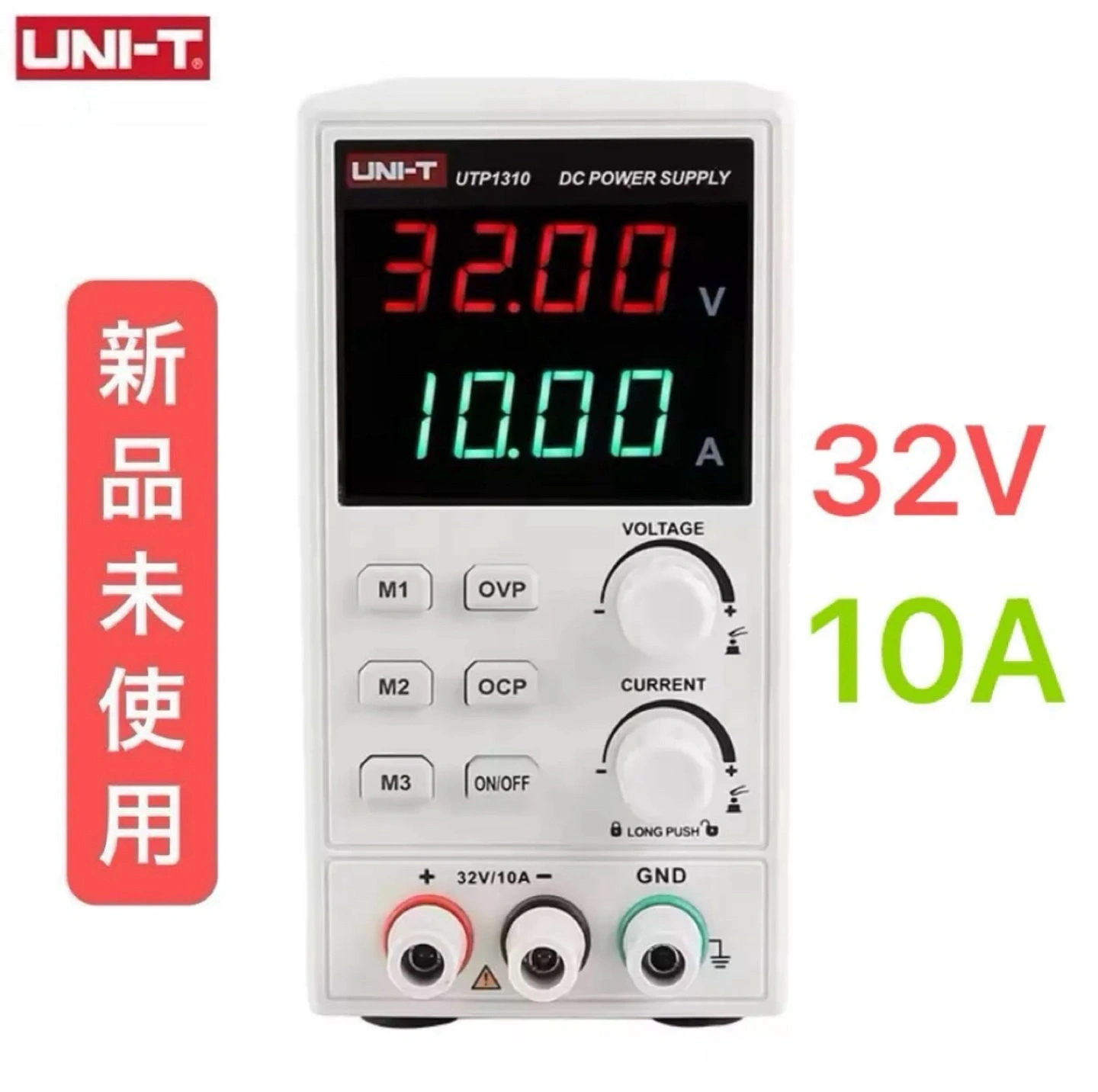 値下げ不可 UNI-T UTP1310 安定化電源の出品です。 撮影のために開封するしましたが、未使用品です。 【主な仕様】 出力電圧:0~32V 出力電流:0~10A 出力電力:最大320W 出力チャンネル数:1チャンネル ディスプレイ:4桁LEDデジタル表示(電圧・電流) 入力電圧:AC 110V/220V 寸法:80 × 150 × 230 mm 重量:約1.9kg 【内容】 本体 電源ケーブル x1 取扱説明書 x1 (多言語・日本語版あり) ワニ口クリップ付きテストリード アリエク価格:送料込みで18,000円以上