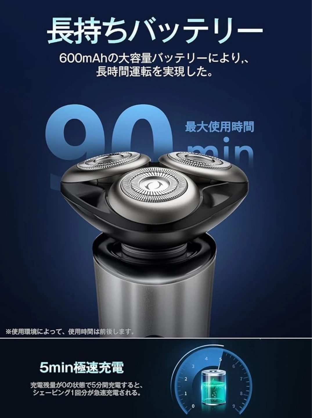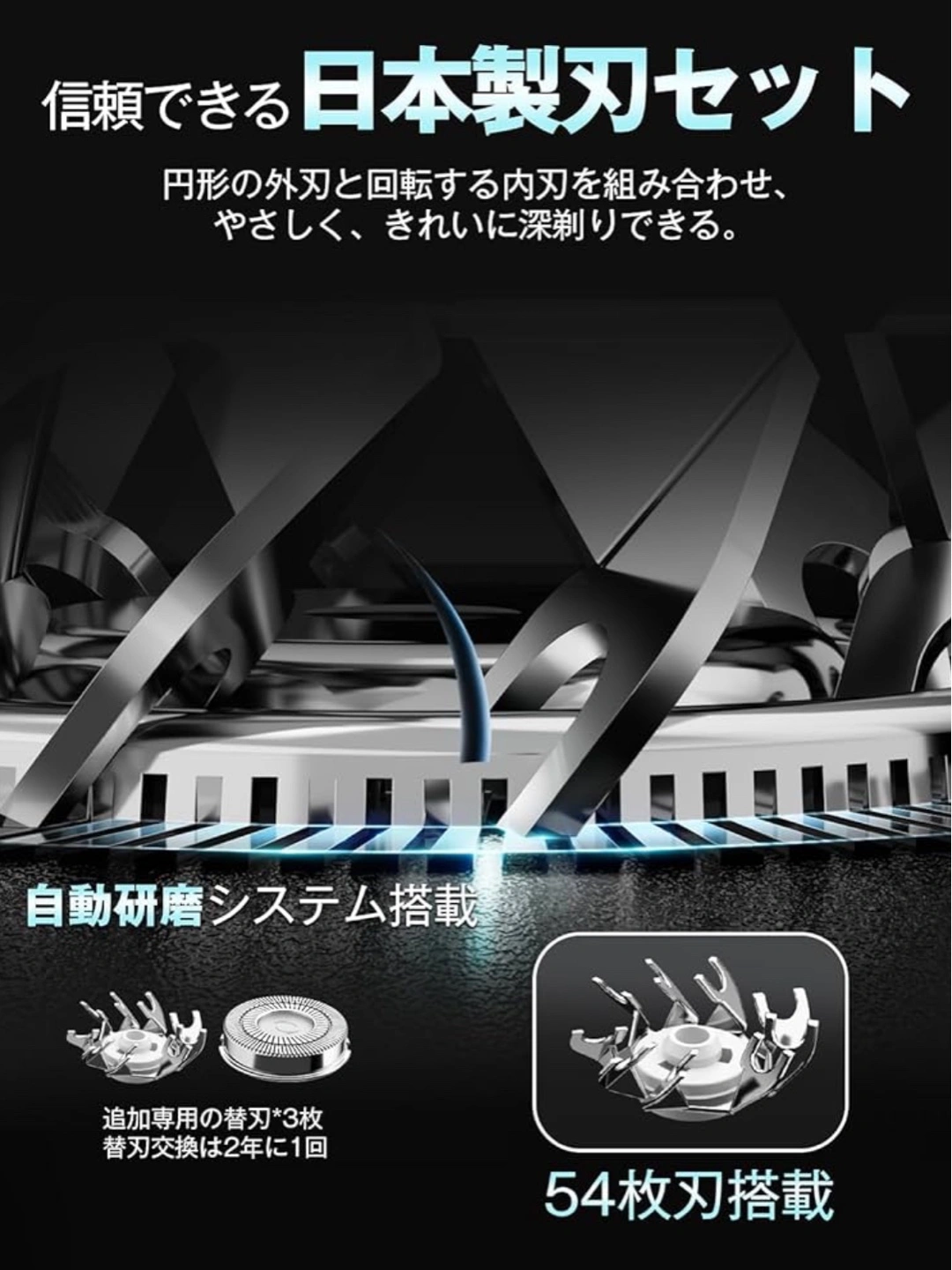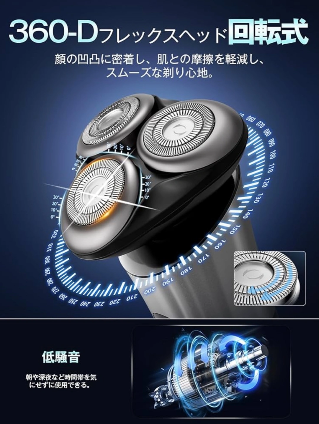 【3つの独立浮動刃・54枚日本製ステンレス刃】高品質な日本製ステンレス刃を使用し、耐久性と切れ味を兼ね備えています。独立浮動刃が顔の形状に合わせて動くため、難しい部分もラクに剃れます。丸みを帯びた独立浮動刃が肌に優しくフィットし、肌への負担を軽減します。濃いひげや短いひげも効率的に処理できるため、忙しい朝にも最適です。 【10000RPM高速回転モーター】高品質な刃と高速モーターの組み合わせで、切れ味が持続します。濃いひげや短いひげもしっかりキャッチし、なめらかな仕上がりを実現します。静音設計により、 朝の忙しい時間や夜間の使用でも周囲を気にせずシェービングが可能です。 【大容量バッテリー&TYPE-C急速充電】一回のフル充電で最大90分間使用可能です。長時間の使用にも耐えるため、頻繁な充電が不要です。急な出先や忙しい朝でも、短時間で急速充電できます。LCDディスプレイで電池残量が確認できるため、充電のタイミングを把握しやすいです。 【海外対応・出張/旅行に便利】100V-240Vの広い電圧範囲に対応しており、日本、アメリカ、ヨーロッパなど、どの国でも変圧器なしで直接使用できます。コンパクトで軽量なため、出張や旅行、日常の持ち運びに最適です。実用的で心のこもった贈り物として、男性の友人や家族に喜ばれます。もし頻繁に海外に行かれる方や、信頼できるシェーバーをお探しの方には、このシェーバーは非常にオススメです!