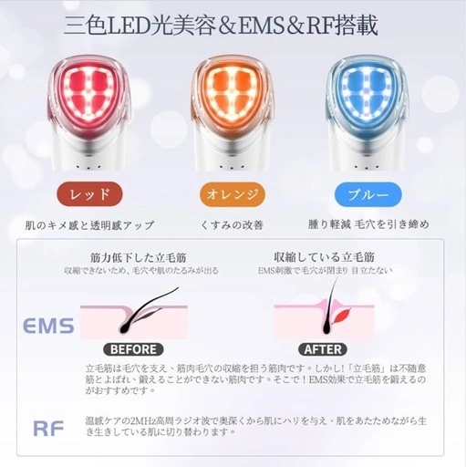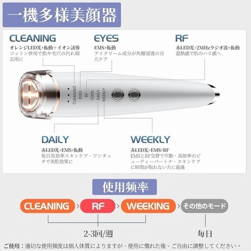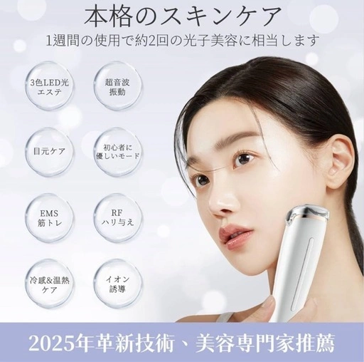 YFFUの美顔器です。美容専門家の鈴木真理子氏が監修し、フェイスケアのエキスパートと開発した多機能温熱美顔器とのことです。 EMS微電流、スマートRF、超音波振動、イオン導入・導出、温冷ケア、三色LED光機能が内蔵されています。週に一度のケアでも効果が期待できるそうです。 独自開発の感触センサー節電設計、自動停止タイマー付き。CLEANモード使用中は、指を棒に当てないと振動しない設計です。EYESモード3分、CLEANING&RFモード4分、COOL&DAILYモード6分、WEEKLYモード10分の自動停止タイマーがあります。 6つのモードが搭載されており、様々な肌ケアに対応。 充電は磁気充電式とType-C充電式の2種類に対応。200gと軽量で、付属のベルベット製収納袋で持ち運びも可能です。 ご希望の方はお気軽にご連絡ください。