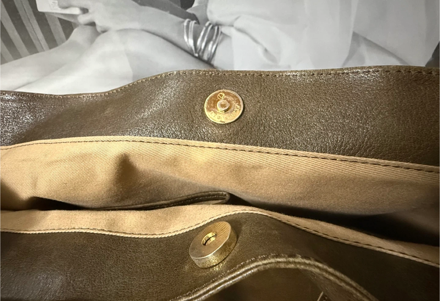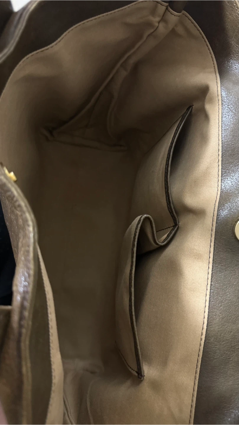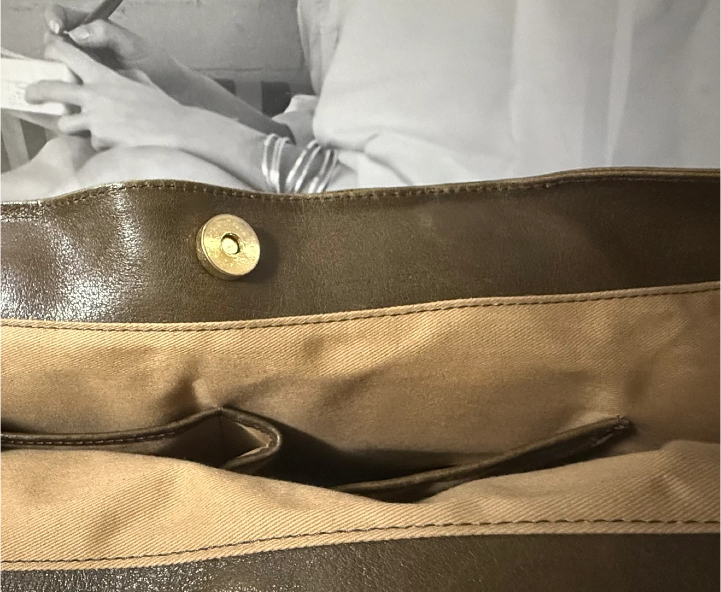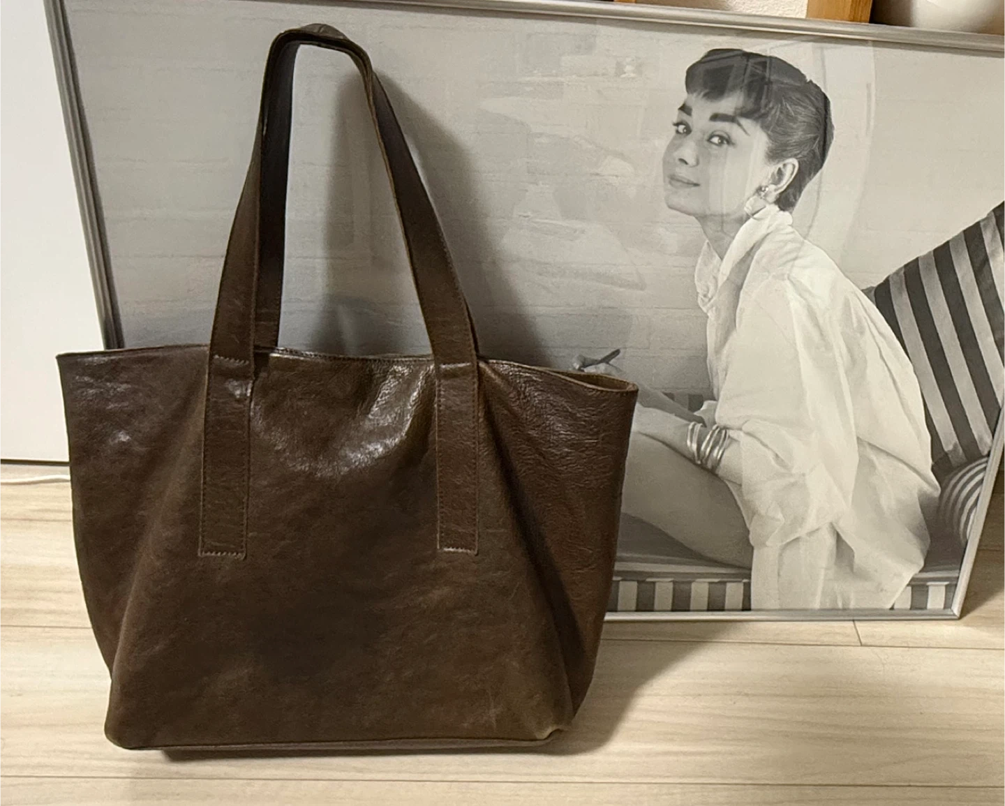 新進工房のレザートートバッグです。 ・カラー:濃いめのオリーブグリーン ・素材:レザー ・内側にポケットが複数あります ※皮革製品ならではの経年変化、金属部分の変色はありますが、それもビンテージ感、風合いと思って楽しんでくださる方にぜひお譲りできればと考えております。