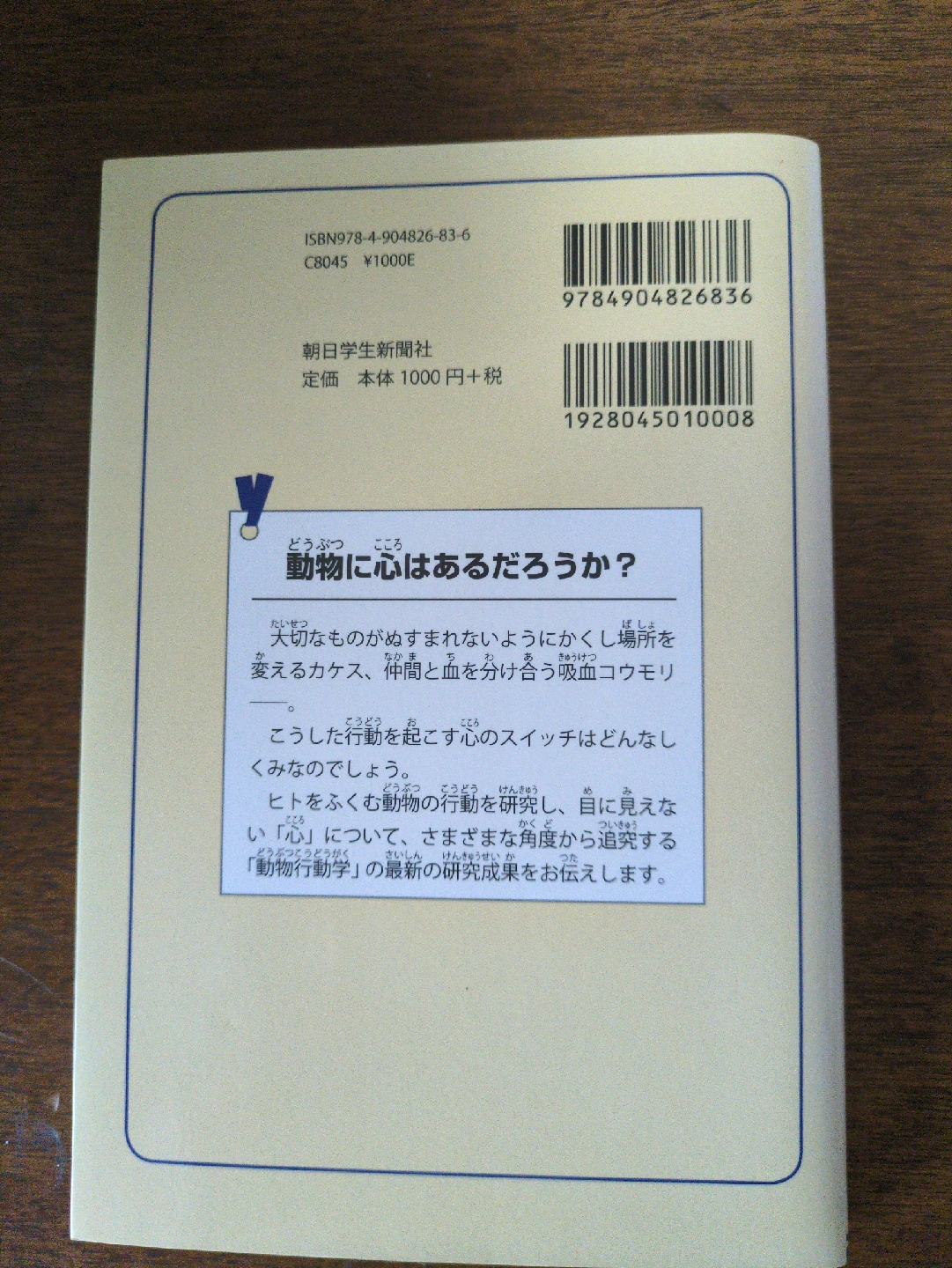 高学年〜中学生向けに書かれた本です。 大人が読んでもおもしろかったです。 ・タイトル:動物に心はあるだろうか? ・著者:松島 俊也 ・出版社:あさかぜ選書 ・定価: 1000円+税 中古品であることご了承ください