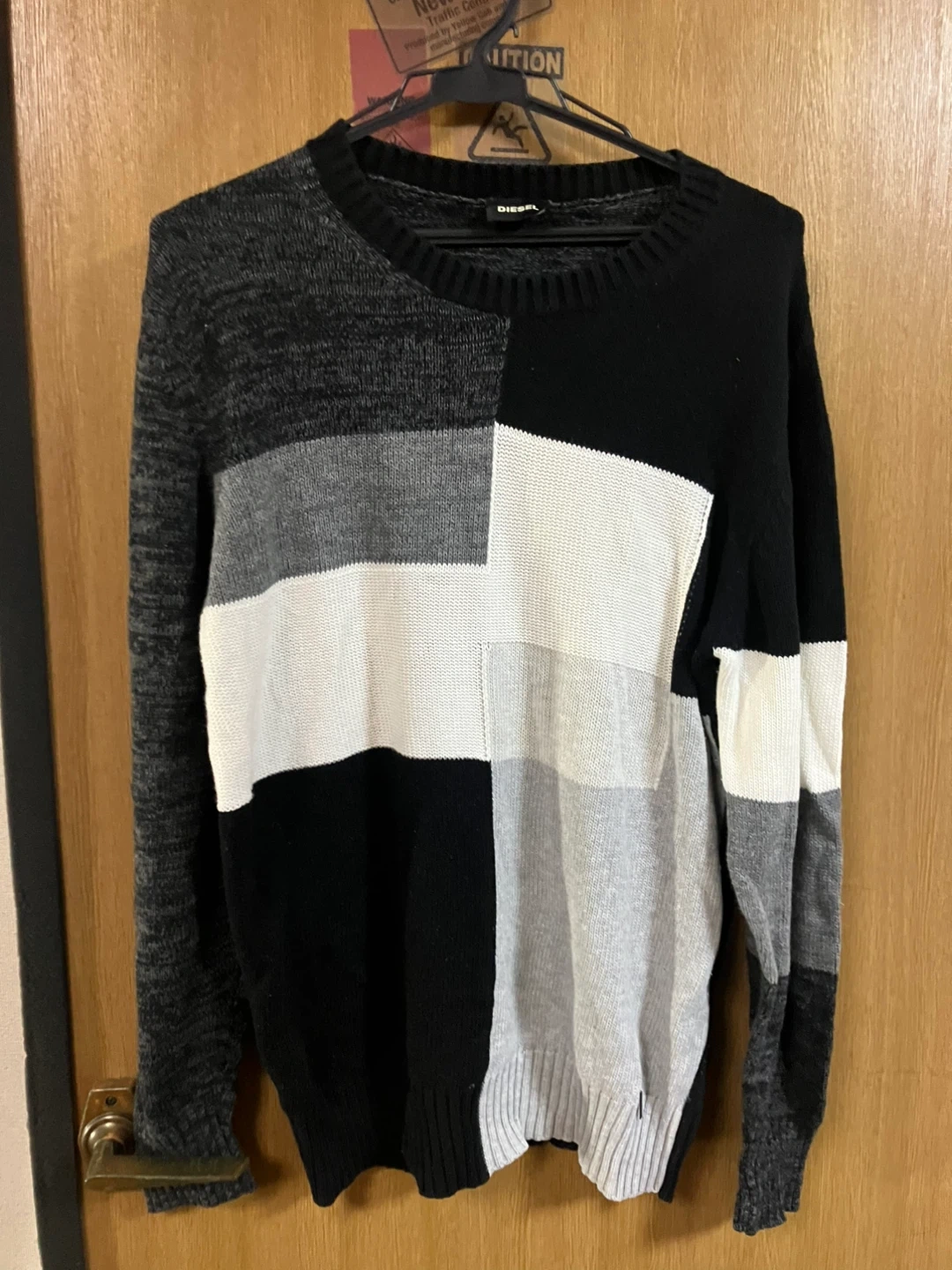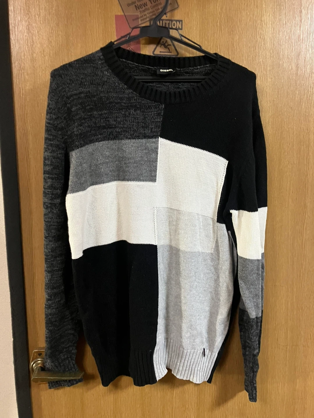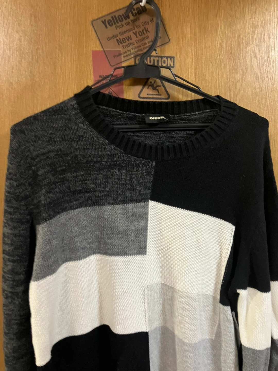 ディーゼルのニットセーターです ・カラー:ブラック、グレー、ホワイトの配色 ・素材:100%コットン ・サイズ:M ご参考までに身幅44、着丈63cmです。 さらっとした着心地で、スリーシーズン、レイヤードで着こなせると思います。 自宅近辺まで取りに来てくださる方限定でお願いいたします。 事前にご連絡いただければ、曜日を問わず11時から18時の間お引き渡しができます。