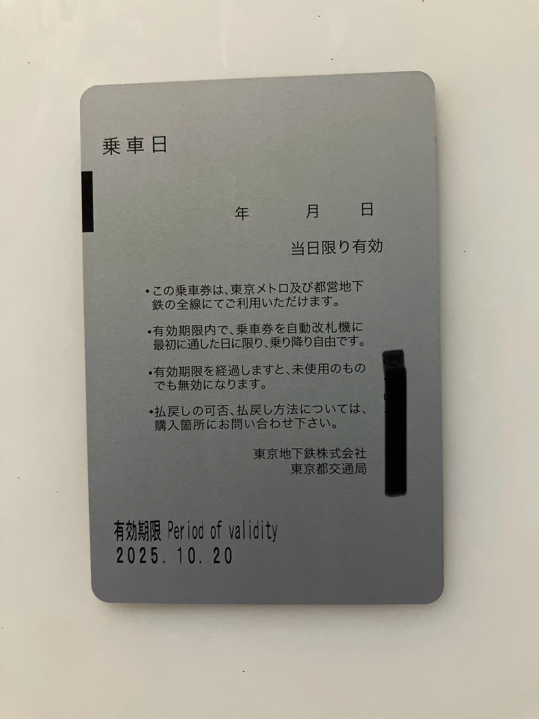 東京メトロと都営地下鉄の両方に乗れる一日乗車券です。 ・有効期限:2025年10月20日 ・定価 大人900円 期限がとても近いことを予めご了承ください。 その為、スムーズにお取引きしていただける方を優先させていただきます。
