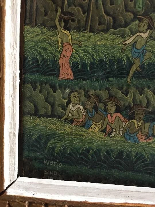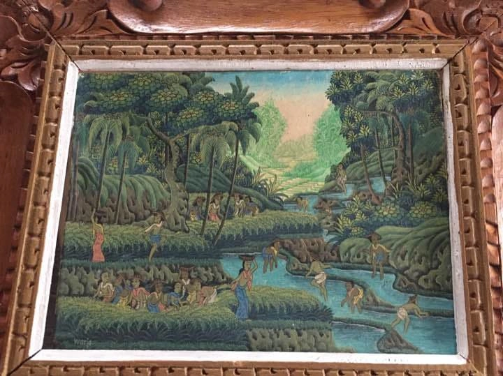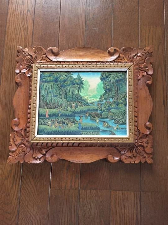 バリ島、ウブドゥのアート村で購入しました。 バリ特有のライステラスののどかな田園風景が描かれています。 ユーモラスな表情、構図を、緻密なタッチで描いた一点もの。画家サイン入り。 絵画に額も合わせてきましたが、手彫り、手作りの武骨さも雰囲気があります。 縦31cm、横37cm 自宅保管品です。 もう一点も出品中です。 ご希望の方はお気軽にご連絡ください。