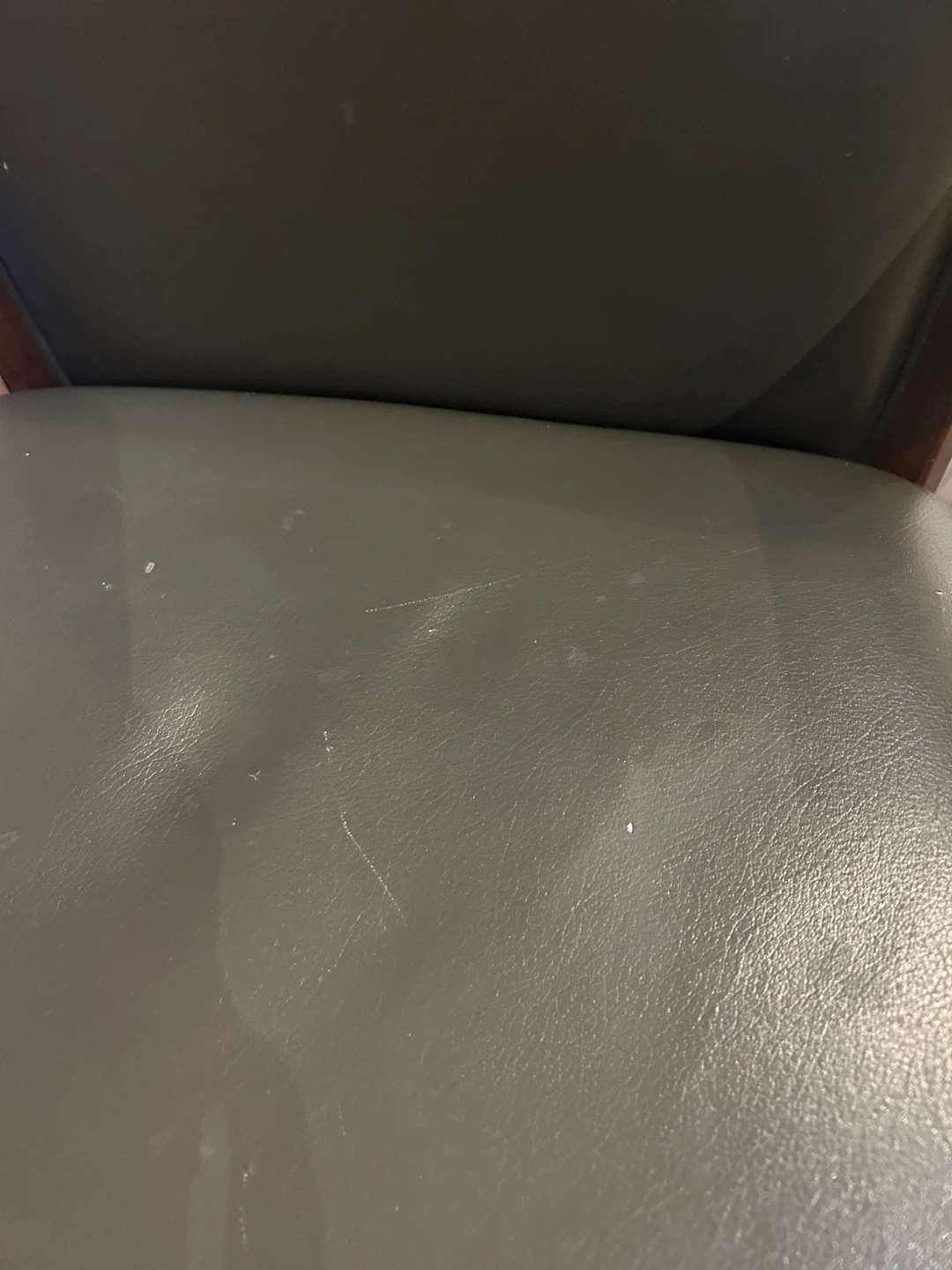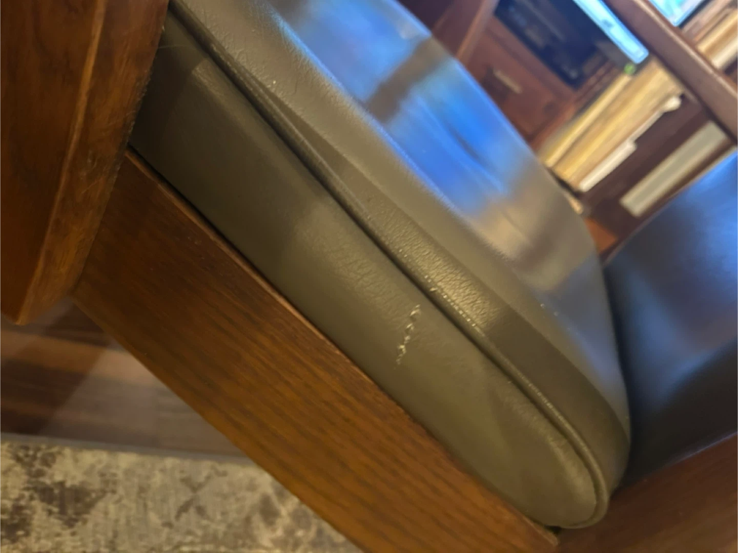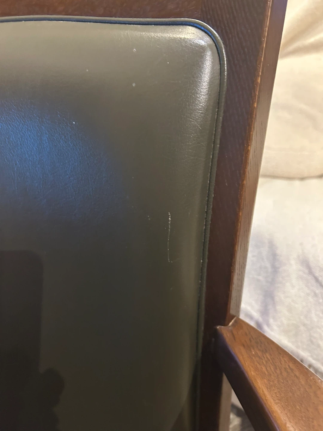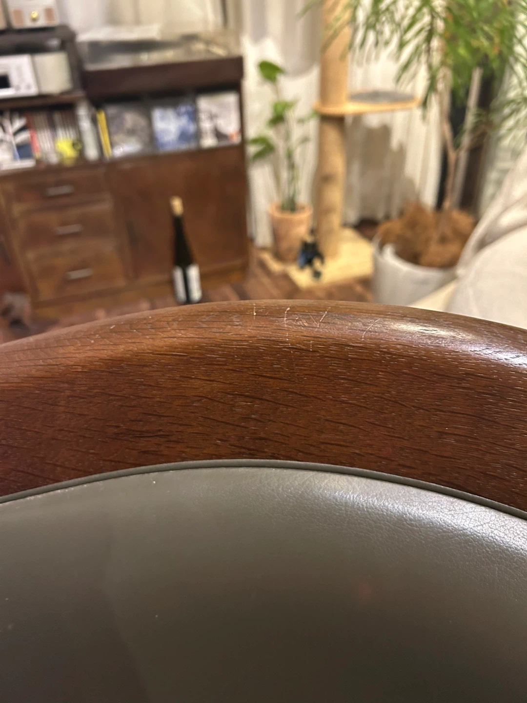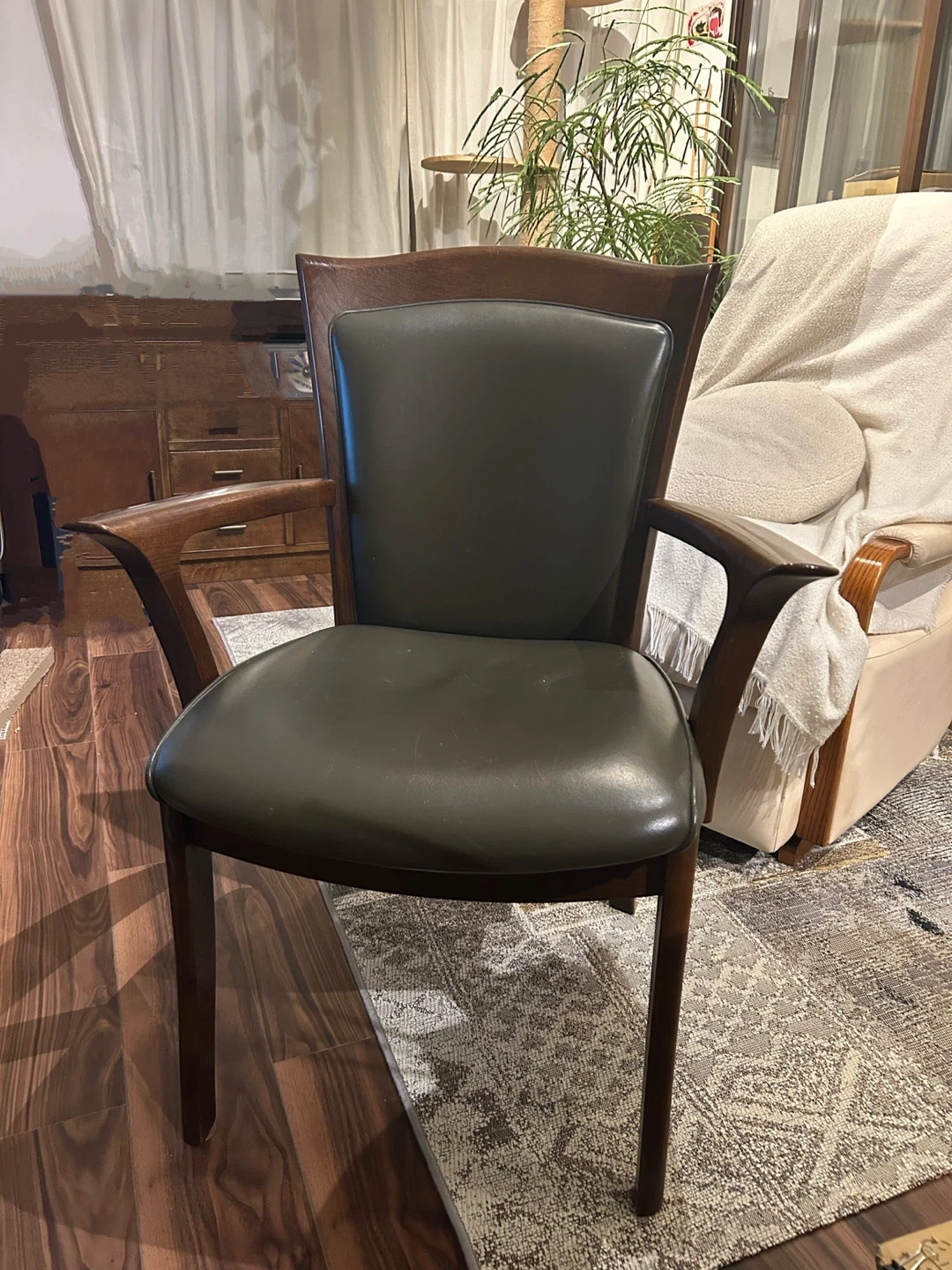 木製のシラカワのアームチェア 中古品であることご了承ください - 色: ダークグリーン - 素材: 皮革 - デザイン: アーム付き - 傷: 座面に小さな傷あり - 傷: 背もたれに小さな傷あり 背もたれ高さ 86cm 座面高さ(手前中央部) 42cm 肘掛け高さ 62.5cm 幅(肘掛け外側の一番広い部分) 65cm 幅(座面の一番広い部分) 49cm あまり使っていませんでしたが、猫の爪痕が少しついてしまいました。 座面、背当てクッションもへたっていません。爪痕以外は綺麗だと思います。 宮崎台の自宅まで取りに来ていただける方に。