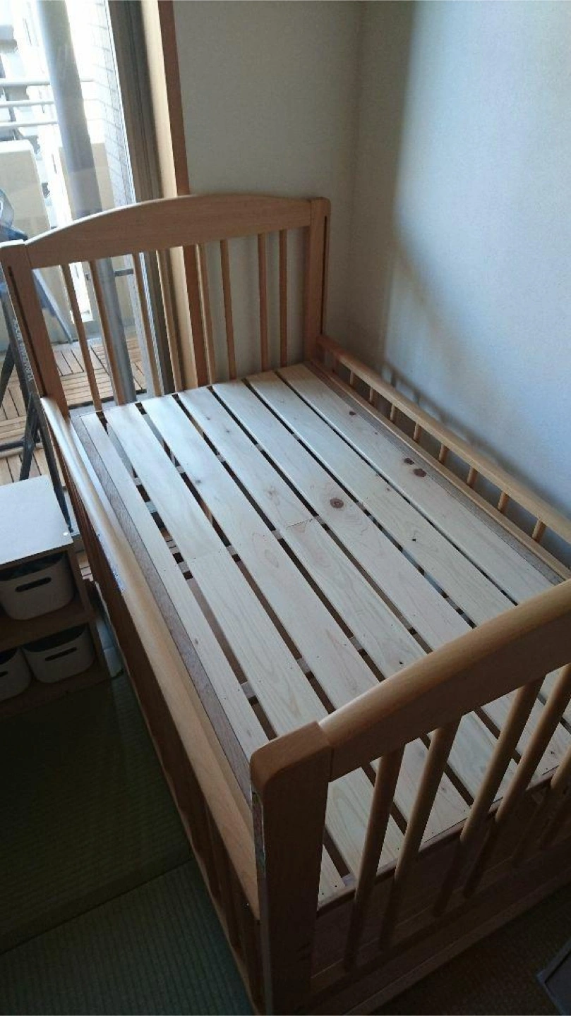 ステラナチュラル 日本製 国産ひのき 床材 ハイタイプ 高さ調整可 デュアルスライド 澤田工業製 ベッドの両側の柵が開くため便利でした。 大人のベッドに横付けして使用もできます。 荷物おきの棚板が少し湾曲しています。 キャスターの差込み棒が少し曲がっていて、差し込み穴近くのプラスチックが一部破損していますが、支障なく使用していました。 ぶつかったときに痛くないようクッション材を貼っていた部分がありますが、子が剥がしてしまい一部粘着が残っています。子がシールを剥がした跡もあります。 自宅近くまでお越しいただくようお願いします。 車への積み込み等はできる限りお手伝いさせていただきます。 商品使用-------------------------- 寝台の高さ調節:2段式 上段:700mm 下段:400mm 国産ひのきのすのこ 扉の開閉上下スライド サイズ:全長1,245×全幅796×全高1,145-1,045mm 寝台サイズ:約1,200×700mm 重量:28kg カラー:ナチュラル 使用木材:ヨーロッパ産ブナ材 商品特徴-------------------------- 両側の柵が開閉できるので使い方は自由自在 赤ちゃんの着替えや抱き起こし時に 腰に負担のかかりにくいハイタイプ 手すりと敷布団がフラットになるので、 赤ちゃんの足がひっかかりにくく安心です 寝台のすのこは国産ひのきを使用しているので通気性は抜群です!