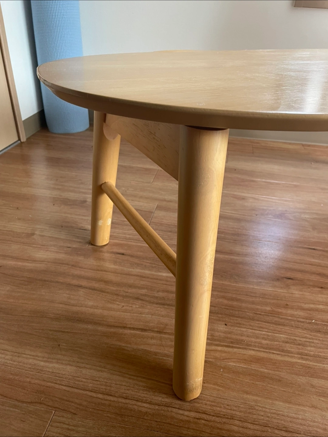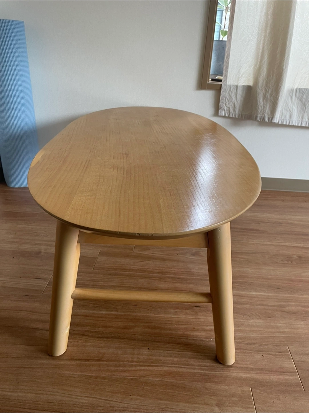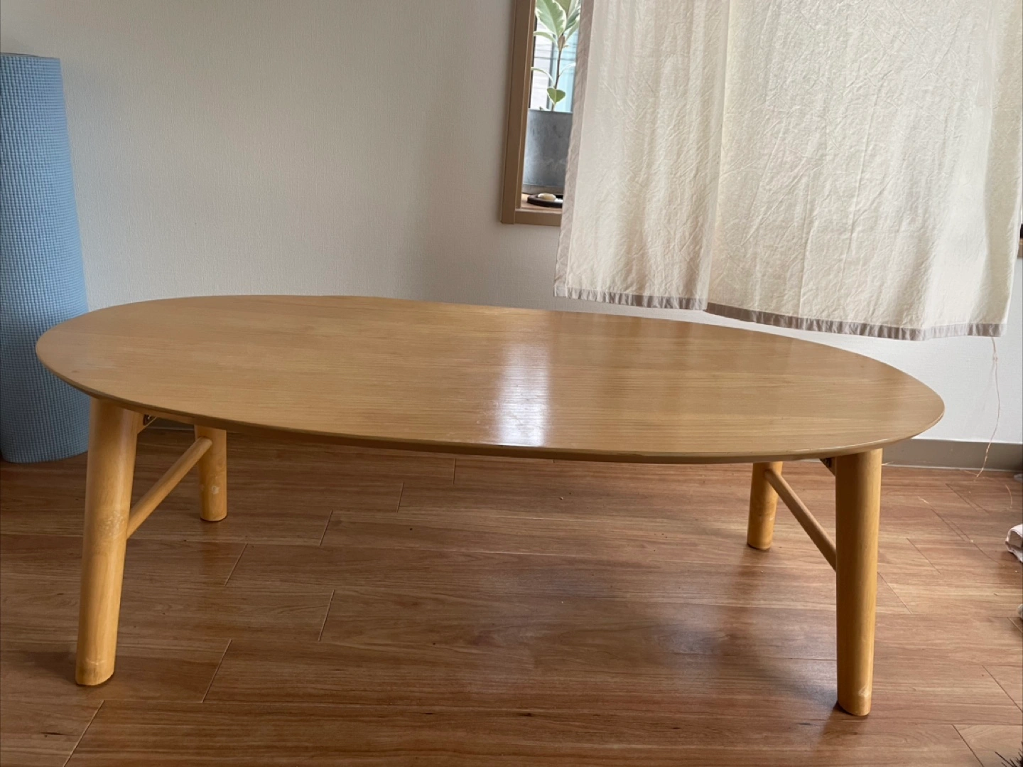 自然な色合いで、どんなインテリアにも合うシンプルな木目調ローテーブルです。 とてもしっかりしているので、重いものを上に載せたりしても安定します。 しばらく使っていましたが、背の高いテーブルと椅子のセットを購入して置き場所がなくなったので手放します。 お写真にもありますように、テーブルの板に擦った傷があります。お写真でご確認ください。 その他は状態は良くまだまだ長くお使いいただけます。 とてもしっかりしていますが、折りたたむことができ、クローゼットの中で収納することができます。 ご自宅まで取りにいただける方でお願いします。