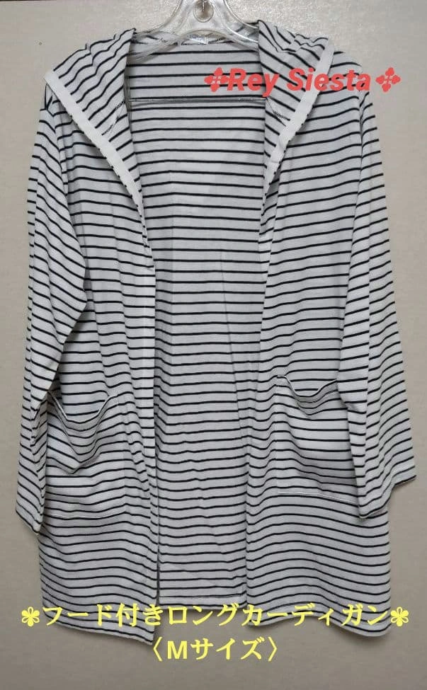【Rey Siesta 】UVカット フード付きロングカーディガン ボーダー〈Mサイズ〉✰ ●バスト 79〜87cm、身長154〜162cm ●素材...ポリエステル65%、綿35% ホワイトとネイビーのボーダーデザインのフード付きロングカーディガンで、サイドスリット付きで動きやすいです。 - デザイン: ボーダー - カラー: ホワイト・ネイビー - スタイル: フード付きカーディガン - ディテール: サイドスリット こちらは、3年くらい前にオンラインショップで購入しました。 1回試着後、1回着用しましたが、似合わないので洗濯して保管していました。 2回しか着用していませんので、傷や汚れ、擦れなどはありません。 状態は新品に近いと思いますが、いかがでしょうか。 平置きサイズ:肩幅約44cm、袖丈約56cm、身幅約55cm、着丈約80cm 素人の採寸ですので、誤差はご了承ください。 中古品ですので、商品の状態をご理解頂ける方にお譲りしたいと思います。 ご検討宜しくお願い致します。 カラー...ホワイト系 素材...コットン 季節...春夏 #未使用に近い #レディース #フード付きロングカーディガン #Мサイズ #ホワイトネイビーボーダー #サイドスリット入り #ポケット付き