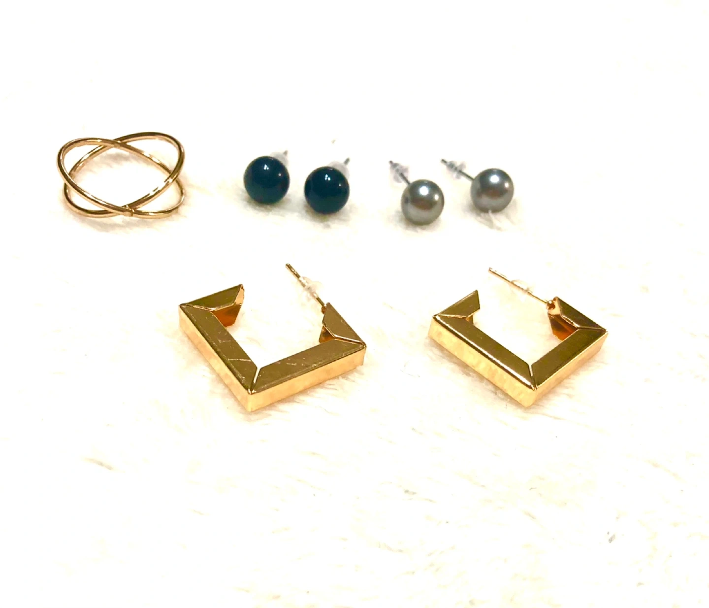 アクセサリーのまとめ売りです ・リング1点 ・スクエア型ピアス1点 ・丸型ピアス2点 ・カラー:ゴールド、ブラック、グレー 新品未使用