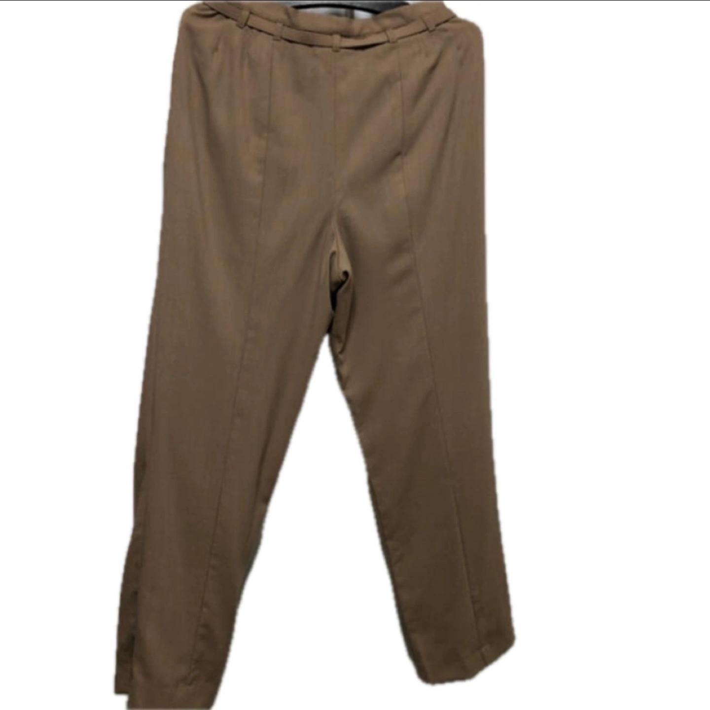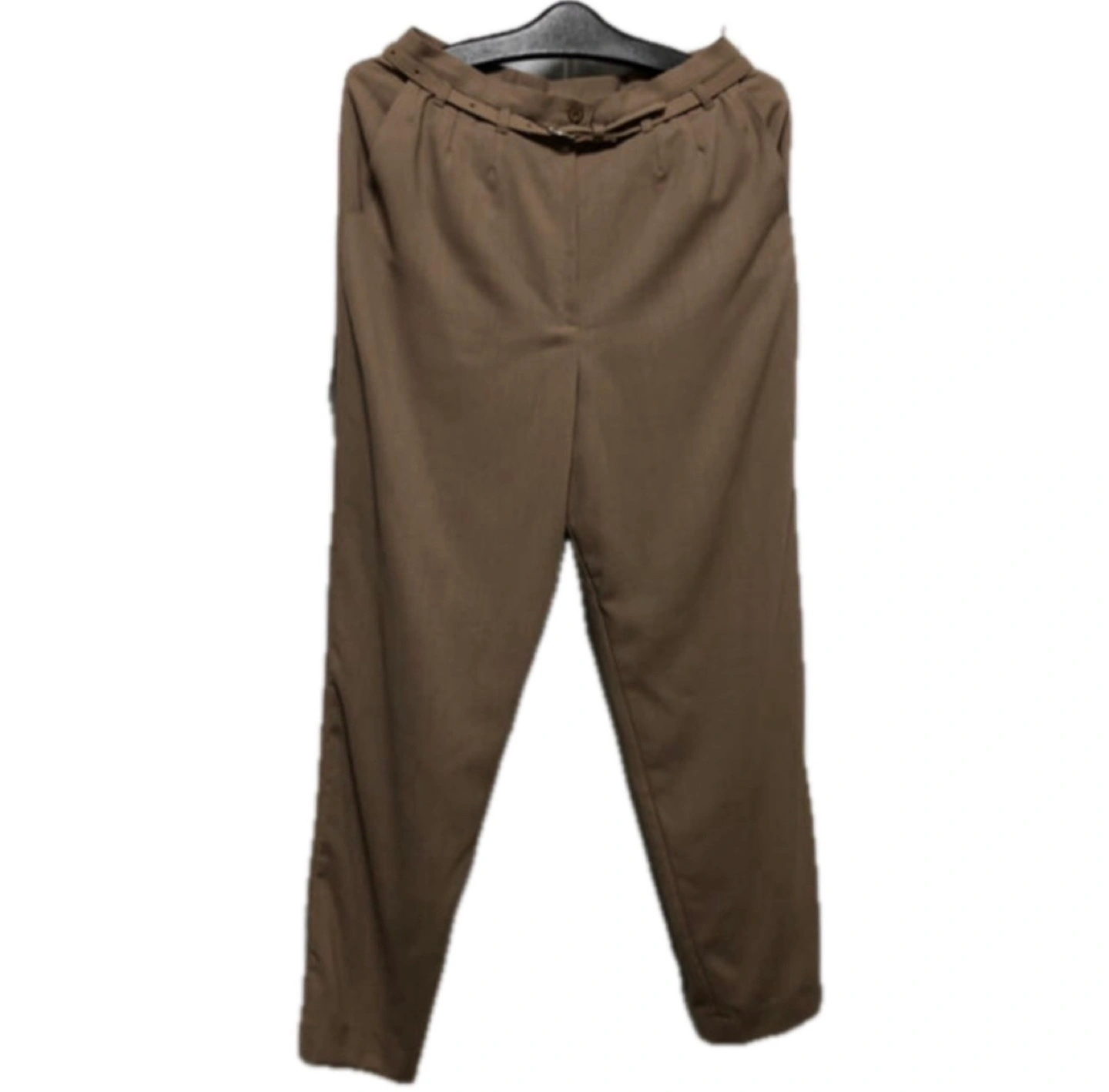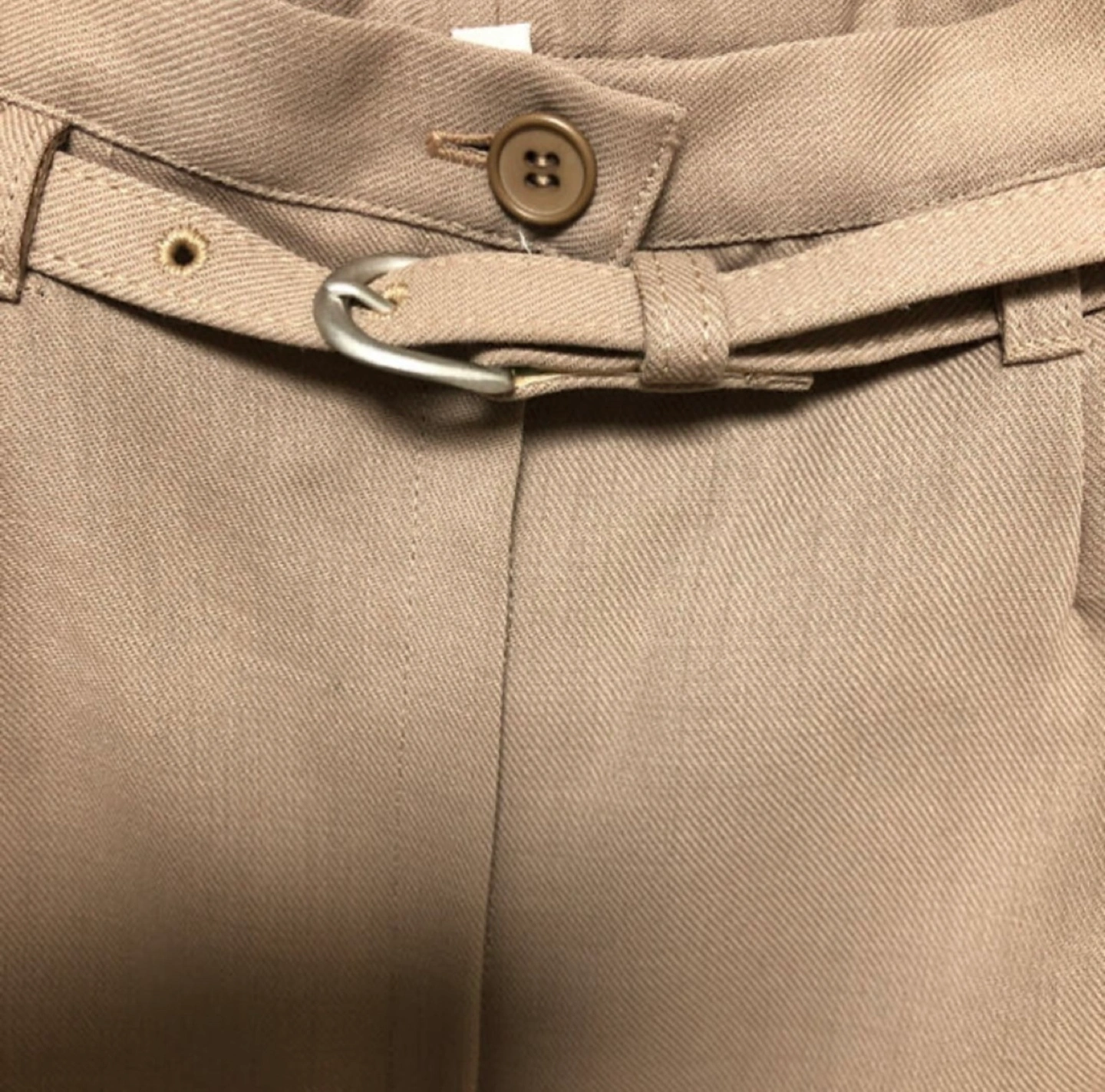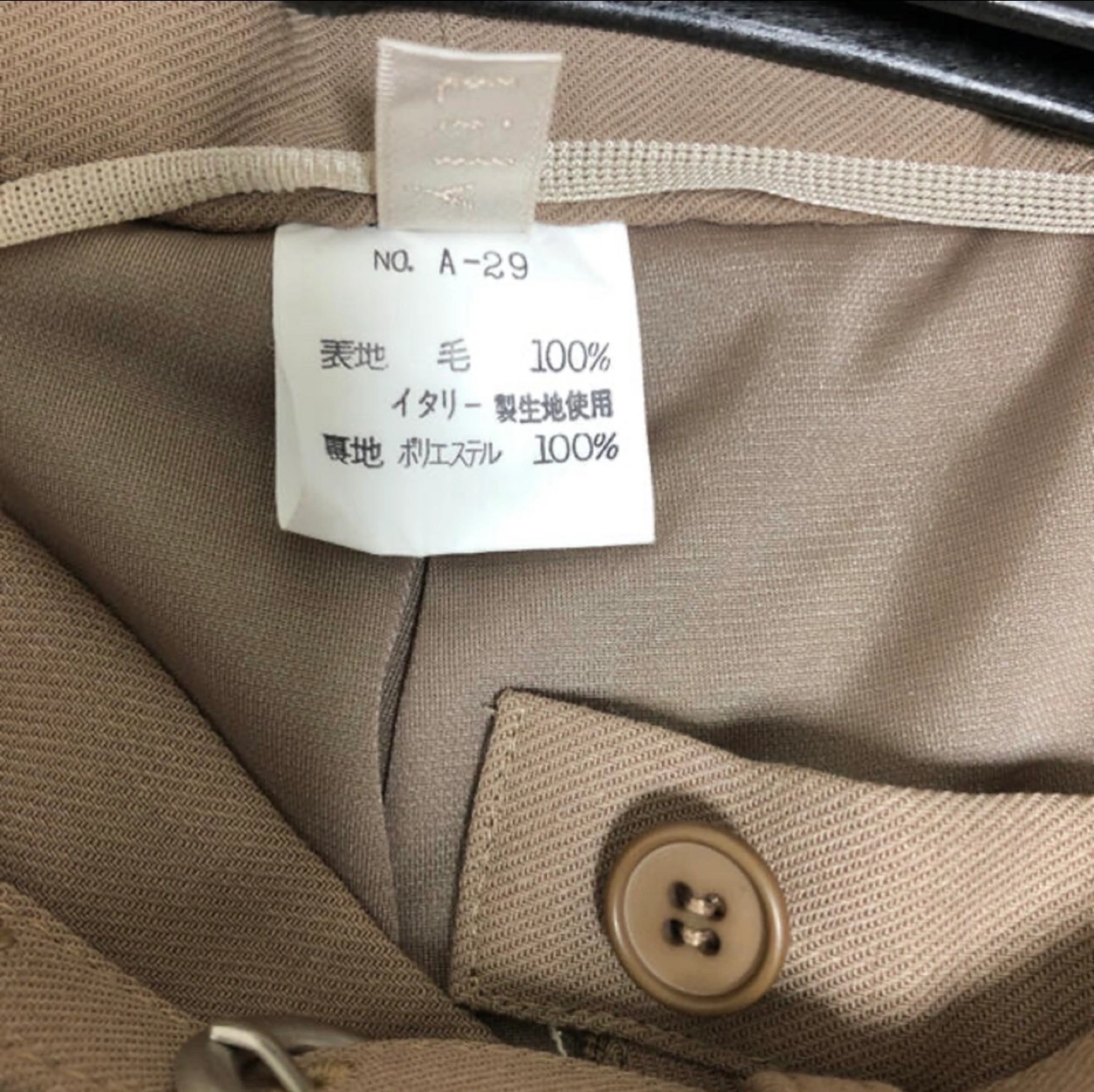 裏地も高級なウールパンツ ベルト付きです。綺麗な発色のウールです。 size:9(イタリア製ですので日本ですと11〜13号) 着丈102cm(オーダーの着丈の為にこの長さです。裾上げ 済み) ウエスト37.5cm 股上38cm サイズは大きいので日本ですと13号位かもしれません。 タグは捨ててしまいました。 カラー···ベージュ 丈···フルレングス 柄・デザイン···無地 素材···ウール シルエット···ストレート 股上···レギュラー 季節感···春季、夏季、秋季、冬季