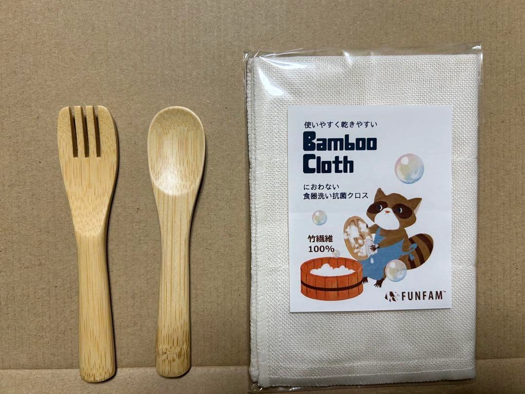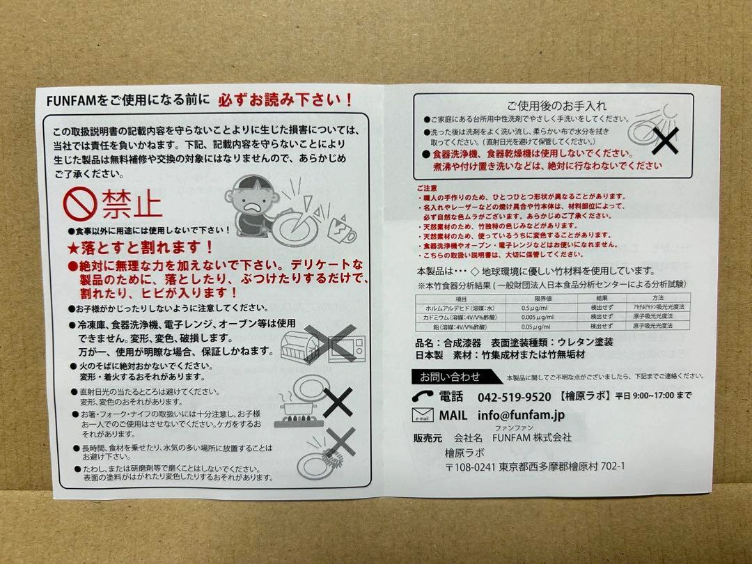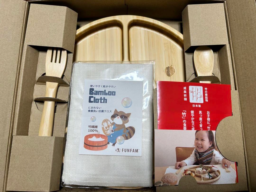 FUNFAM ファンファン  竹製 日本製 セット内容: プレート、スプーン、フォーク、お手入れクロス 撮影のため箱から出しました。 未使用ですが中古品にご理解ある方のみご検討をよろしくお願い致します。 その他ベビー用品出品しております☺︎