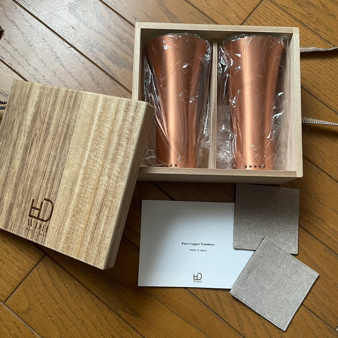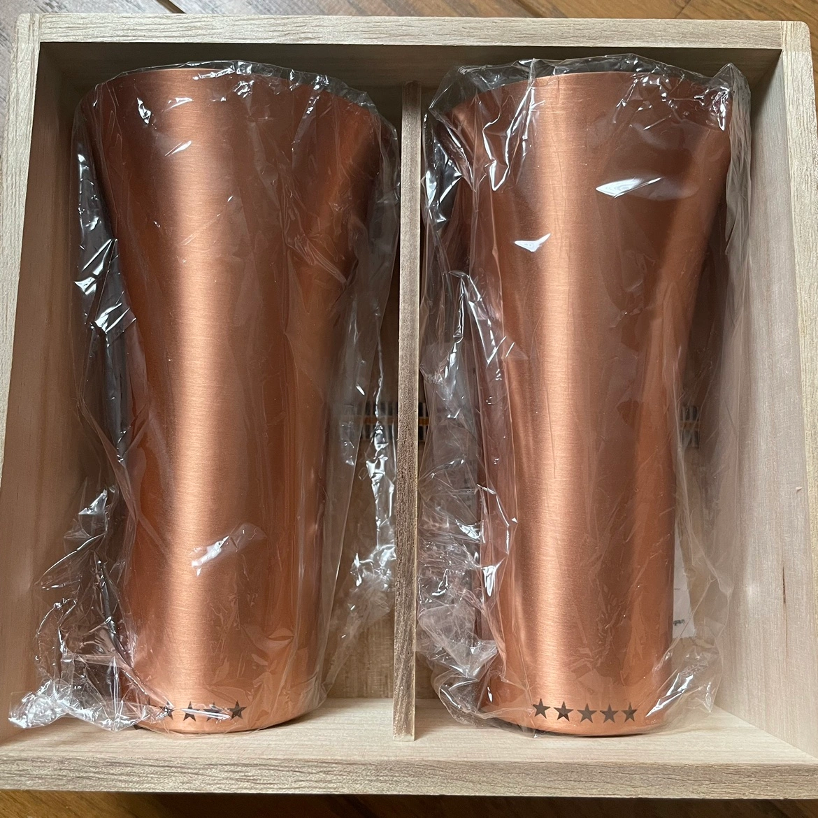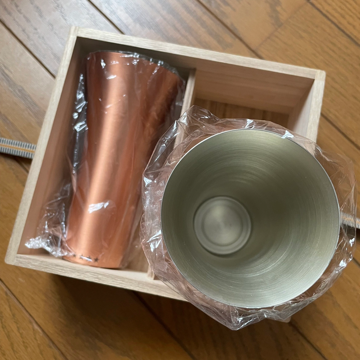 ・麻のコースター2個付 ・定価 13,200円 ・サイズ:約径80×高さ150mm ・容量:約380ml 公式サイトより ↓↓↓ 金属加工産地として名高い、新潟県燕市において 職人の手で一つ一つ丹誠を込めて製造された made in Japan。 ビールを注いだ際にきめ細かくクリーミーかつ 理想的な泡立ちになるよう、特殊な磨き加工。 形状は口当たりを良くする為に口部分が 広がっており、 缶ビール(350ml)1本分が 入る容量に設計。 『純銅』は99.95%以上の純度を誇り 経年変化によって独特な色艶へと変わっていく 古くから親しまれている趣のある素材。 銅は他の金属に比べ熱伝導率が高く 冷たい飲み物を注いだ瞬間から本体が 同じ冷たさへと変化し保温性もある為 口当たりや手から伝わる清涼感が楽しめます。 また、銅には水に混ざると『微量金属作用 (銅イオン作用)』という抗菌・殺菌作用を 発揮する力があるため、食器やグラス タンブラーに適しています。 桐箱と真田紐をあしらった専用のボックス入り なので、そのままギフト・贈り物にも。 素材···銅 グラス/カップ/酒器···ペア(2つ)