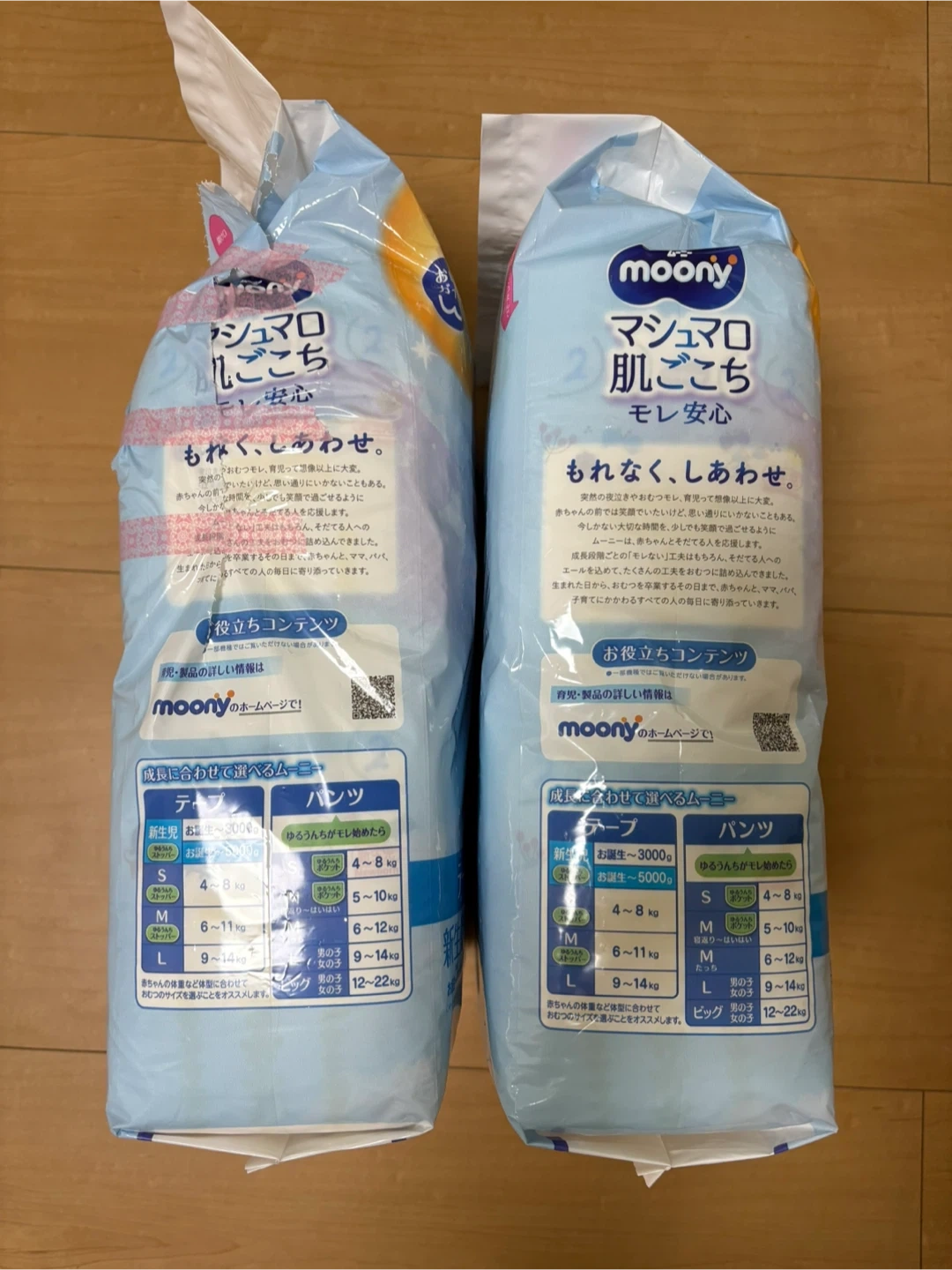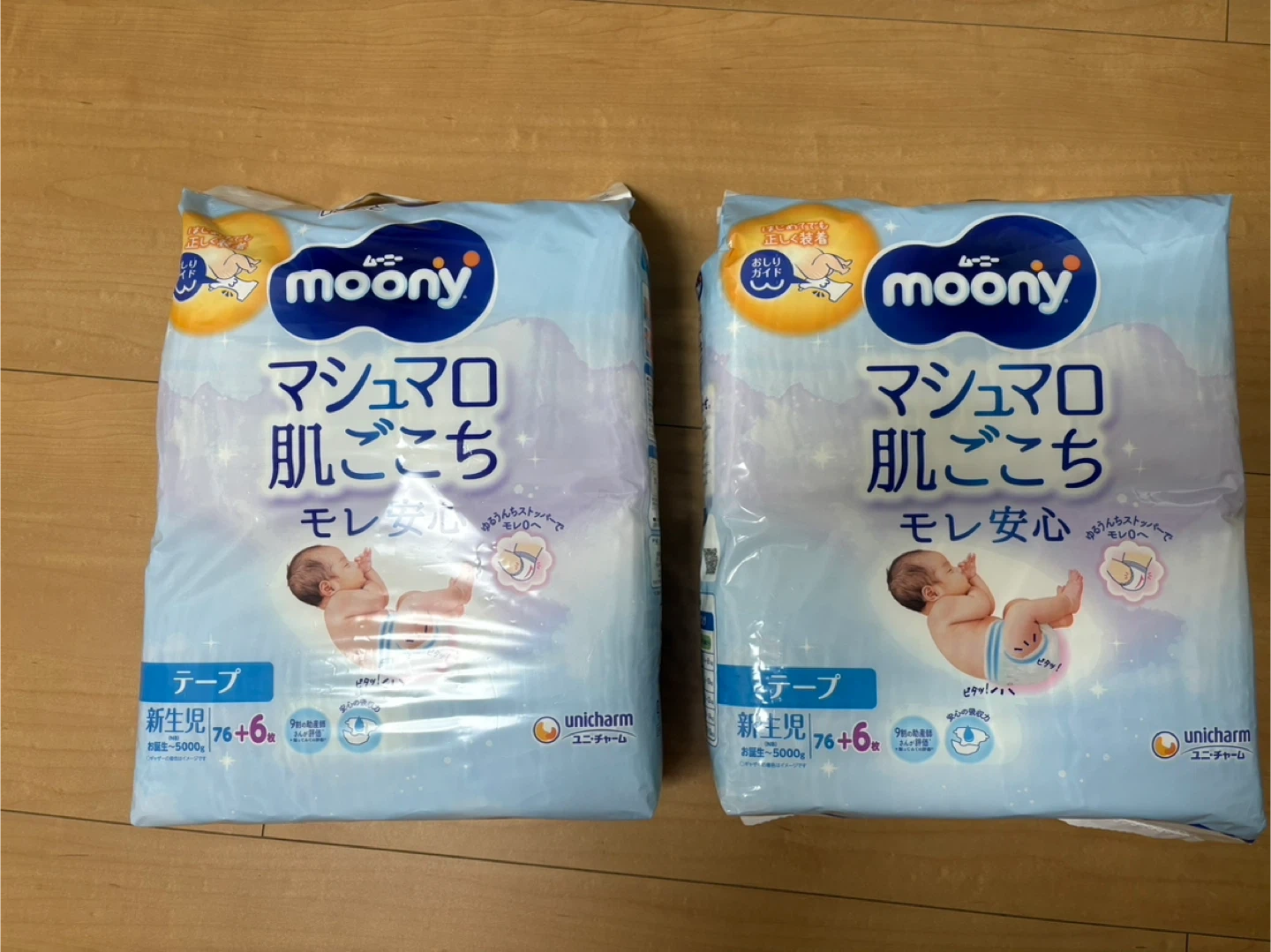 ムーニーの新生児用テープおむつです。 【情報】 ブランド:ムーニー 種類:テープおむつ サイズ:新生児用(お誕生~5000g) 枚数:76枚 + 6枚増量 ▶︎1パックは未使用、もう1パックは2枚程度使用 定価:2つセットで3370円 購入時期:2025年9月 【状態】 ※1パックは新品未開封です。もう1パックは、2枚程度使用しているため、開封済みです。 ※1パックは開封しているため、商品の状態を『未使用に近い』としております。 自宅保管であることをご了承いただけますと幸いです。
