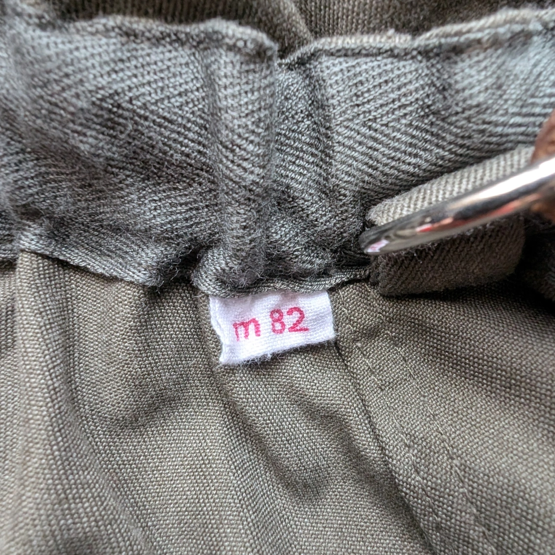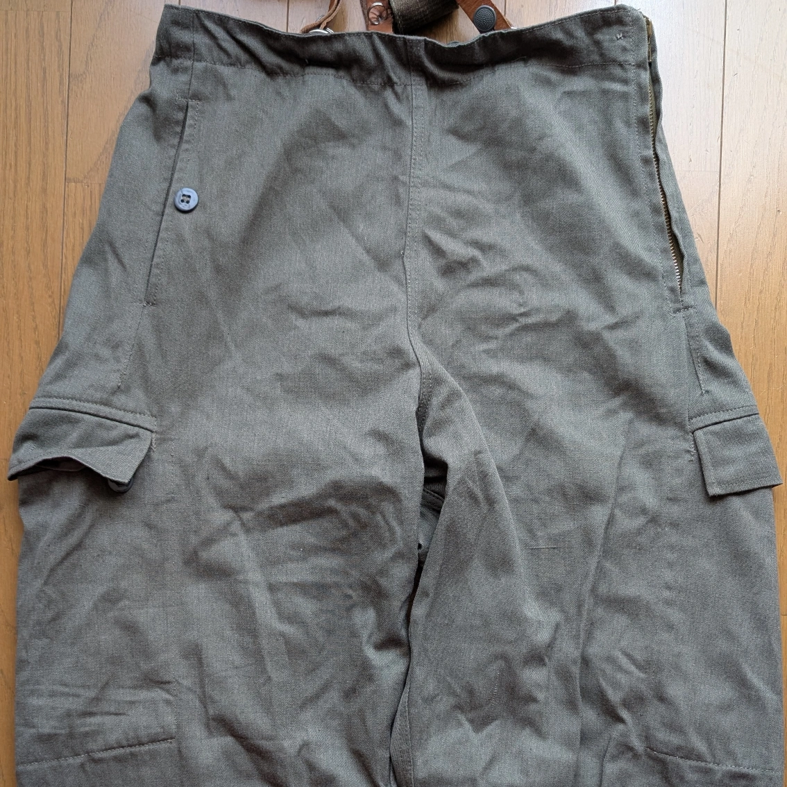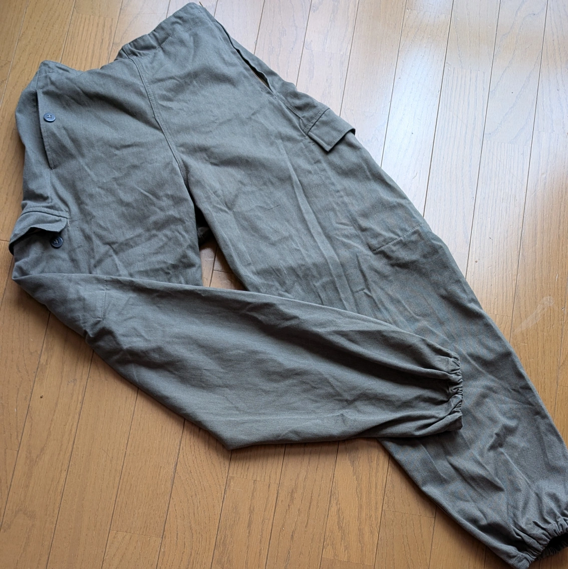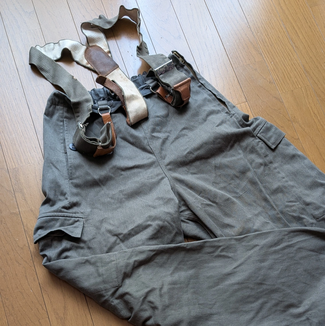 以前古着屋で購入したミリタリーのサスペンダーパンツになります。 なかなか今の服にない雰囲気があってお気に入りでしたが似たパンツ購入したため出品します。 ~以下購入時のサイト情報引用~ 【ブランド】Euro military(ユーロミリタリー) 【カテゴリ】メンズ パンツ その他パンツ 【アイテム】東ドイツ軍 NVA タンカースパンツ コンバットパンツ Extra Stark ベルト付き 【表記サイズ】 m82 【参考サイズ】 【実寸】ウエスト34cm 股上44cm 腿幅34cm 股下75cm 裾幅10cm 【素材】製品表示なし 【色】緑系 【状態詳細】ベルトに汚れ、劣化がございます。 【特徴】MDL 1879 【年代】70S 【丈】10分丈ロング(マキシ)