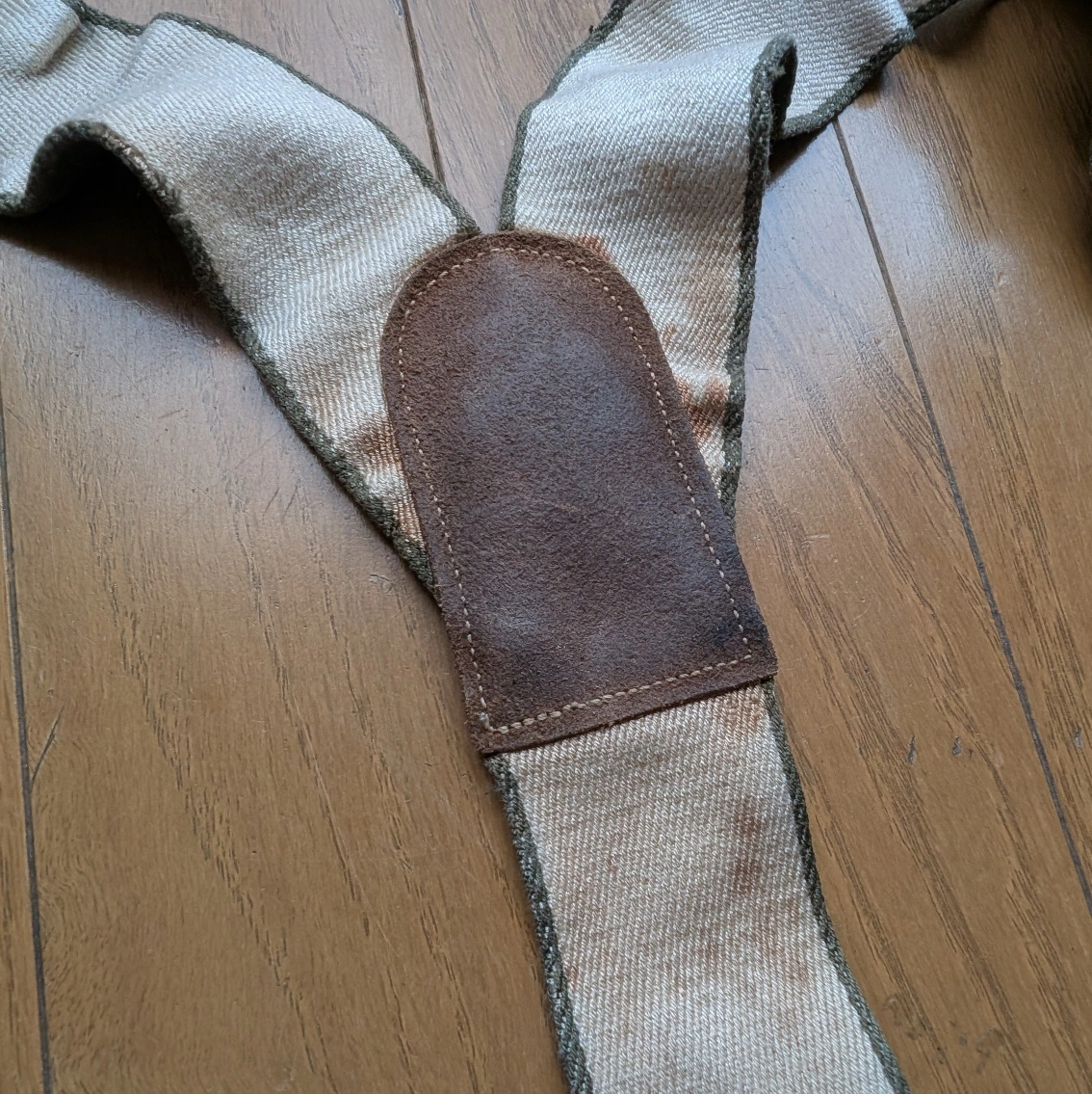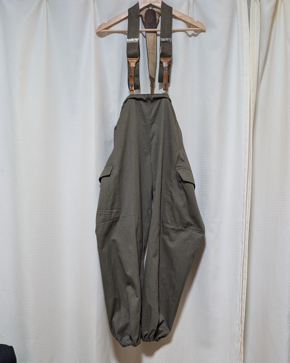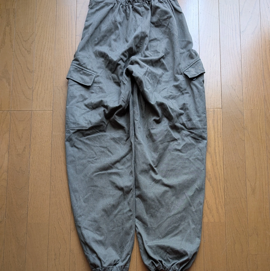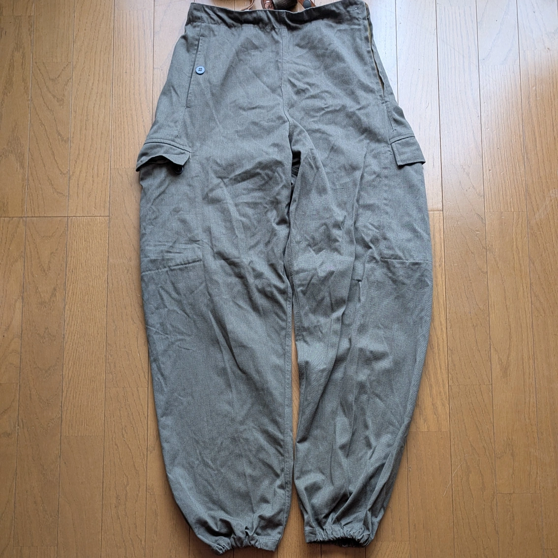 以前古着屋で購入したミリタリーのサスペンダーパンツになります。 なかなか今の服にない雰囲気があってお気に入りでしたが似たパンツ購入したため出品します。 ~以下購入時のサイト情報引用~ 【ブランド】Euro military(ユーロミリタリー) 【カテゴリ】メンズ パンツ その他パンツ 【アイテム】東ドイツ軍 NVA タンカースパンツ コンバットパンツ Extra Stark ベルト付き 【表記サイズ】 m82 【参考サイズ】 【実寸】ウエスト34cm 股上44cm 腿幅34cm 股下75cm 裾幅10cm 【素材】製品表示なし 【色】緑系 【状態詳細】ベルトに汚れ、劣化がございます。 【特徴】MDL 1879 【年代】70S 【丈】10分丈ロング(マキシ)