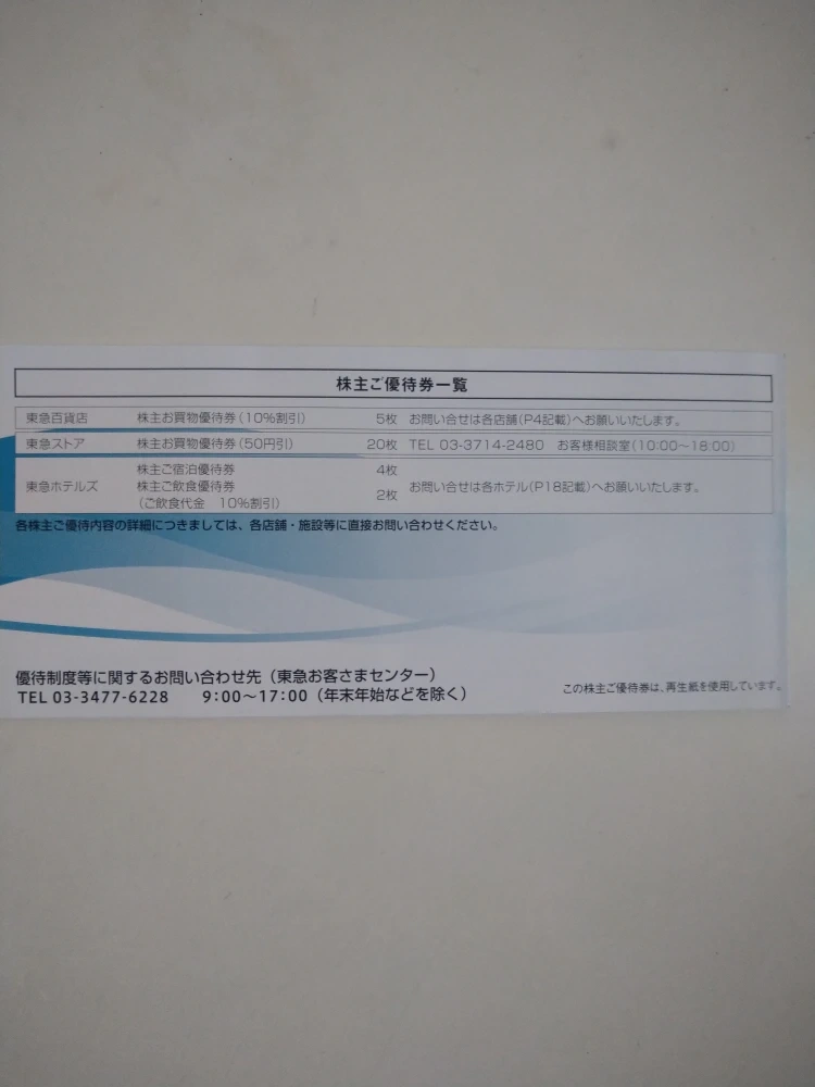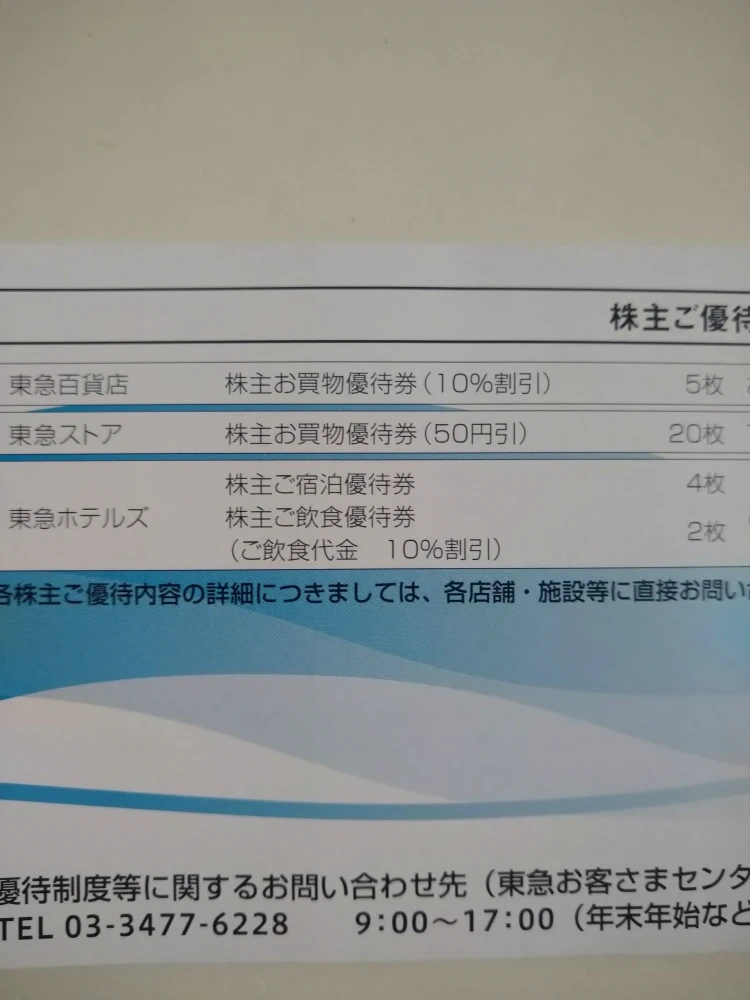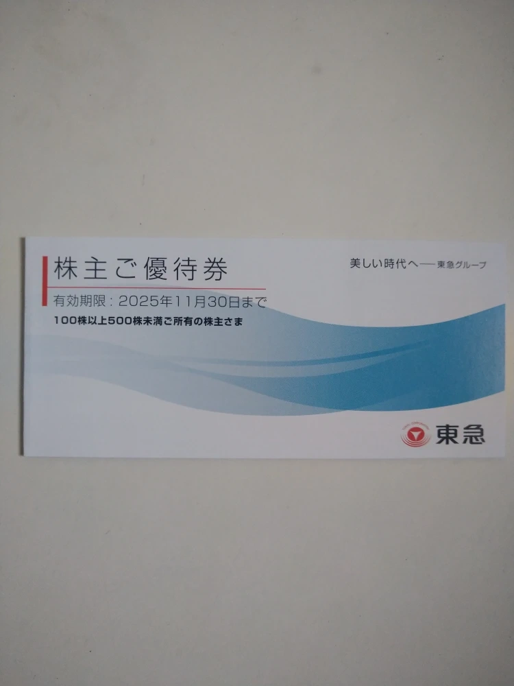 ・株主ご優待券 ・有効期限:2025年11月30日まで ・東急百貨店 株主お買物優待券(10%割引)5枚 ・東急ストア 株主お買物優待券(50円引)20枚 ・東急ホテルズ 株主ご宿泊優待券 4枚 ・東急ホテルズ 株主ご飲食優待券 2枚
