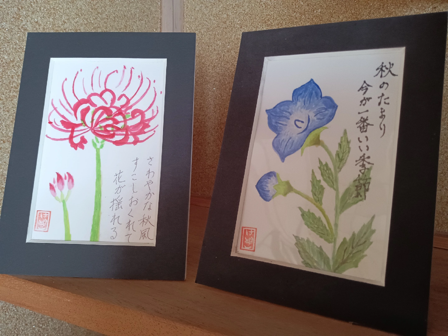 フレーム入りの水彩画2点セットです ※何か同時購入して下さった方に差し上げます。 絵手紙を習っていた母が作品展のために購入したフレームです。裏面に記名がありますので消してお渡しします。 もし水彩画は不要でしたら外しますのでお申し付け下さい。 作品展後、そのまましまい込んでいた物になります。 ・絵柄:彼岸花、桔梗 ・フレーム色:黒 ・状態:良好 中古品であることご了承ください
