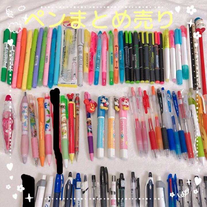 ご覧頂きありがとうございます❣️ 水性カラーペン、ボールペン 蛍光ペン、シャープペン、えんぴつなど 全部で70点です‼️ 昔使っていた物や、かなりレトロな物 レギュラーな物など様々です❣️ 画像よりなくなった物、出が悪くなり 1番上のペンが数本減っています。 m(__)m 全て確認はしましたが、太、細のペンや三色の物は一部出にくくなっているのがあったりします。また時間とともに出なくなっている可能性もありますので、そこのところをご理解頂ける方にお願いします。