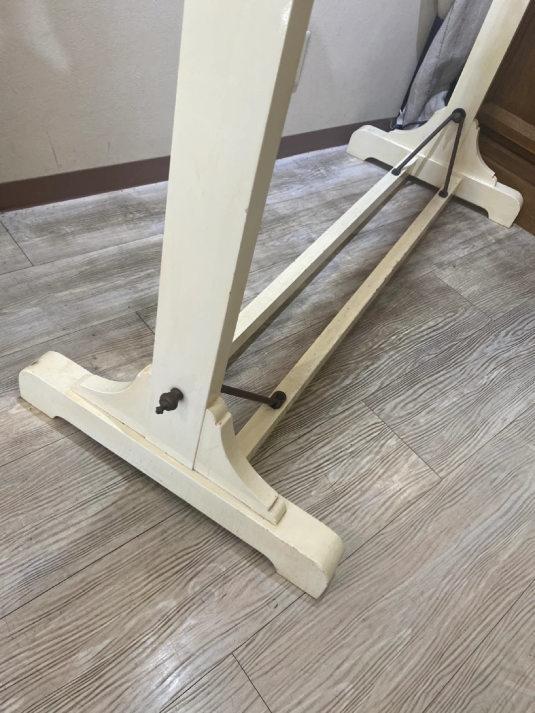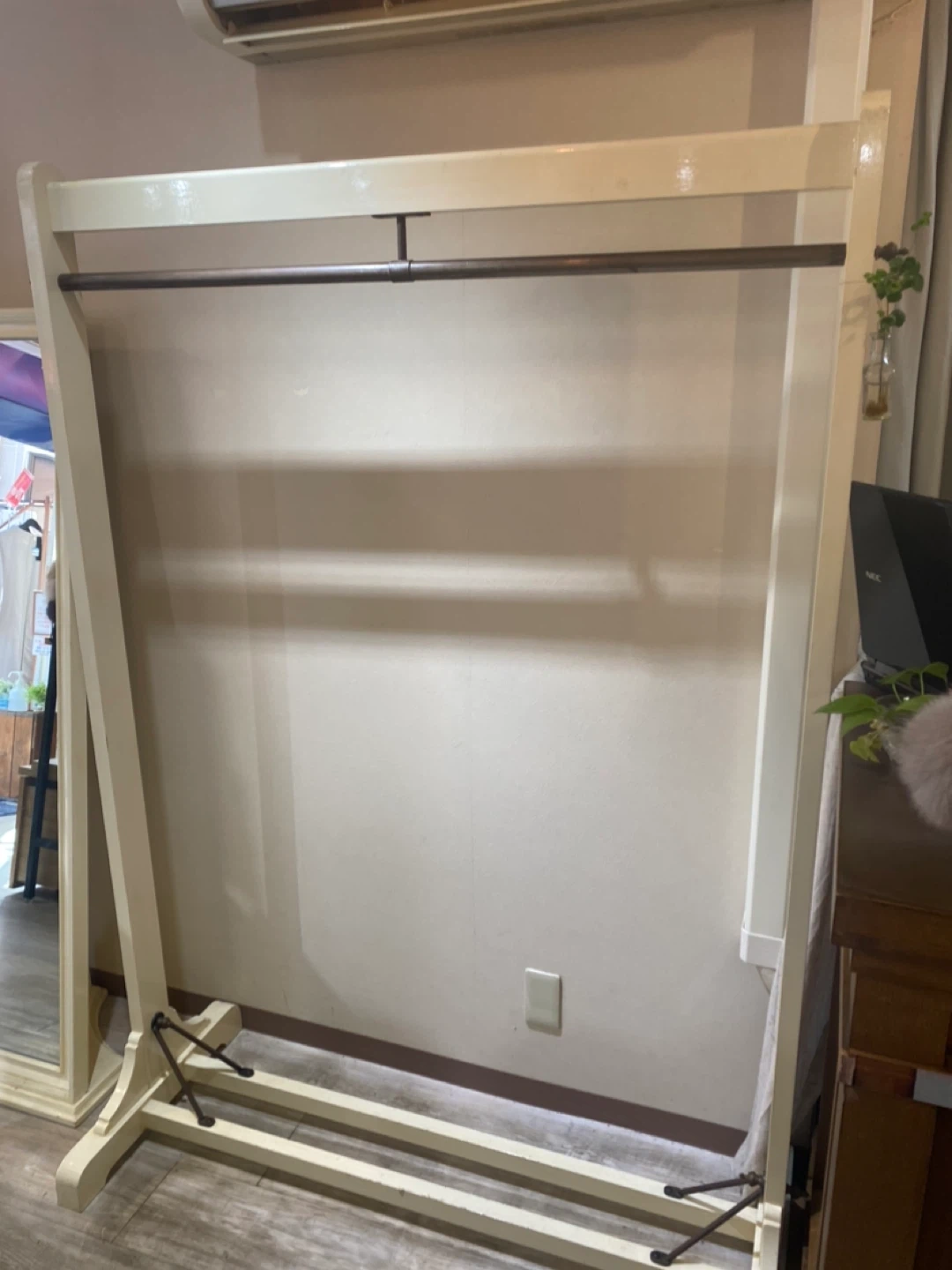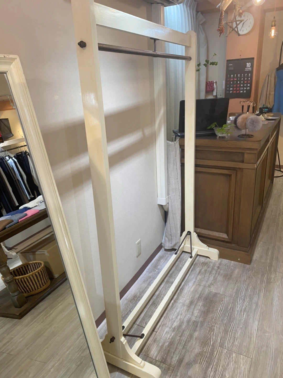 アパレル店舗で使用しています洋服を掛けるハンガーラックです。 特注品です。 白木のフレームにポール部分はシンチユウです。 磨くとメチャメチャ綺麗です。 女性でも持ち上がるくらいなので、それほど重たくはありません。 同じ物が6台ございます。(おまとめ頂ければお安く致します) ご相談下さい。 サイズは 幅 1200 高さ 1730 奥行き 土台部分で500 11月9日までに取りに来られる方にお願いしたいと思います。