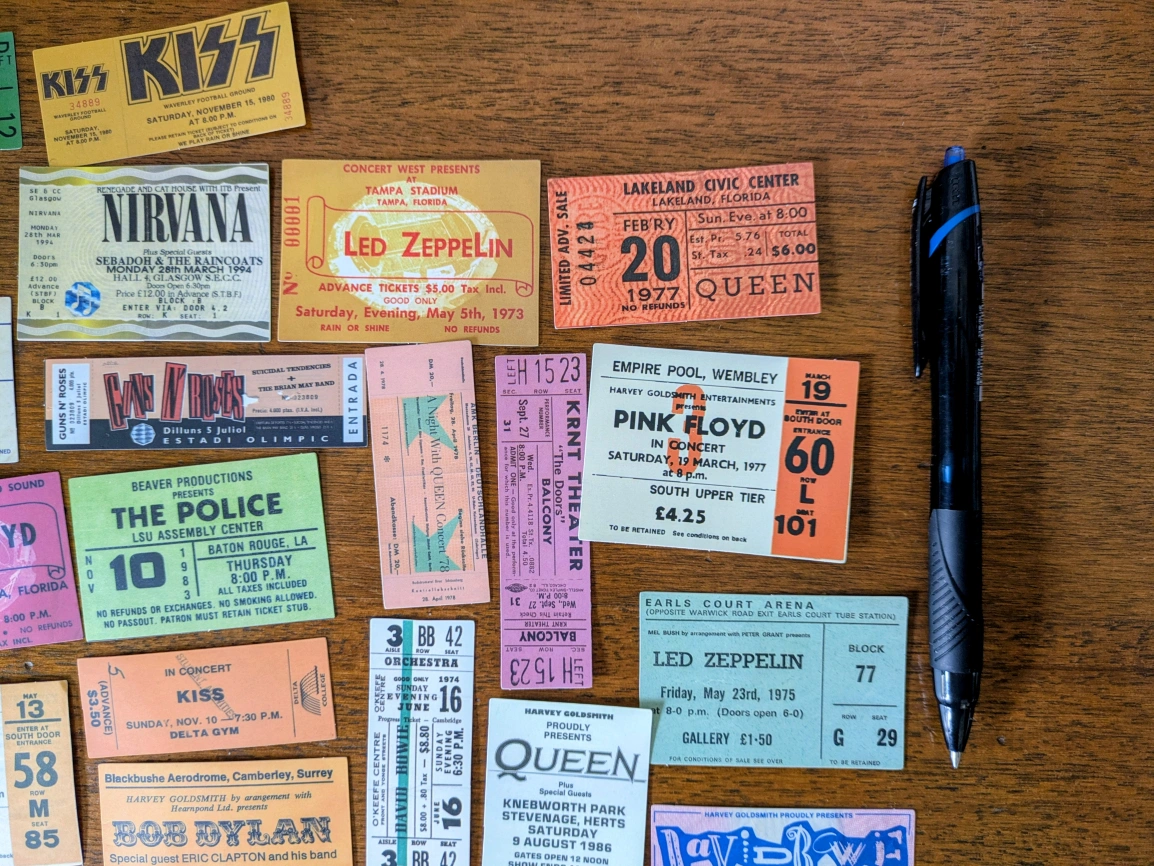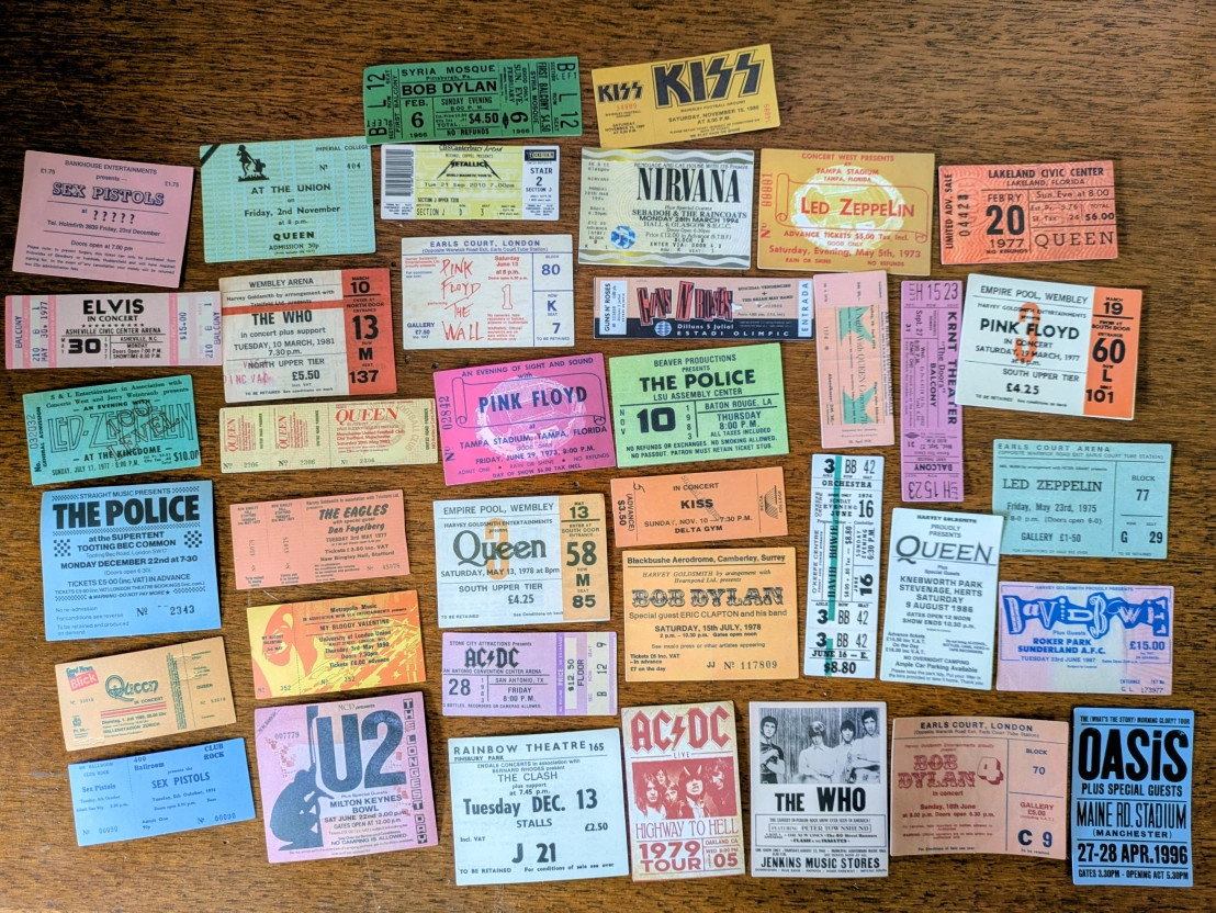コンサートチケットのデザインのステッカーのセットです。 ボフディラン、クイーン、ポリス、フー、レッドツェッペリンなど様々な種類があります。 (ビートルズは使ってしまったのでないです) サイズは、一番大きいもので、5cm×4cmくらいです。 中古品であることご了承ください