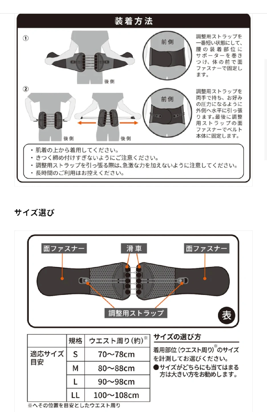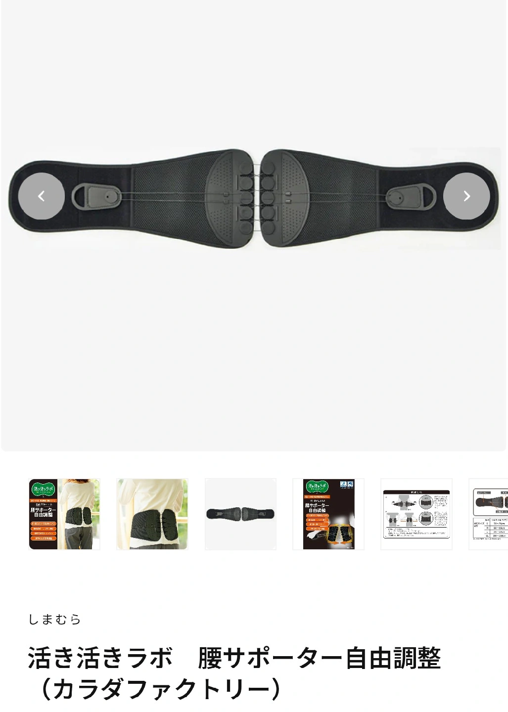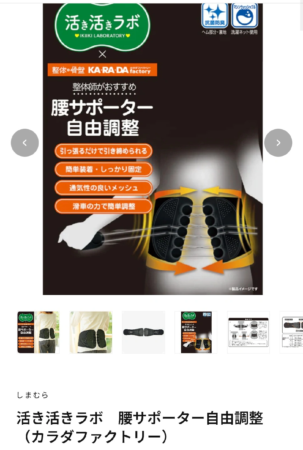 活き活きラボ×カラダファクトリーの腰サポーターです。 【情報】 ブランド:しまむら 活き活きラボ 商品:腰サポーター サイズ:S 【状態】 購入後に一度、服の上から着用してみましたが、サイズが合わなかったため出品いたします。 箱はあり、破れたりはしておりませんが、開封時のテープがうまく剥がれず、綺麗には残せておりません。