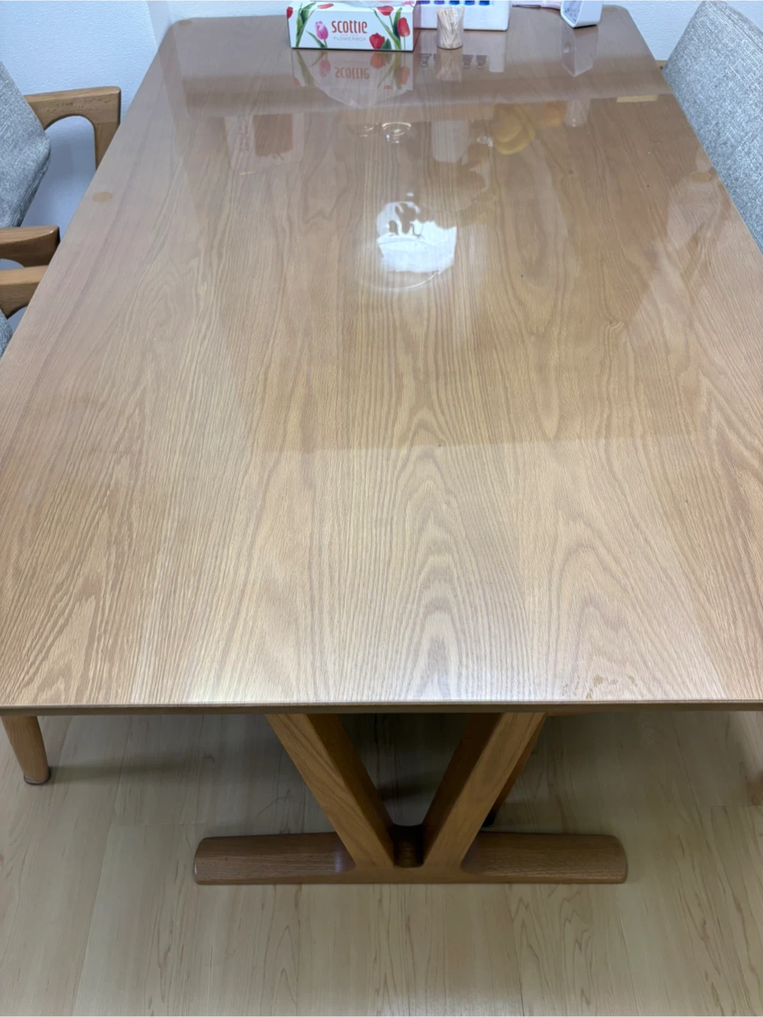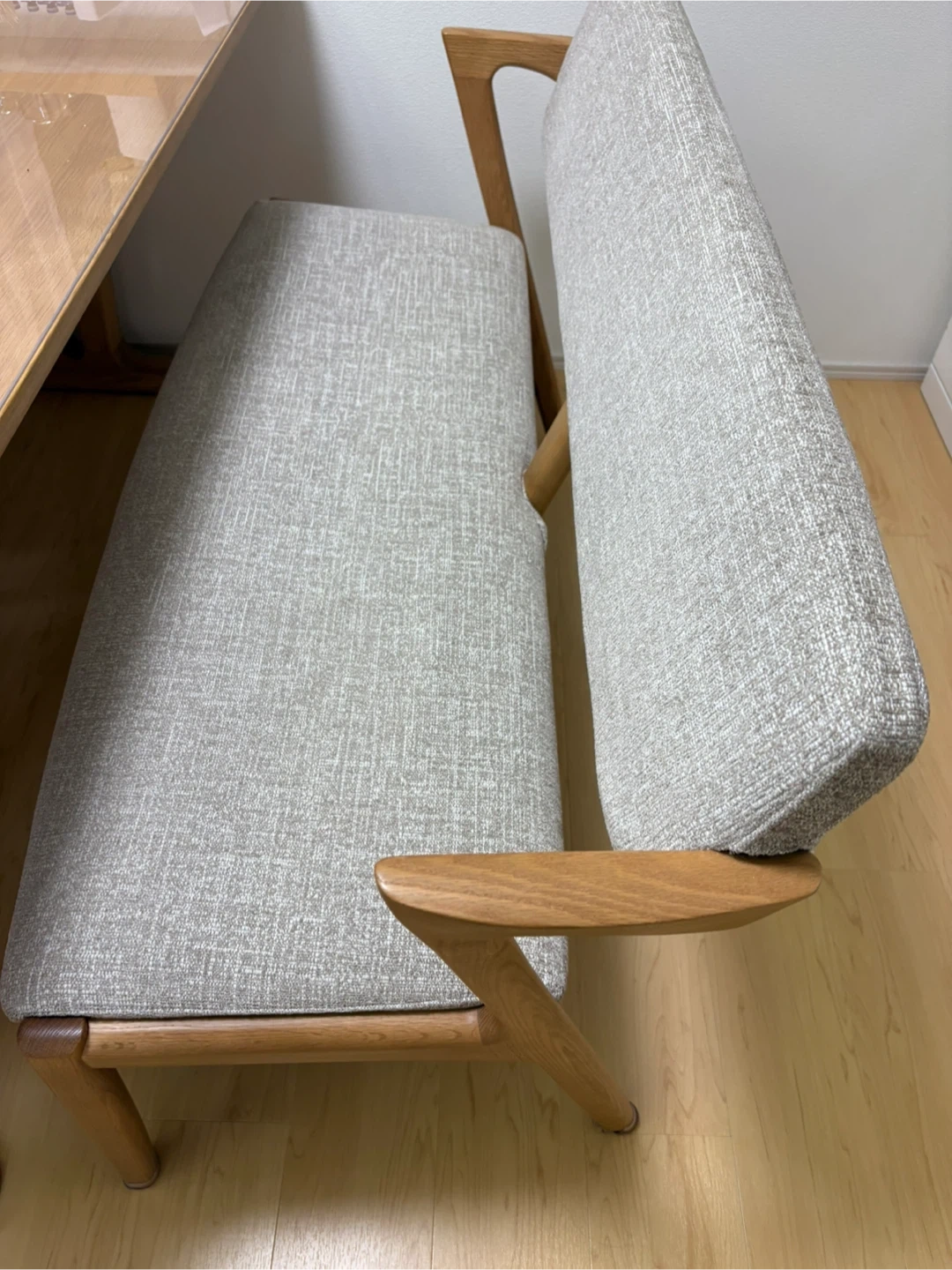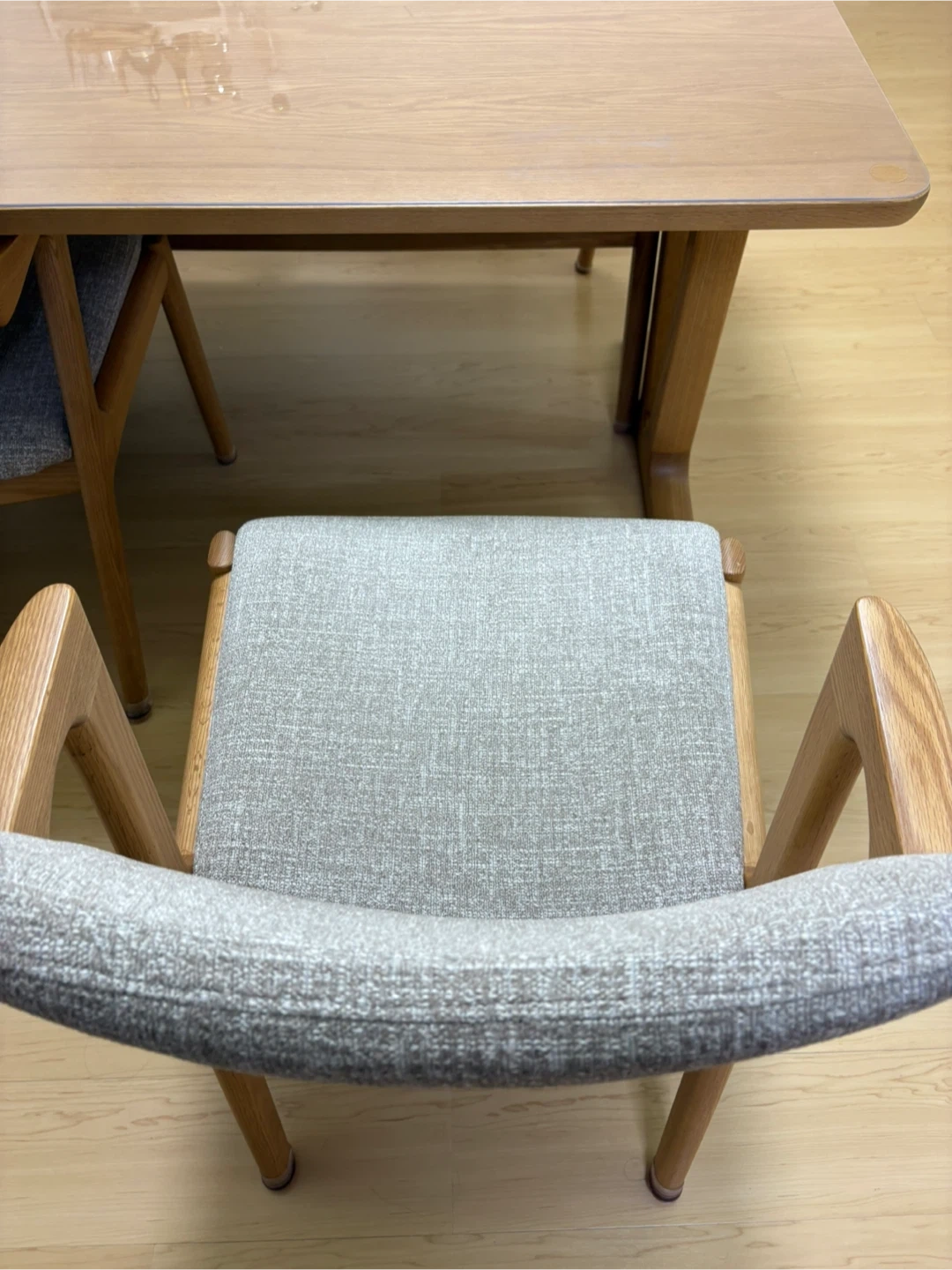 木製のモダンなダイニングテーブルとグレーの布張り椅子のセットです。 家具メーカー【浜本工芸】の東京インテリア家具限定モデル。 2025年6月納品。43万でセット購入しました。急な海外転勤のためお譲りします。 オーク無垢材を使用した高級感のあるデザイン。和風モダンな雰囲気と落ち着いた色合いです。 脚の取り付け位置も2パターンから選択でき、チェアの形状や使い方に合わせて変更できます。 傷、汚れ、熱に強いUV塗装を天板に施しています。 - テーブルの素材: 木製 - テーブルのデザイン: モダンなデザイン - 椅子の素材: 布張りのクッション - 椅子のデザイン: シンプルでスタイリッシュ - テーブルの形状: 長方形 - 椅子の色: グレー - テーブルの脚のデザイン: V字型の脚 特徴···完成品 利用人数···4人向け 利用人数···5人向け 天板の形状···角型 ご希望の方はお気軽にご連絡ください。