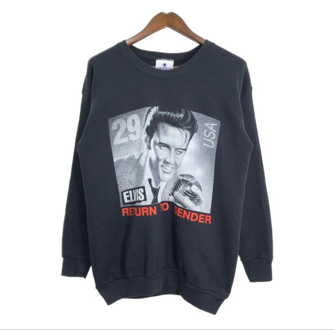 ロックンロールの「キング」、エルヴィス・プレスリーの90年代ヴィンテージスウェットです。 名曲「RETURN TO SENDER」の文字とエルヴィス記念切手をモチーフにしたアートワーク。 USA製、POSTMARK SPORTSWEARタグ付き。 サイズはONE SIZE FITS ALL(実寸L〜XL相当)。 状態:全体的な毛羽立ちと、裾にスレ・キズがあります。 詳細情 報 | アイテム名 | エルヴィス・プレスリー 切手デザイン スウェット | | 年代/生産国 | 90年代 / USA製 (Made in U.S.A.) | | 色 | ブラック (黒) | | 素材 | 表地:コットン 100% | | 表記サイズ | ONE SIZE FITS ALL(実寸L〜XL相当) | | 実寸(平置き cm) | 肩幅:約57 / 着丈:約68 / 身幅:約55 / 袖丈:約55 | | 状態 | 毛羽立ち、裾にスレ・キズあり。 ご不明点はお気軽にお問い合わせください。