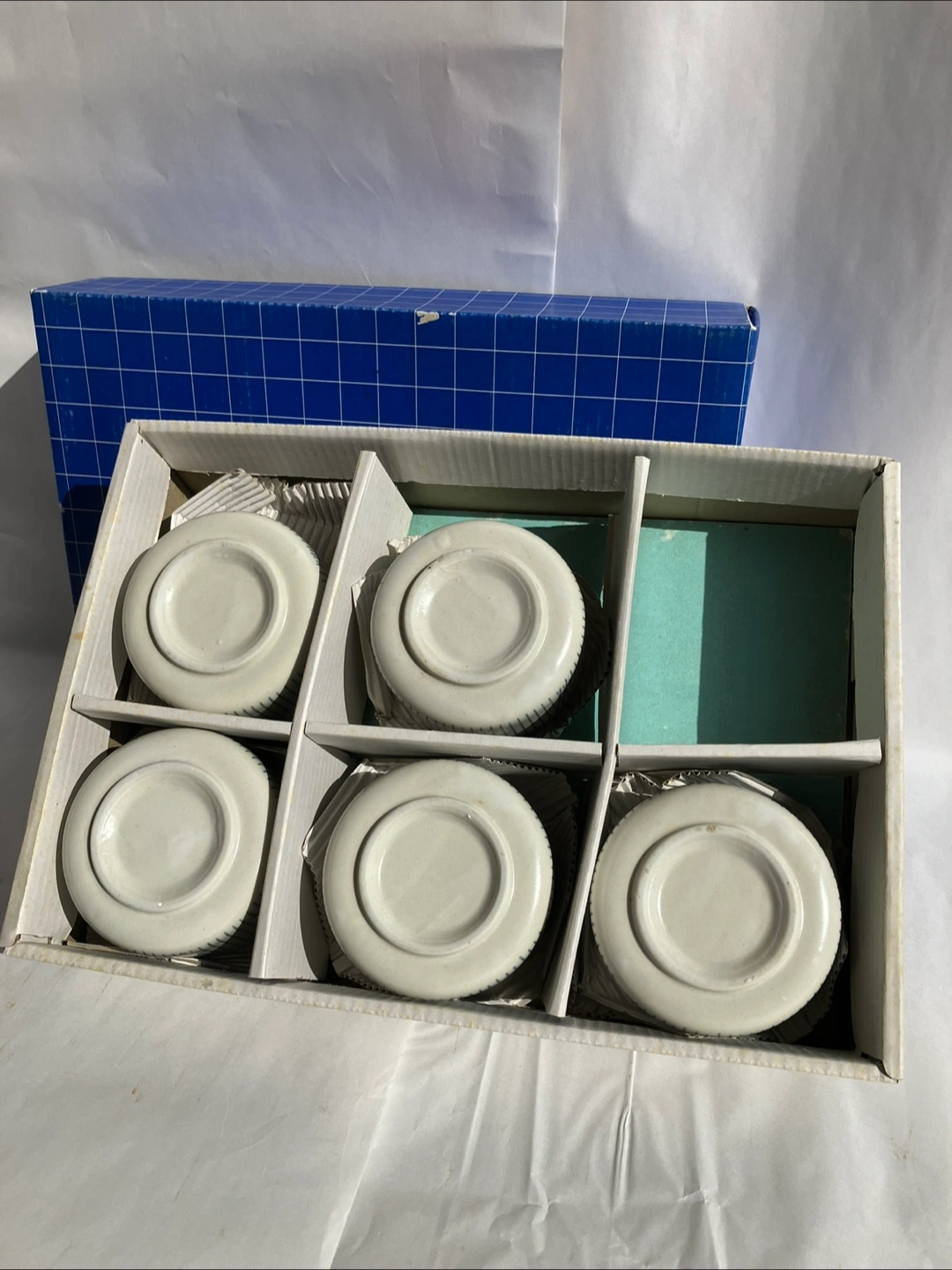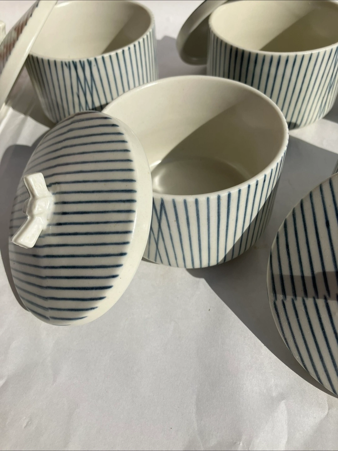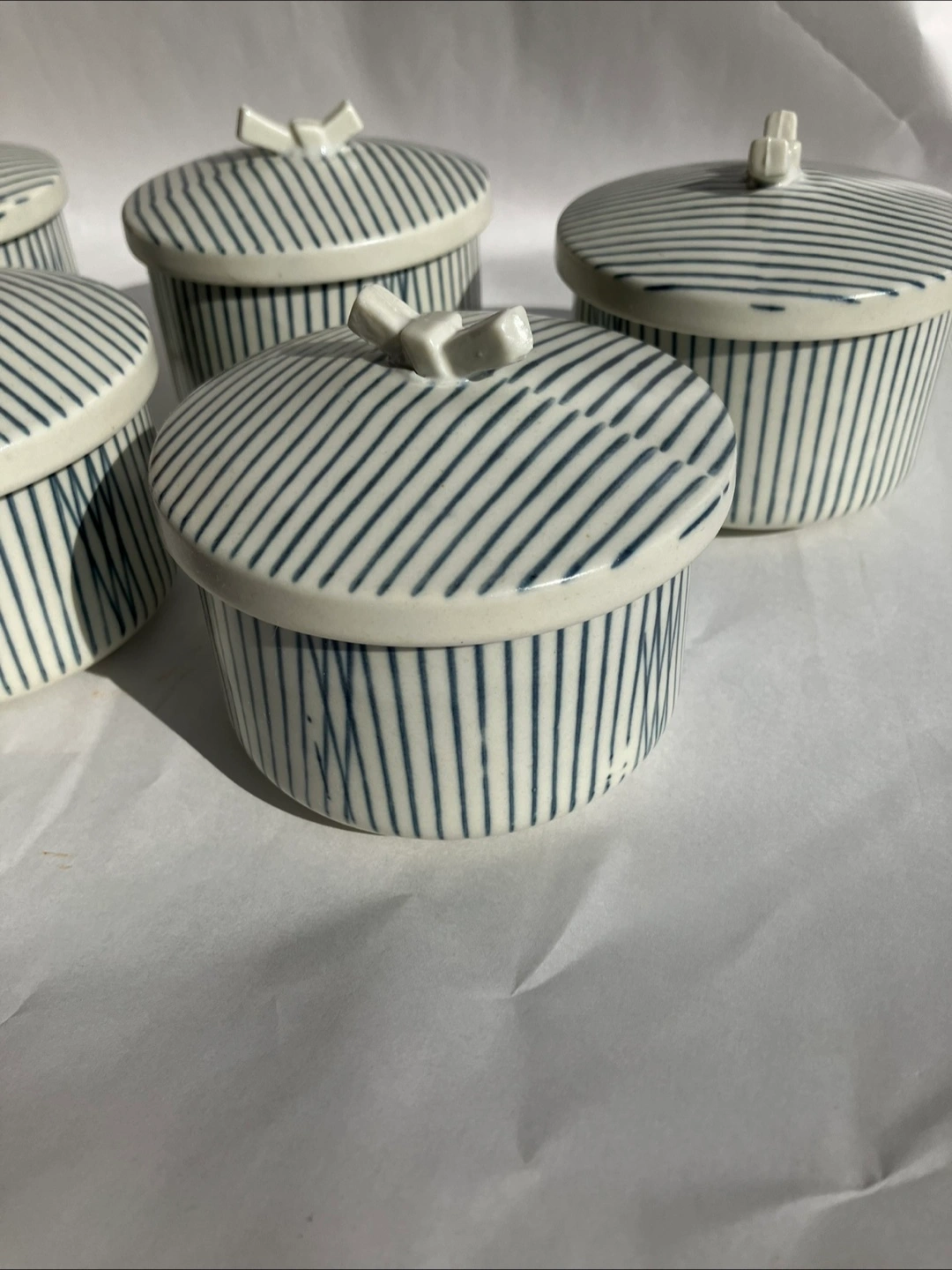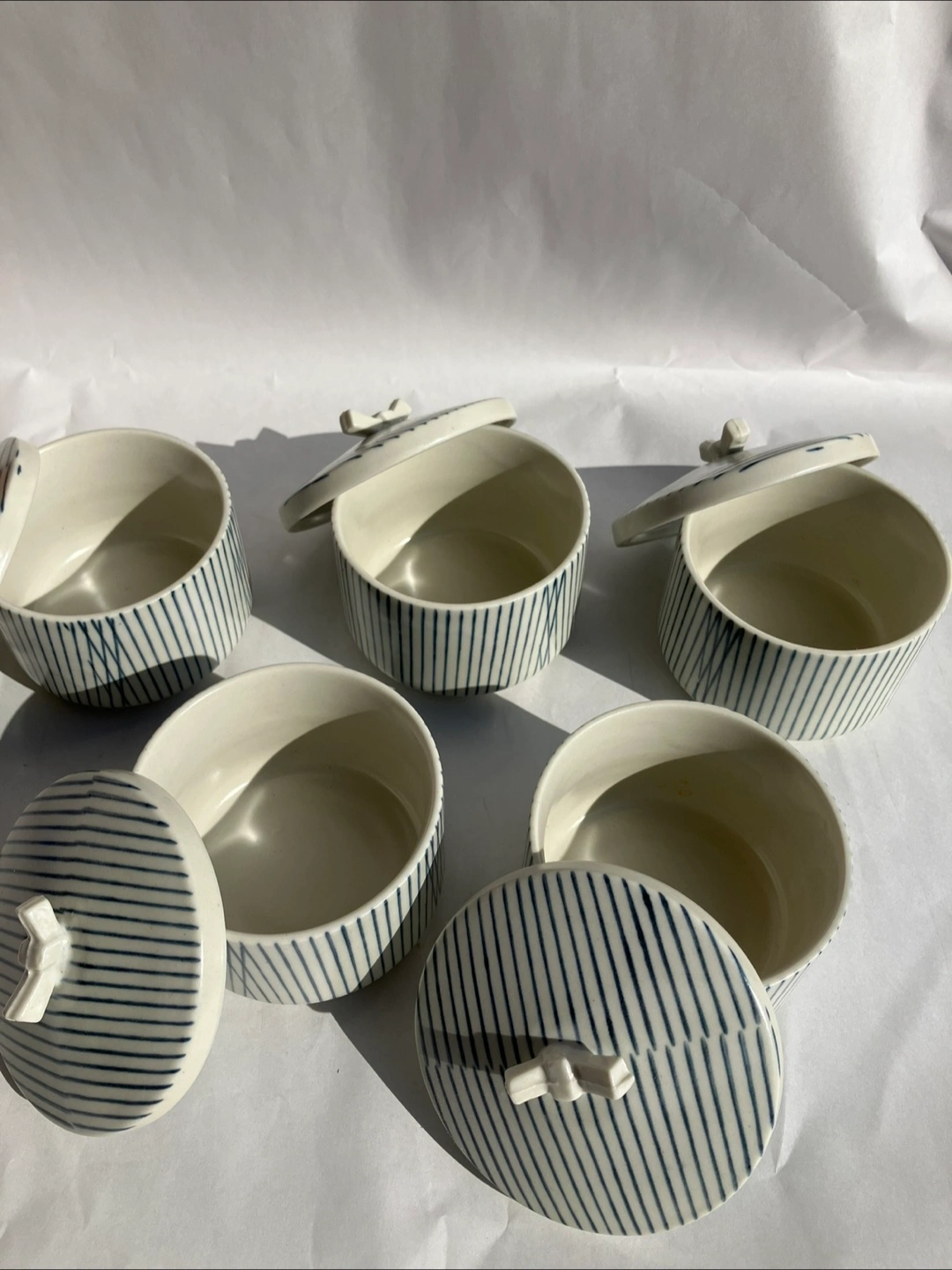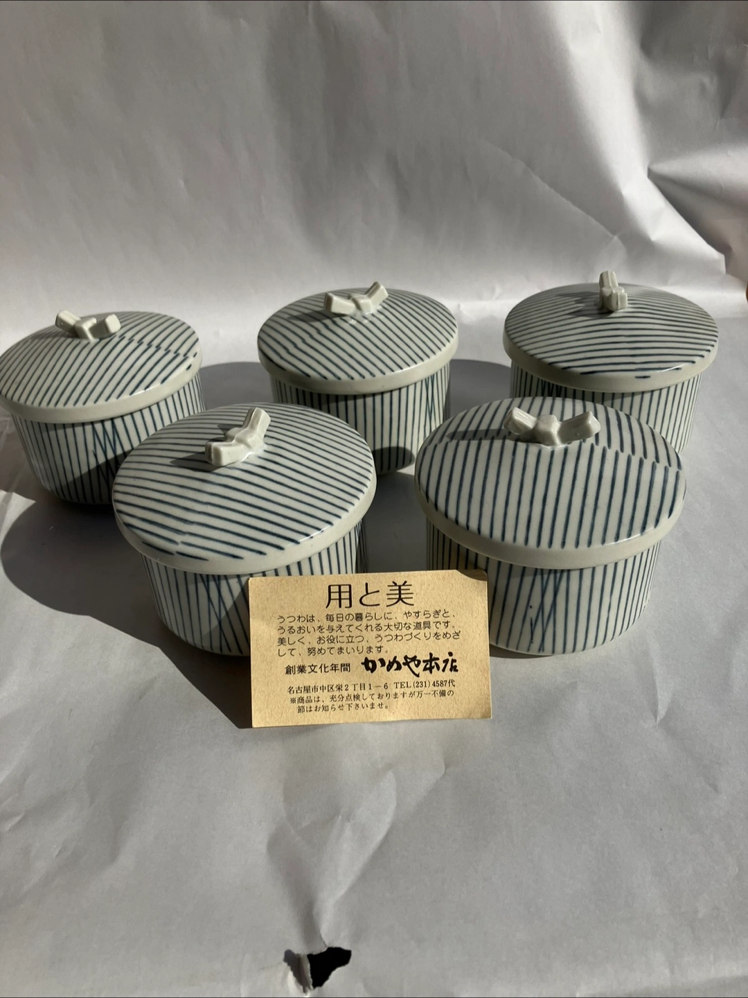 名古屋瓶屋特製 蓋付 小鉢5点セットです。 未使用品ですが、長期保管の為、薄汚れが ある場合がごさいますので、神経質な方は お控え願います。 箱はありますが、シミ、破れが ございます。 6個セットでしたが、1個欠品しております。 サイズ 直径9.5cm 高さ6.5cm 他にも引っ越し整理で色々出品しております。 複数のお取引で割引いたします。 どうぞお問い合わせください